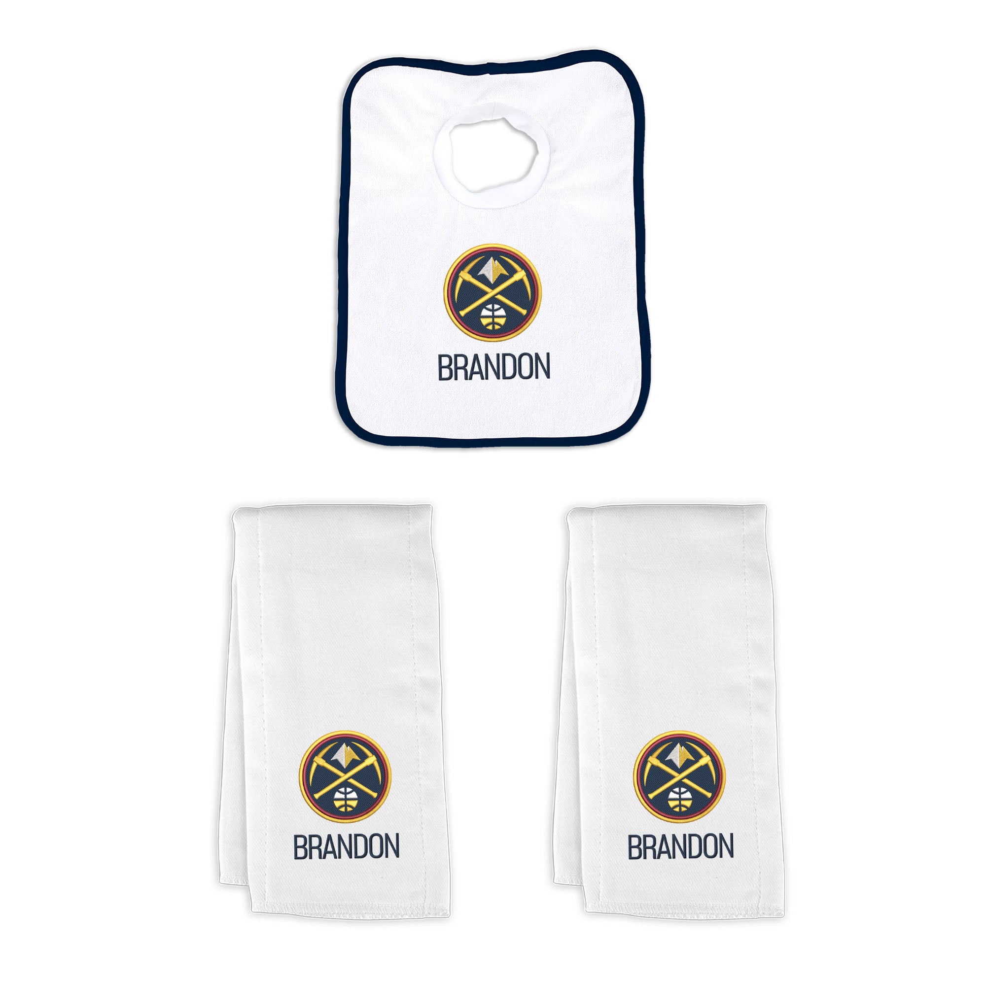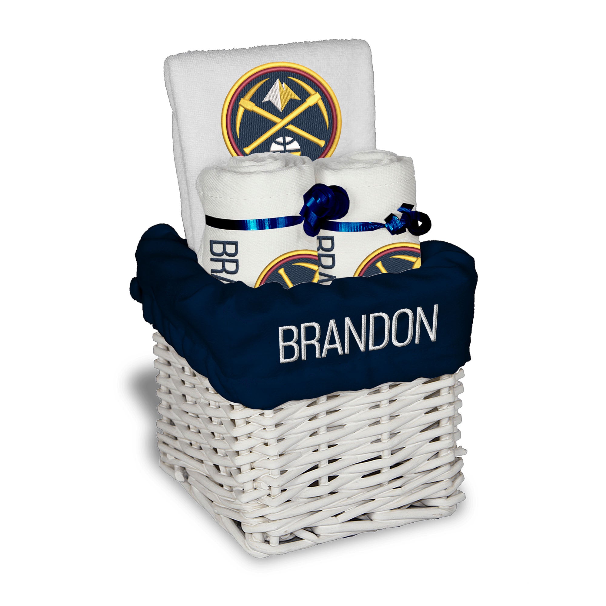 Our Personalized Denver Nuggets Small Gift Basket contains 3 of our best-selling items packaged in a white willow basket with a personalized cotton liner. Each basket holds 2 of our 100% cotton burp cloths and a 100% cotton terry pullover bib. each piece is embroidered with the official Nuggets logo and baby's name or nickname.