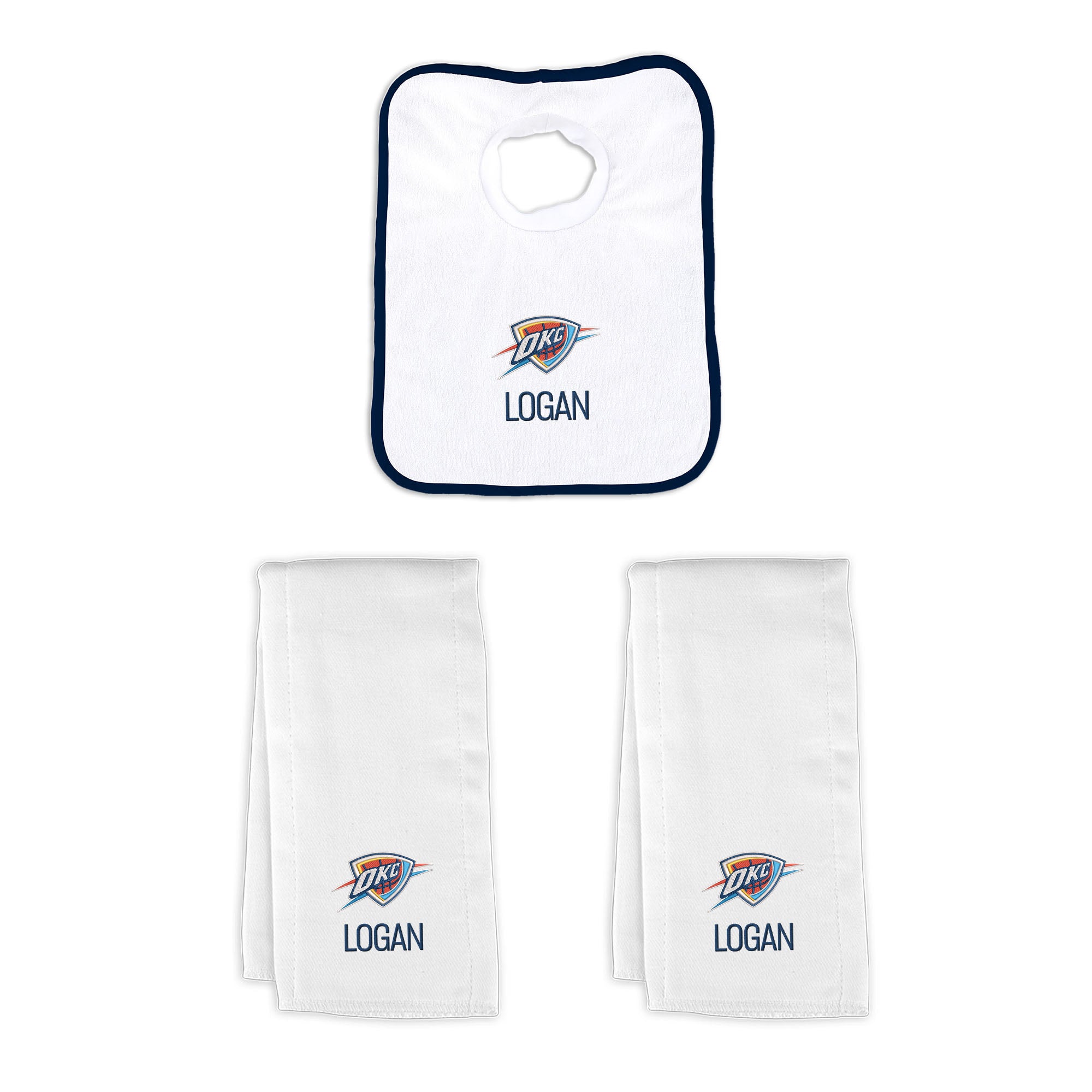 Our Personalized Oklahoma City Thunder Small Gift Basket contains 3 of our best-selling items packaged in a white willow basket with a personalized cotton liner. Each basket holds 2 of our 100% cotton burp cloths and a 100% cotton terry pullover bib. each piece is embroidered with the official Thunder logo and baby's name or nickname.