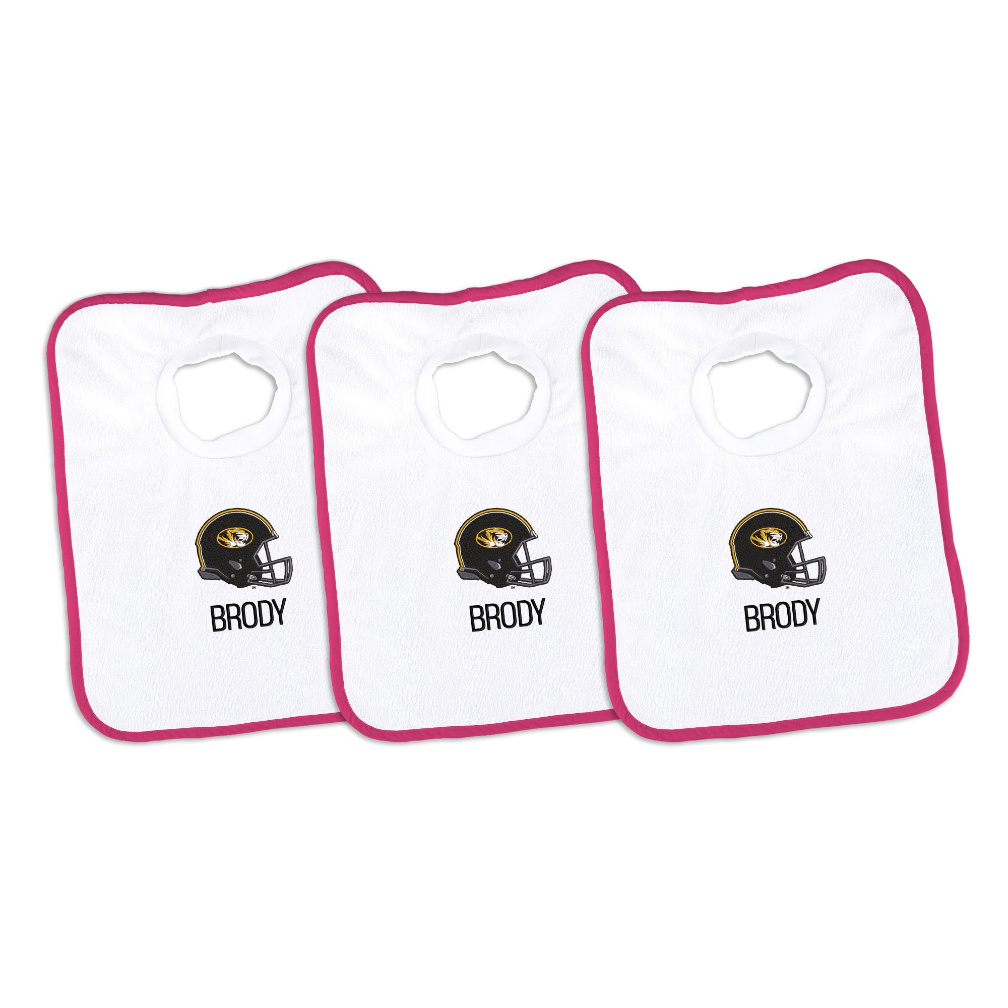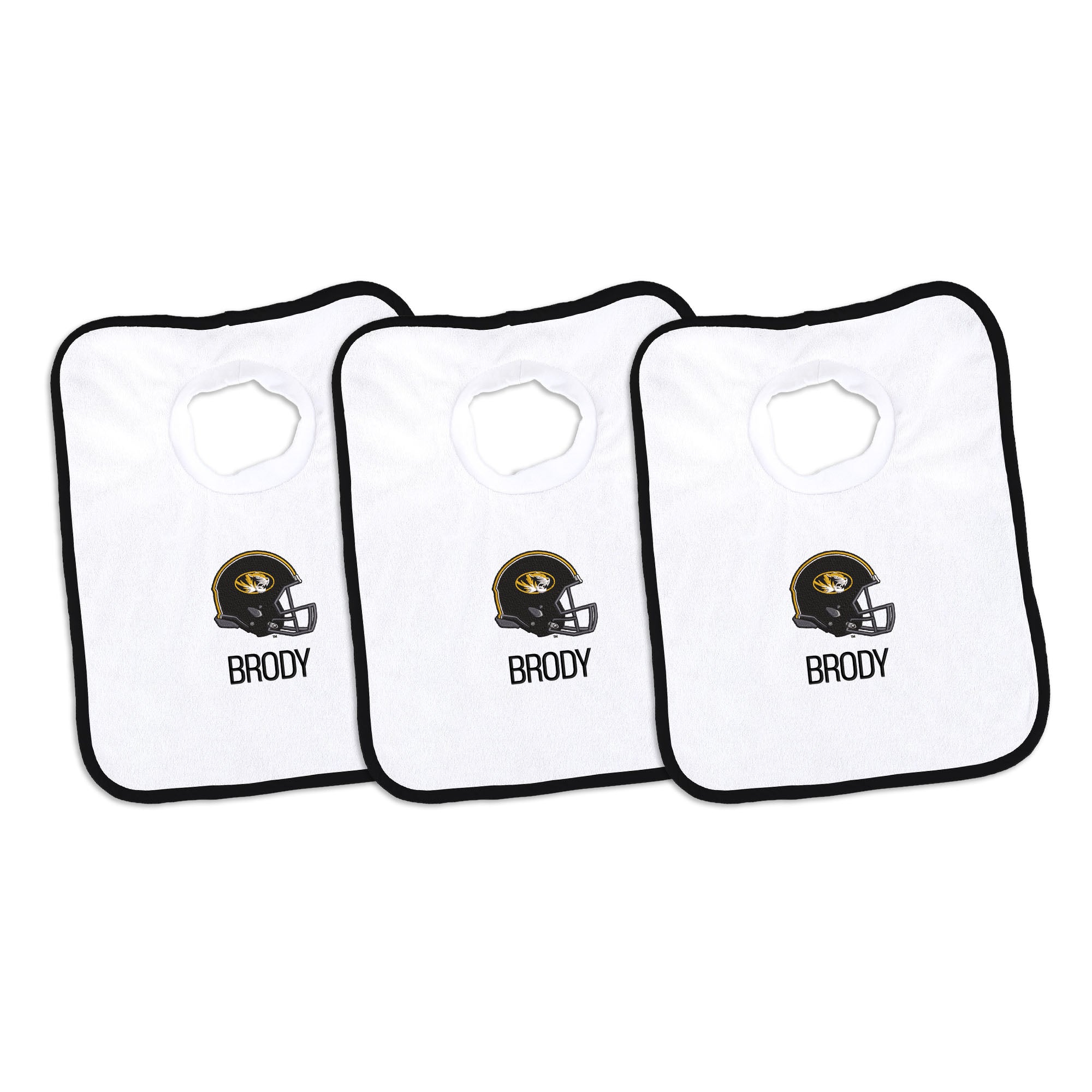 Our Personalized Missouri Tigers Bibs are the perfect accessory for every baby Tigers fan. The Tigers bibs slip on easily over baby’s head, with a neck hole that is specially designed for extra comfort with super soft, gently gathered stretch cotton. Each bib is embroidered with the Tigers logo and your little one’s name or nickname. Makes a wonderful gift for new Tigers babies and their families.