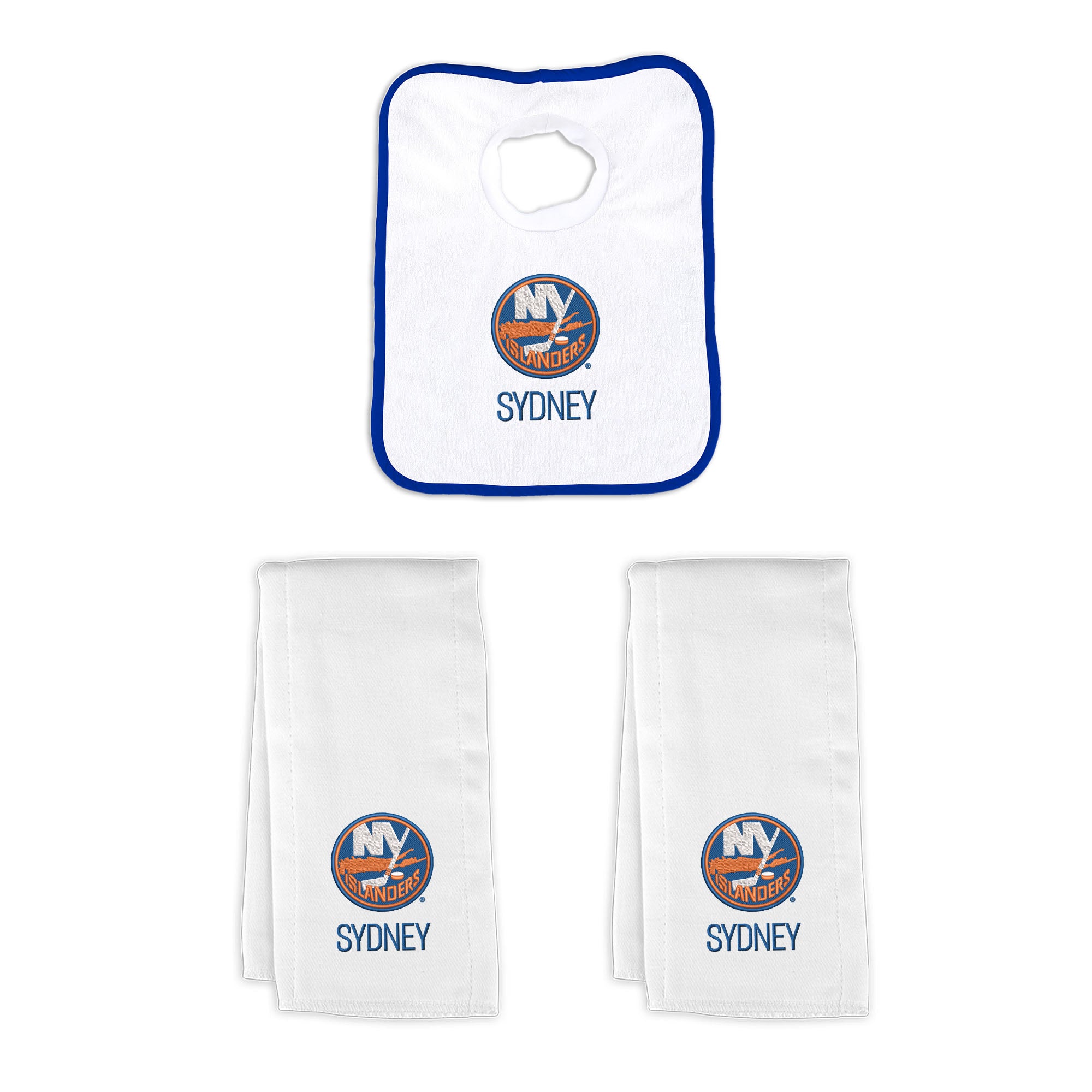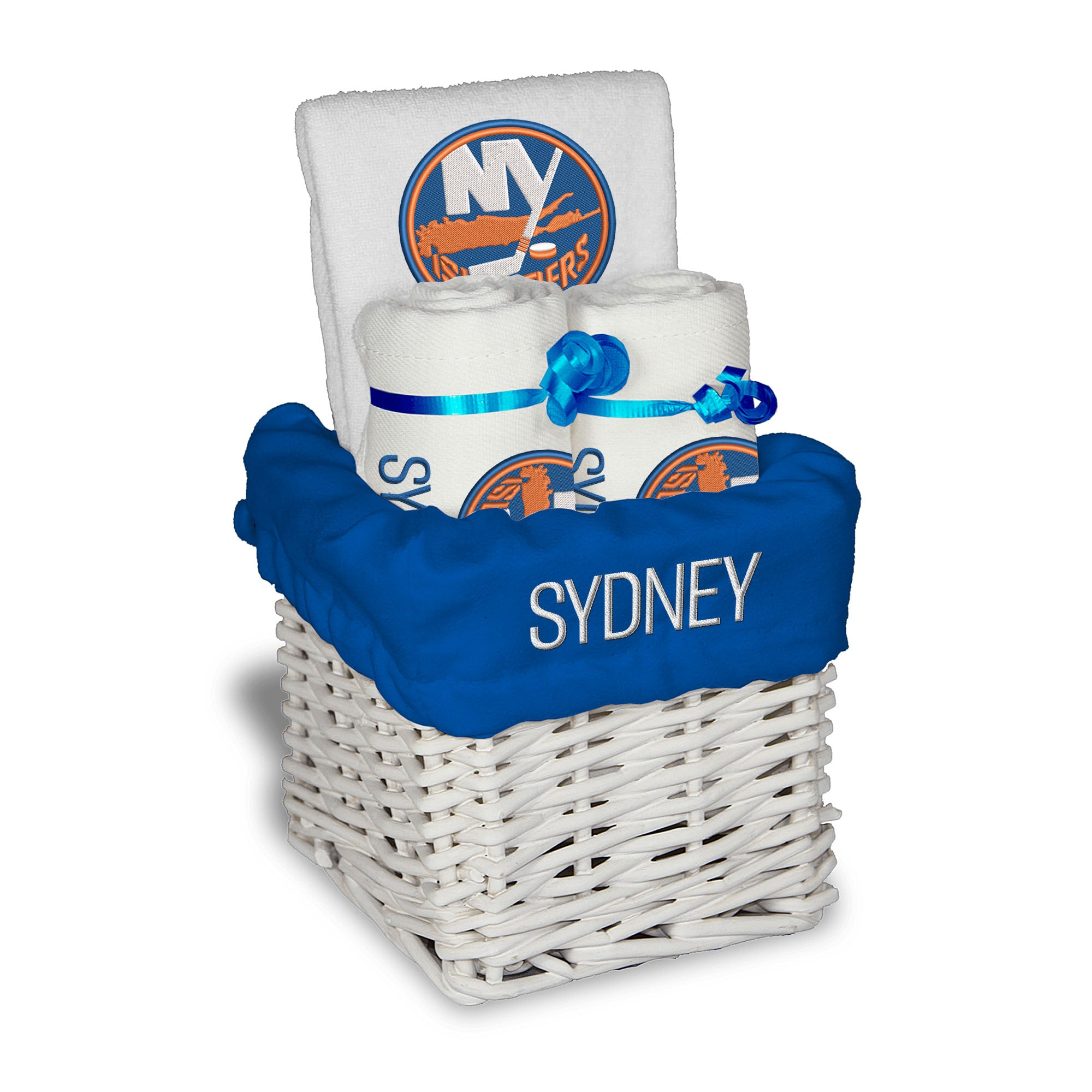 Our Personalized New York Islanders Small Gift Basket contains 3 of our best-selling items packaged in a white willow basket with a personalized cotton liner. Each basket holds 2 of our 100% cotton burp cloths and a 100% cotton terry pullover bib. each piece is embroidered with the official Islanders logo and baby's name or nickname.
