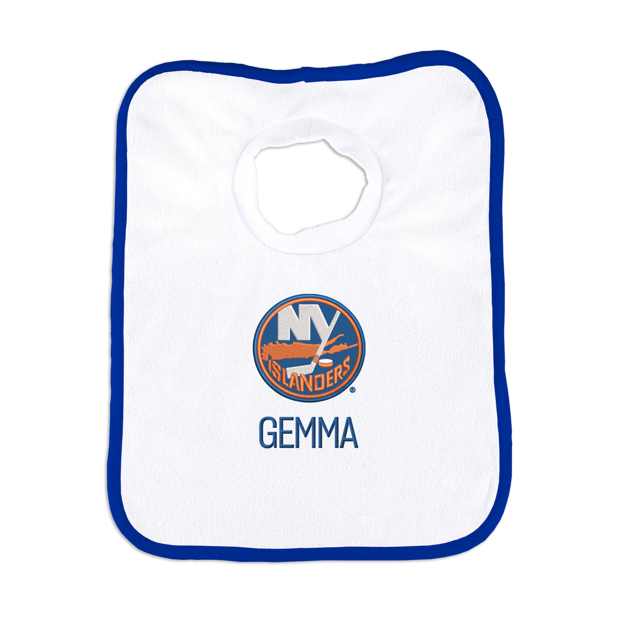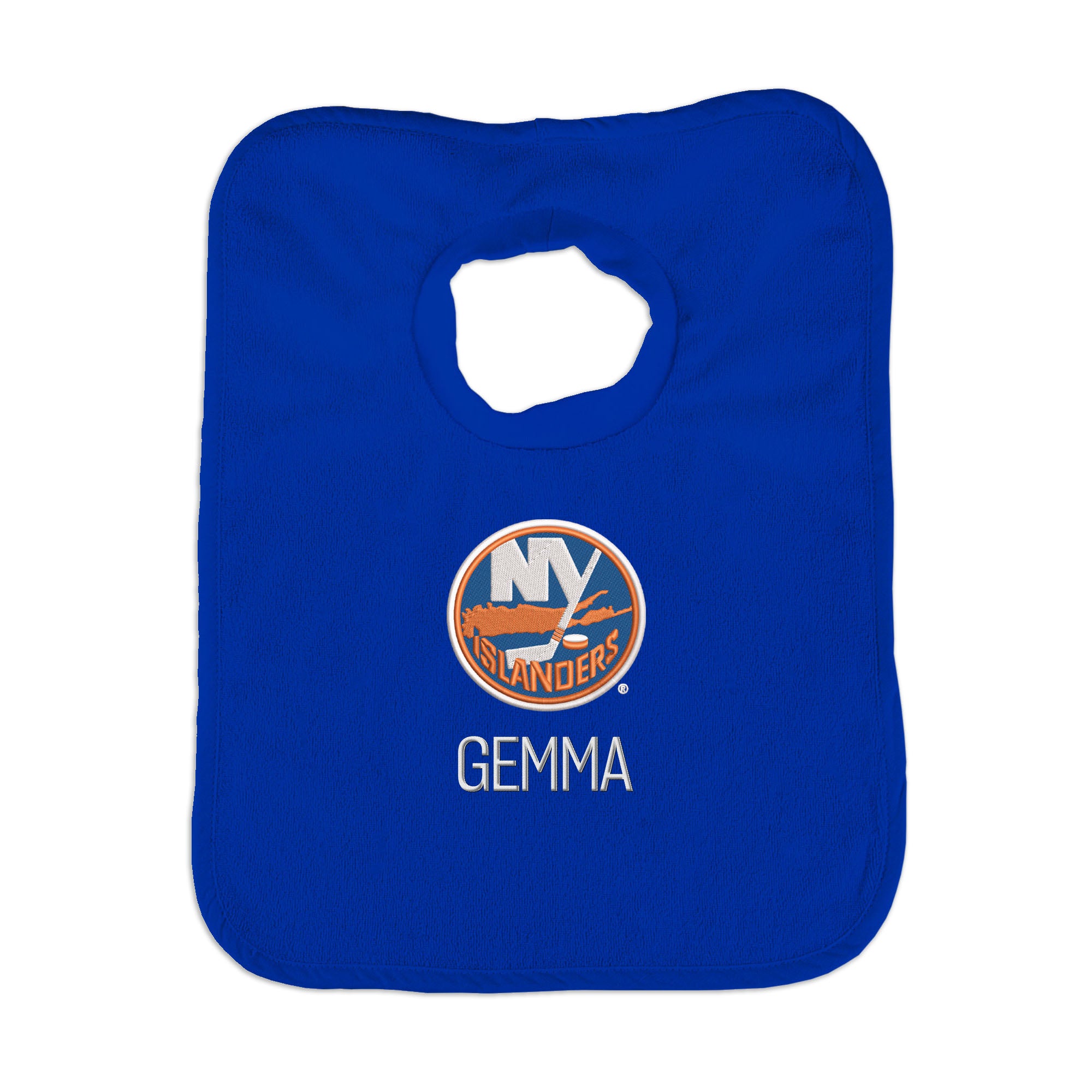 Our Personalized New York Islanders Bib is the perfect accessory for every baby Islanders fan. The bib slips on easily over baby’s head, with a neck hole that is specially designed for extra comfort with super soft, gently gathered stretch cotton. Each bib is embroidered with the Islanders logo and your little one’s name or nickname. Makes a wonderful gift for new hockey babies and their families.