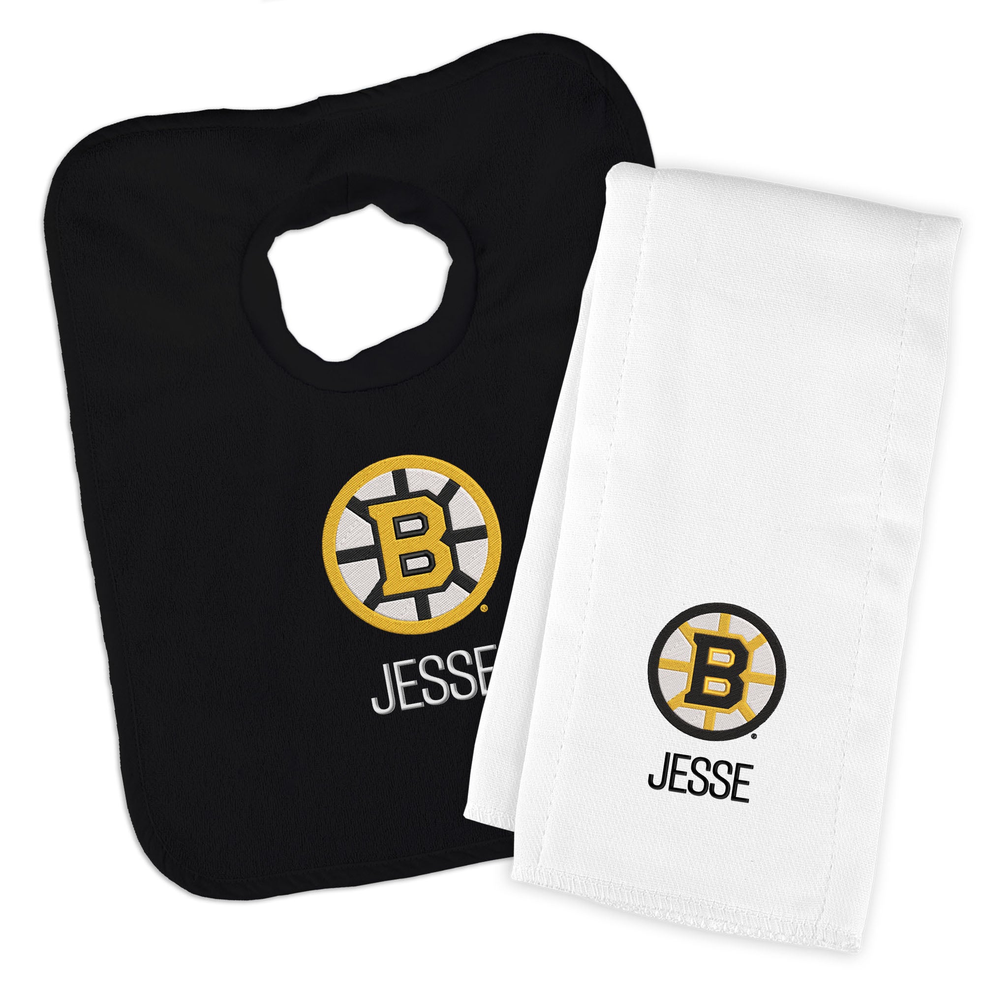 Our Personalized Boston Bruins Bib and Burp Cloth Set is a thoughtful and useful gift for every baby Bruins fan. The Bruins burp cloth is generously sized and made of soft, absorbent 100% cotton, and the bib has a soft, stretchable cotton neck hole for baby’s comfort. Parents, the bib slips easily over your baby's head and features a soft, gently gathered stretch cotton neck hole for maximum comfort; also, the burp cloth is a must-have asset. Each item features the embroidered logo and the baby's name or nickname underneath.