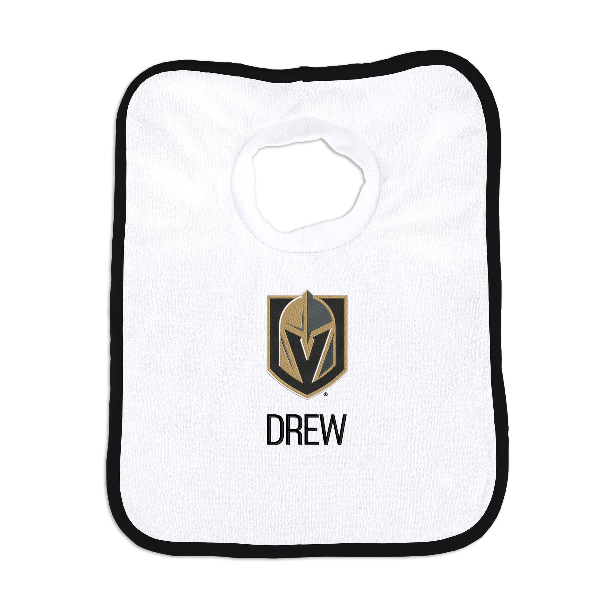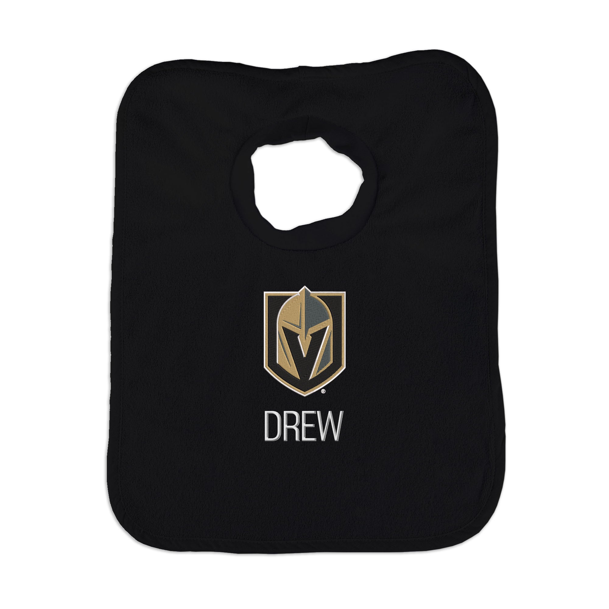 Our Personalized Vegas Golden Knights Bib is the perfect accessory for every baby Golden Knights fan. The bib slips on easily over baby’s head, with a neck hole that is specially designed for extra comfort with super soft, gently gathered stretch cotton. Each bib is embroidered with the Golden Knights logo and your little one’s name or nickname. Makes a wonderful gift for new hockey babies and their families.