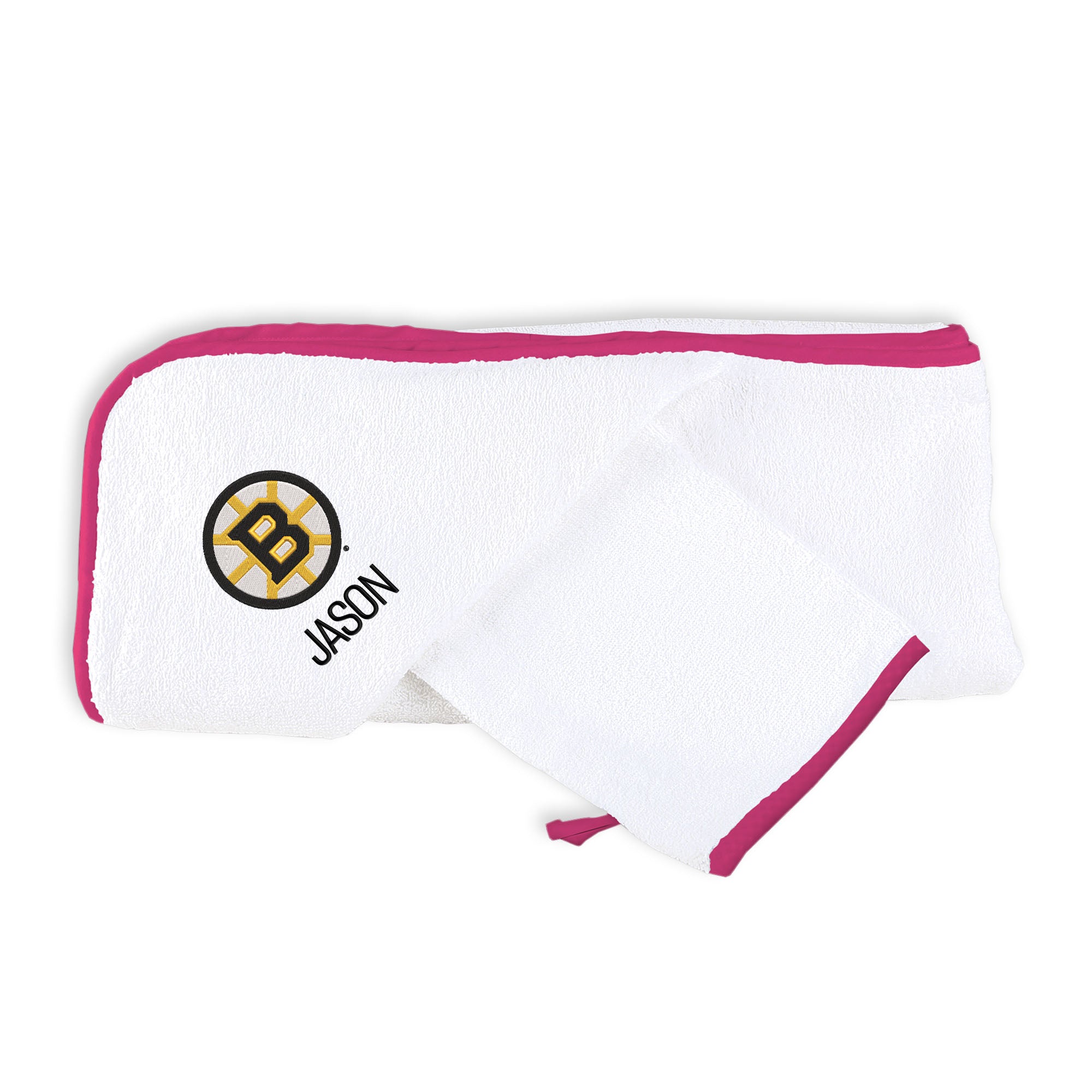 Pamper your youngest sports fan with our Officially Licensed Personalized Boston Bruins Hooded Towel and Wash Mitt Set. Crafted from soft 100% cotton terry, the wash mitt fits over your hand for gentle sudsing and cleansing; then, wrap the baby up in the absorbent Bruins logoed hooded towel. The hooded corner of the towel keeps baby’s head warm while the generously sized towel wraps your future Bruins in cozy comfort. Each towel is embroidered with the official Boston Bruins logo and baby’s name or nickname.