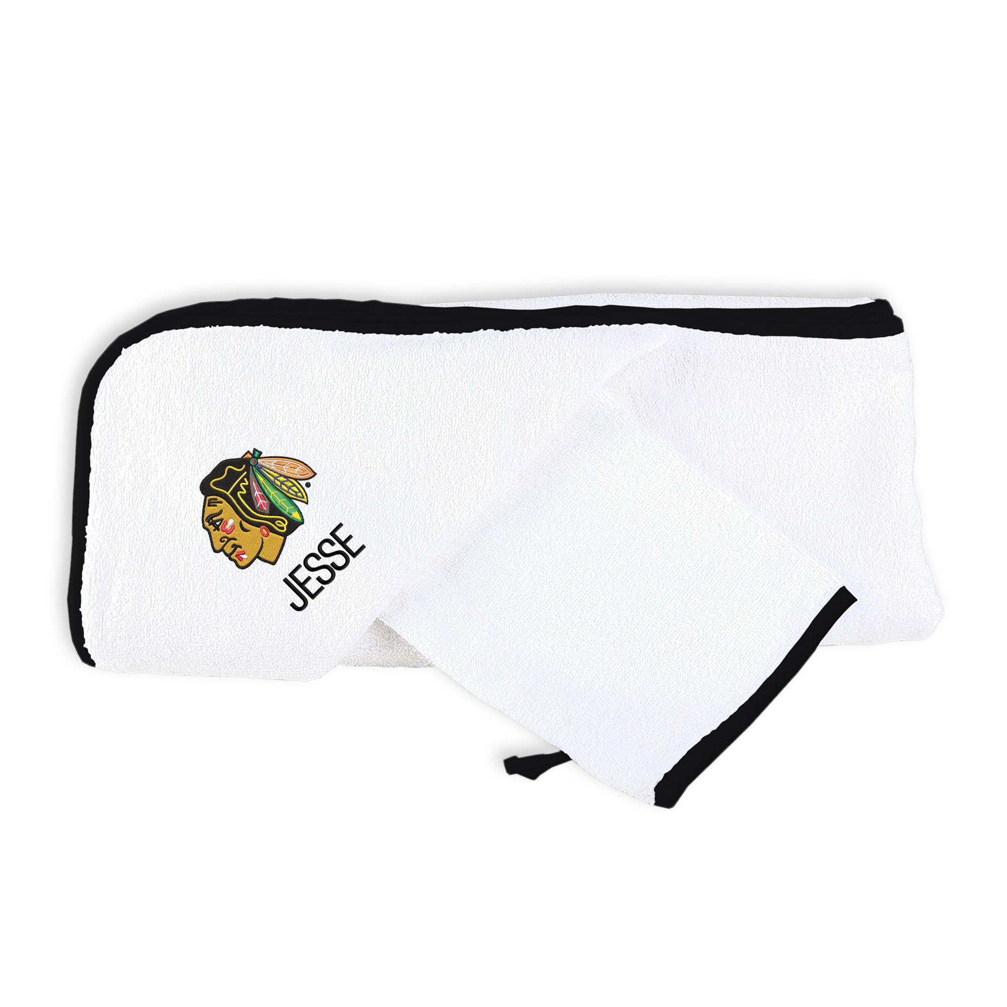 Pamper your youngest sports fan with our Officially Licensed Personalized Chicago Blackhawks Hooded Towel and Wash Mitt Set. Crafted from soft 100% cotton terry, the wash mitt fits over your hand for gentle sudsing and cleansing; then, wrap the baby up in the absorbent Blackhawks logoed hooded towel. The hooded corner of the towel keeps baby’s head warm while the generously sized towel wraps your future Blackhawks in cozy comfort. Each towel is embroidered with the official Chicago Blackhawks logo and baby’s name or nickname.
