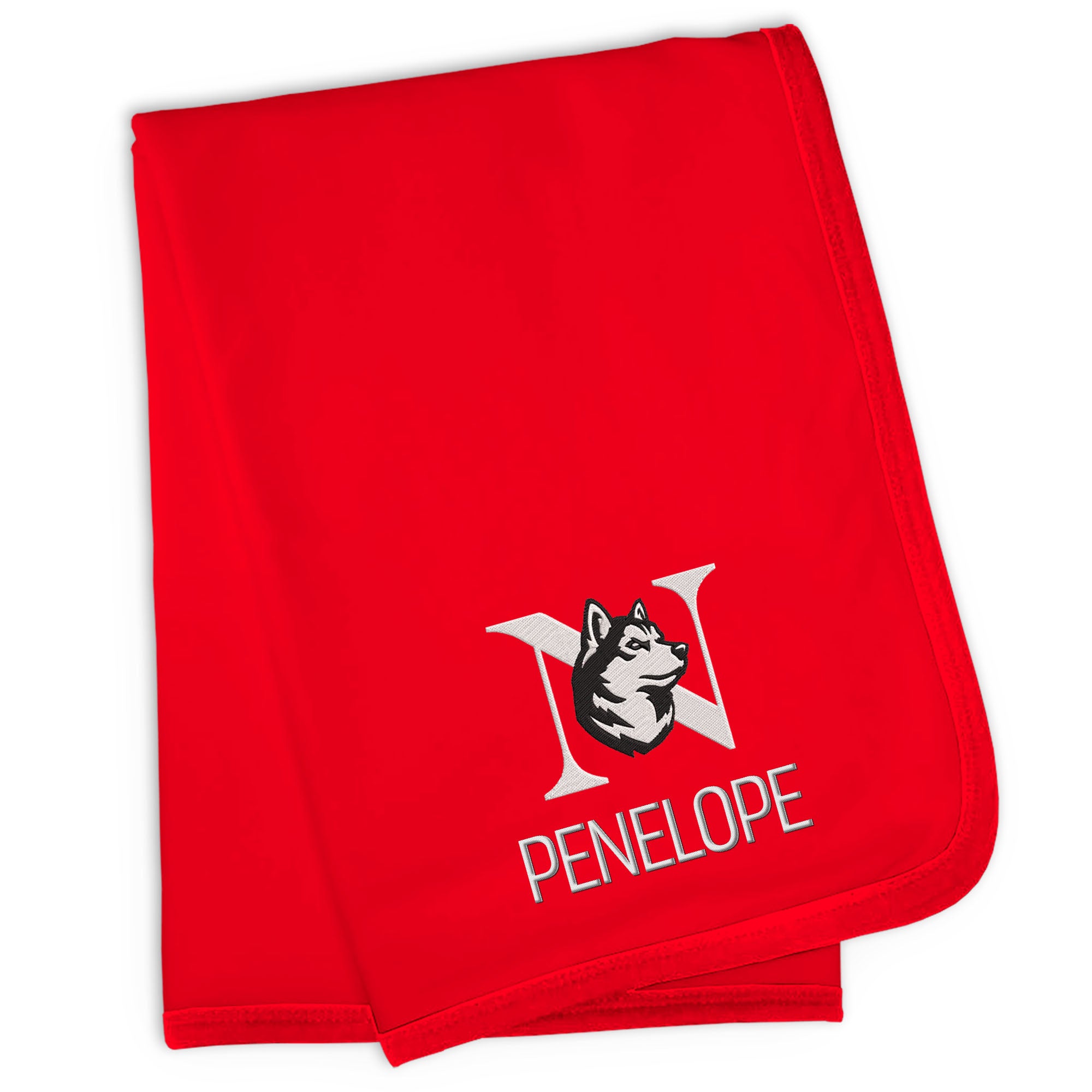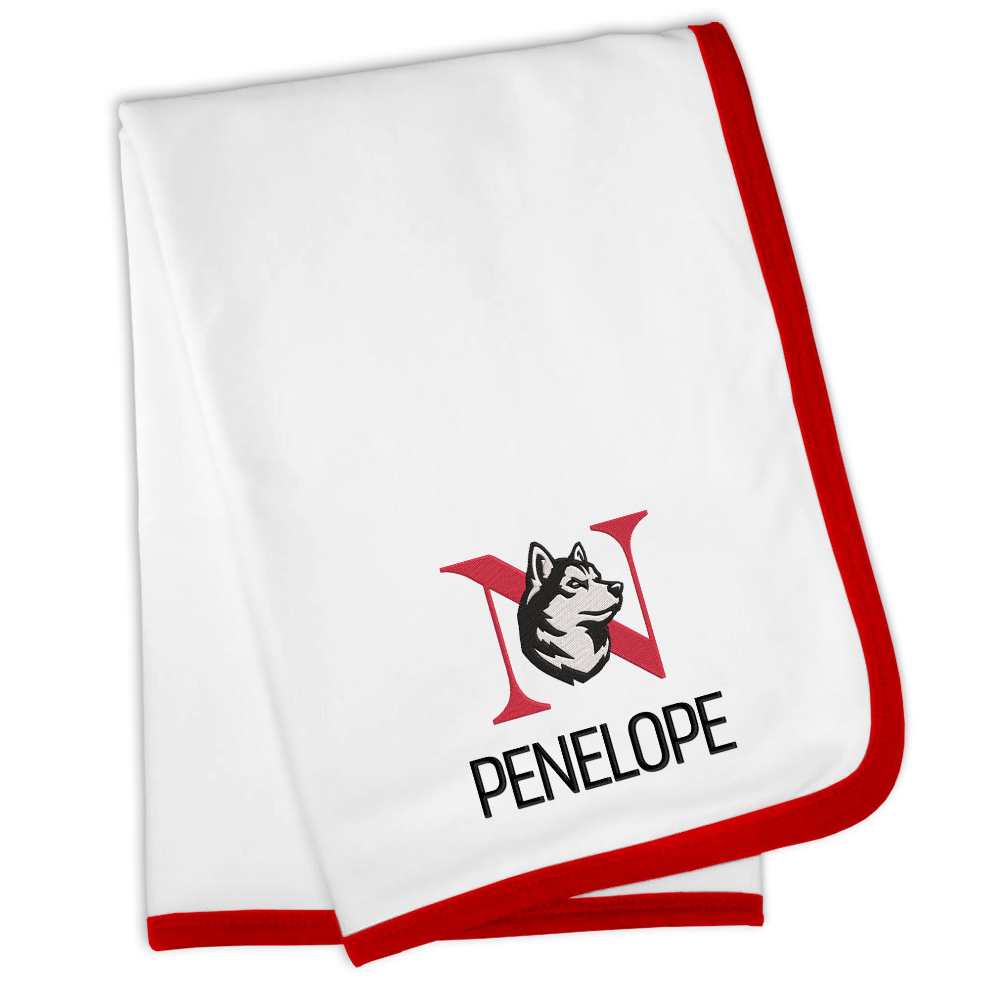Our Personalized Northeastern Huskies Blanket is sized just right for a baby fan. Constructed from super soft 100% cotton jersey knit and trimmed in Huskies team colors, this blanket is perfect for walks in the stroller or swaddling at bedtime. Each blanket is embroidered with the official Huskies logo and your little one’s name or nickname.