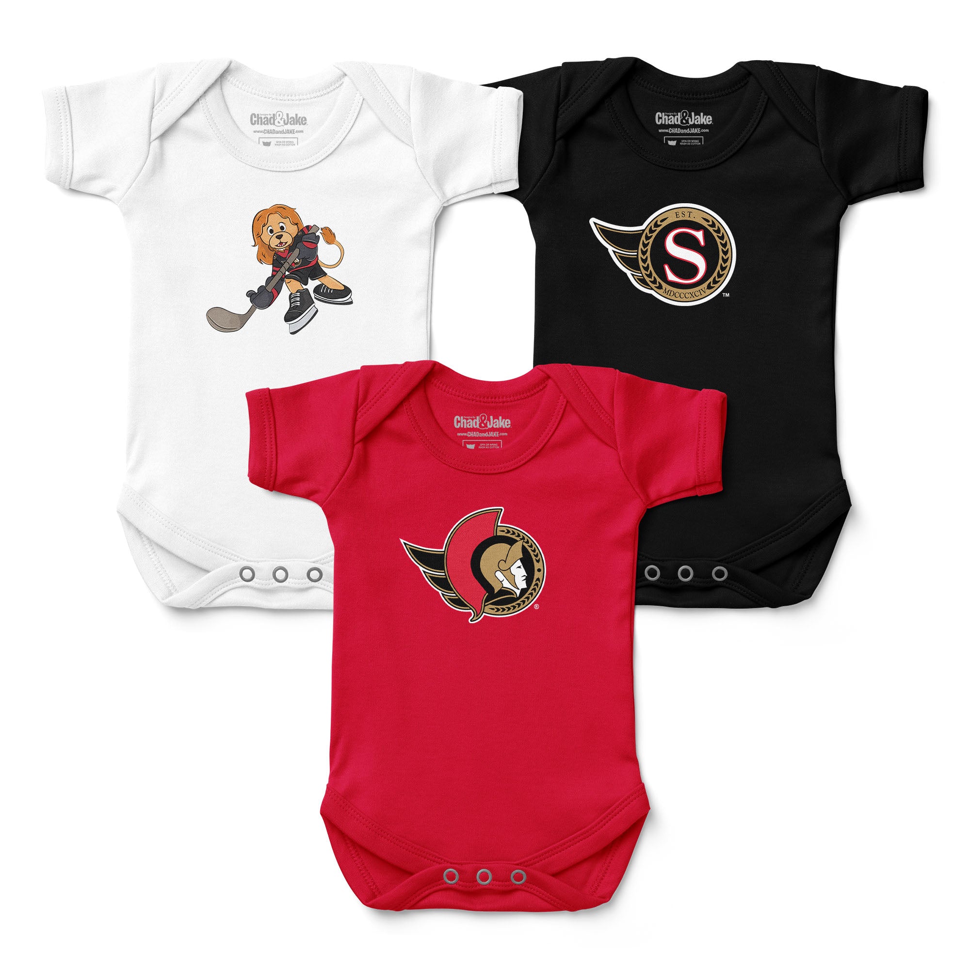 Introduce your little one to the world of hockey with our officially licensed Ottawa Senators 3-Pack Bodysuits. Crafted from soft and breathable cotton, these bodysuits are perfect for keeping your baby comfortable throughout the day. Each pack includes three unique designs that proudly represent the Ottawa Senators, ensuring your baby looks adorable while supporting the team. Available in five sizes: 0-3 Months, 3-6 Months, 6-12 Months, 12-18 Months, and 18-24 Months. Whether it's game day or everyday wear, your little one will be the cutest Senators fan in town. Get your 3-pack today and show your Ottawa Senators spirit!