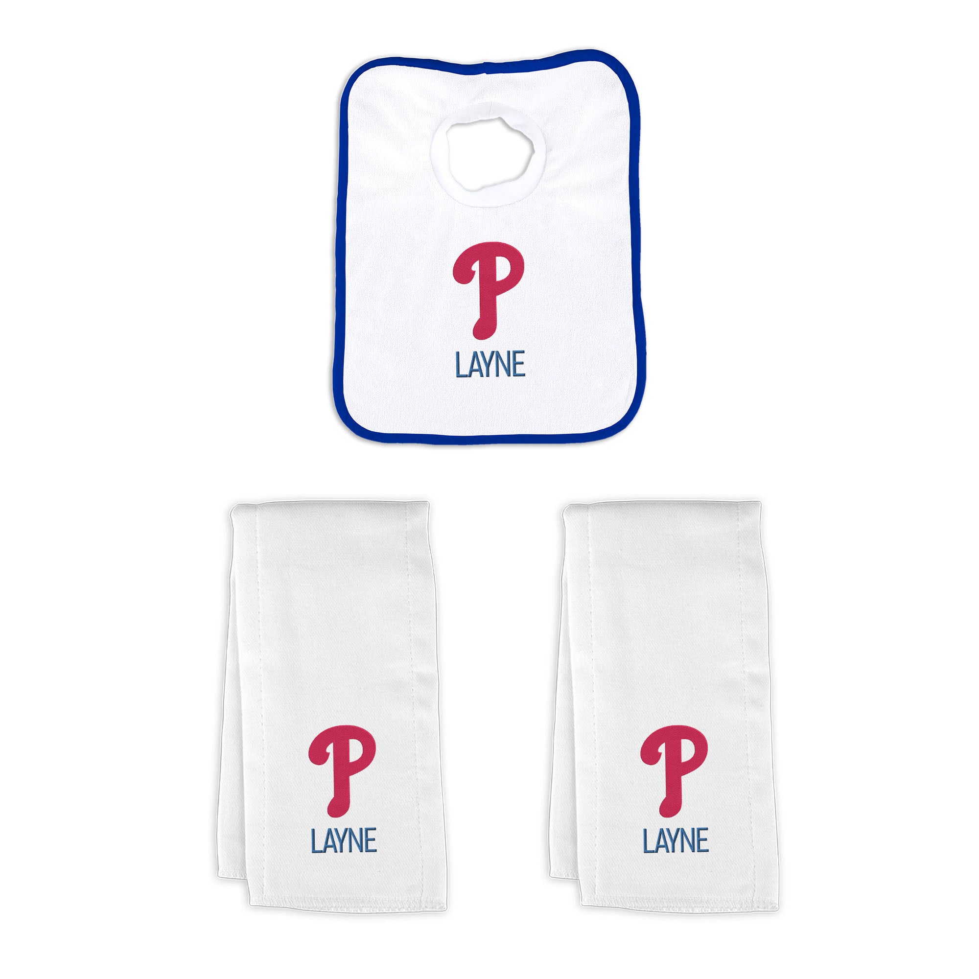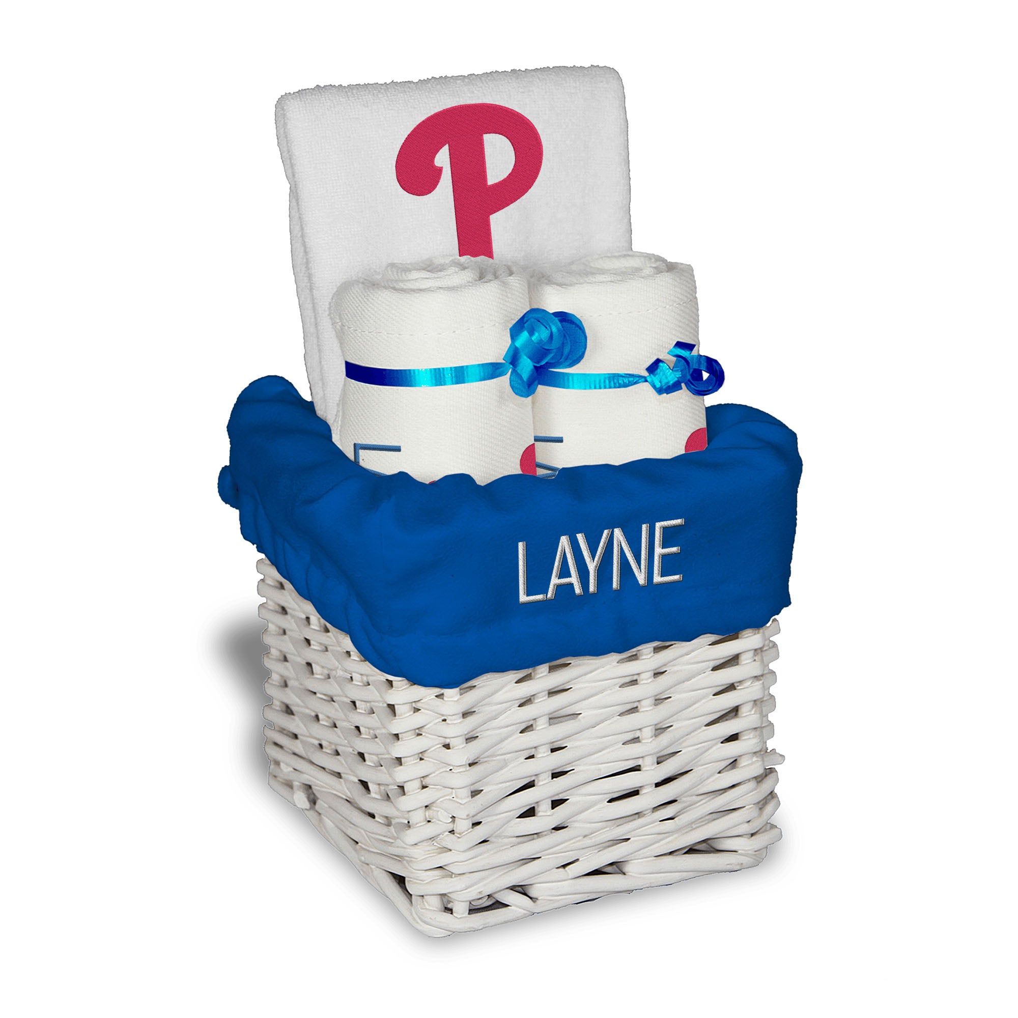 Our Personalized Philadelphia Phillies Small Gift Basket contains 3 of our best-selling items packaged in a white willow basket with a personalized cotton liner. Each basket holds 2 of our 100% cotton burp cloths and a 100% cotton terry pullover bib. each piece is embroidered with the official Phillies logo and baby's name or nickname.