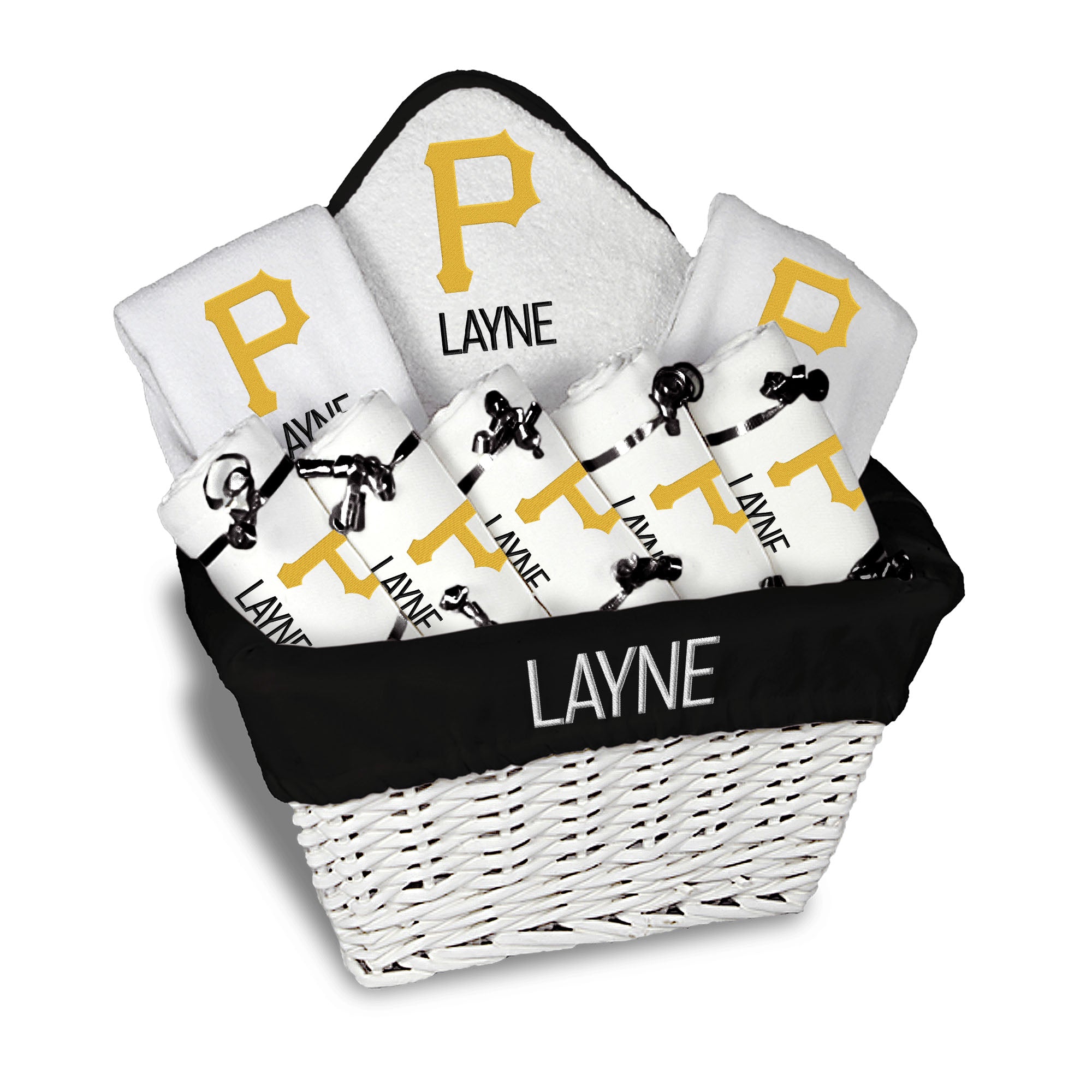 Our Personalized Pittsburgh Pirates Large Gift Basket contains an assortment of our best-selling items packaged in a white willow basket with a personalized cotton liner. Each basket holds five of our 100% cotton burp cloths, two 100% cotton terry pullover bibs, and one 100% cotton terry hooded towel and wash mitt. The burp cloths, bibs and hooded towel are each embroidered with the Pirates logo and baby’s name or nickname; the basket liner is embroidered with the baby’s name.