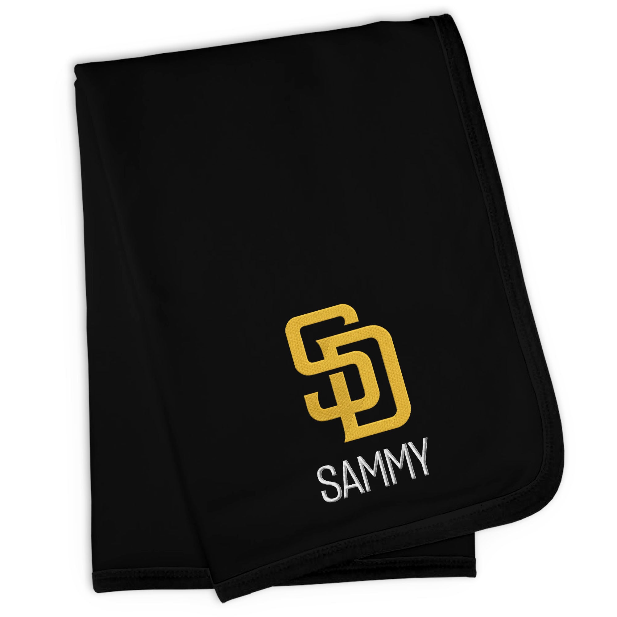 Our Personalized San Diego Padres Blanket is sized just right for a baby baseball fan. Constructed from super soft 100% cotton jersey knit and trimmed in Padres team colors, this blanket is perfect for walks in the stroller or swaddling at bedtime.  Each blanket is embroidered with the official Padres logo and your little one’s name or nickname.