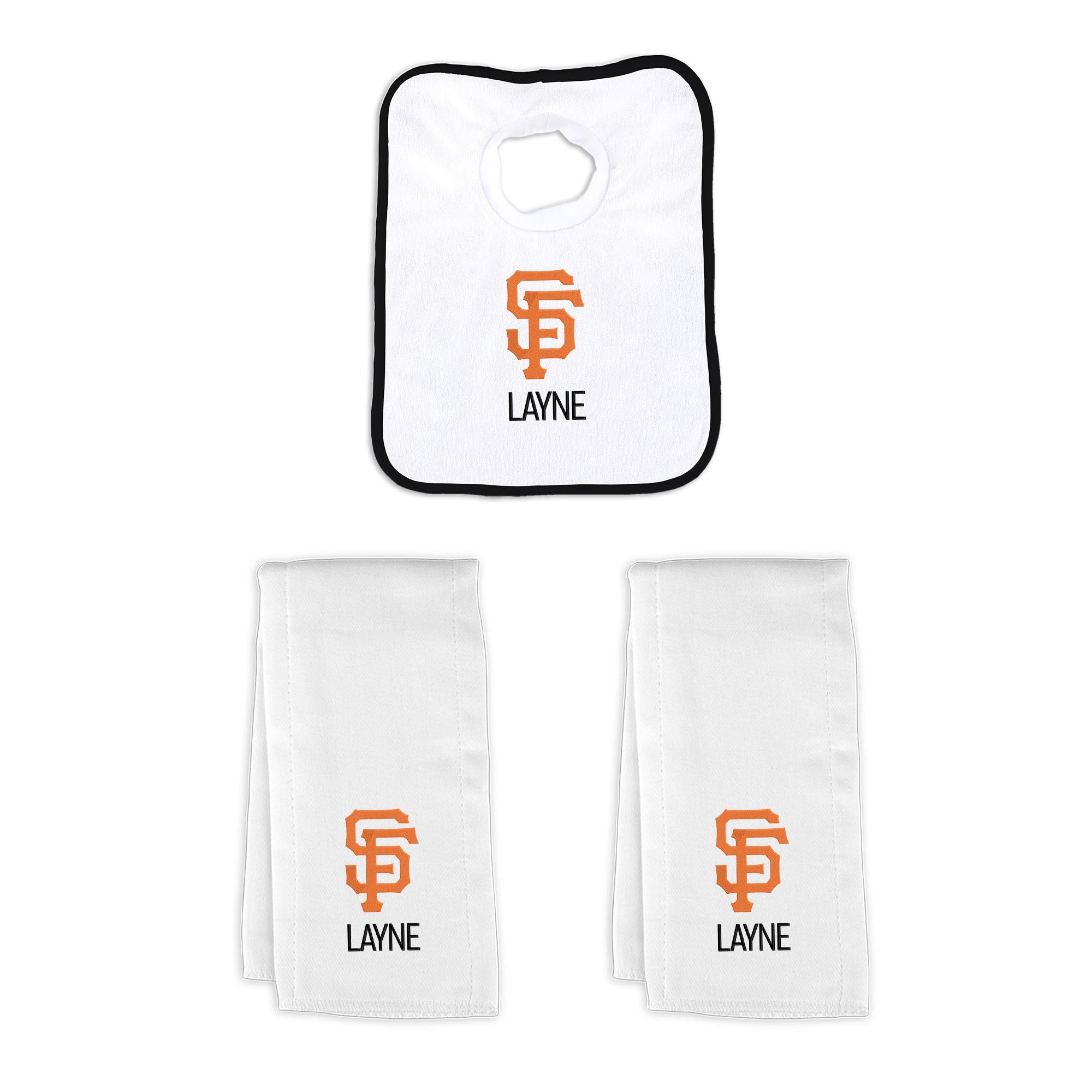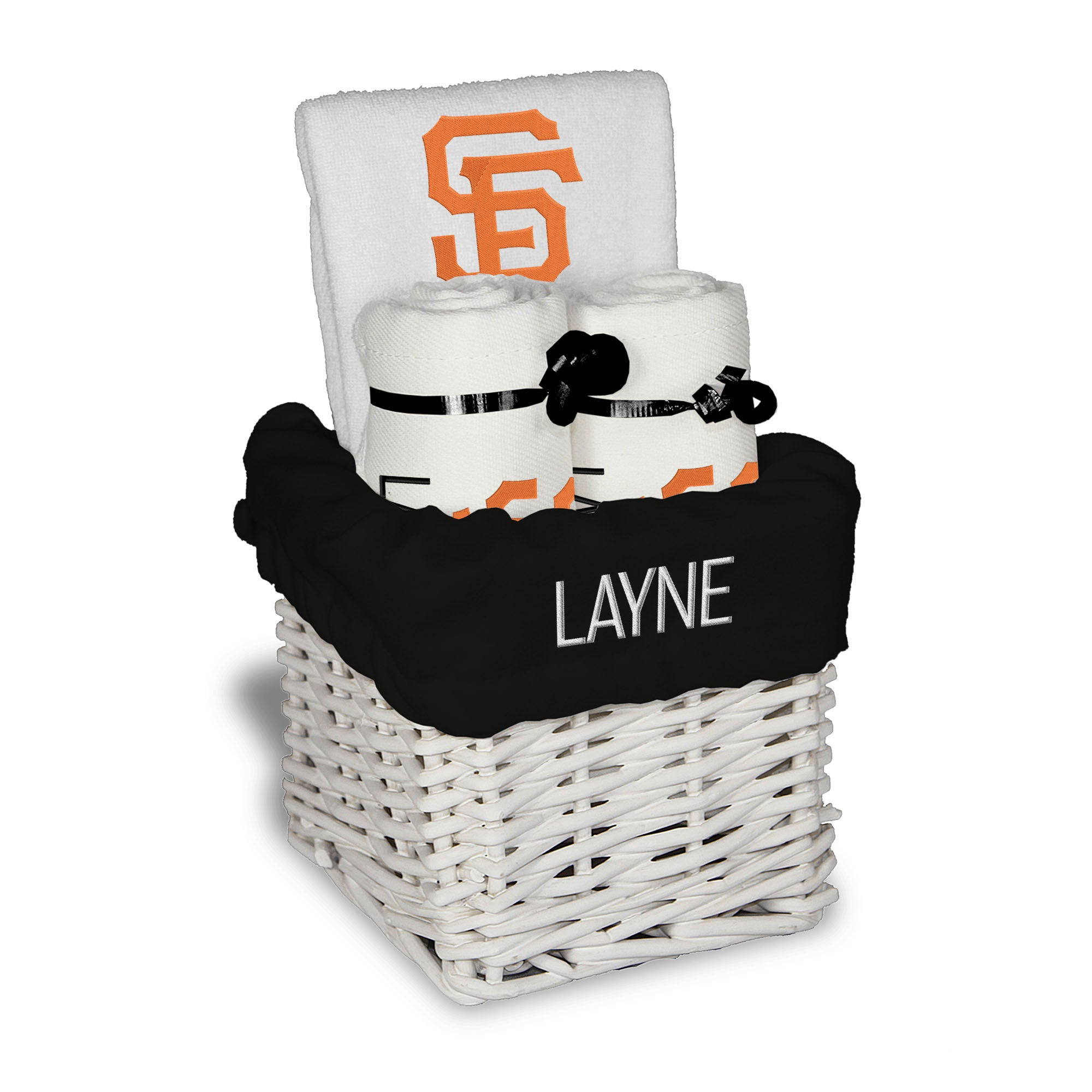 Our Personalized San Francisco Giants Small Gift Basket contains 3 of our best-selling items packaged in a white willow basket with a personalized cotton liner. Each basket holds 2 of our 100% cotton burp cloths and a 100% cotton terry pullover bib. each piece is embroidered with the official Giants logo and baby's name or nickname.