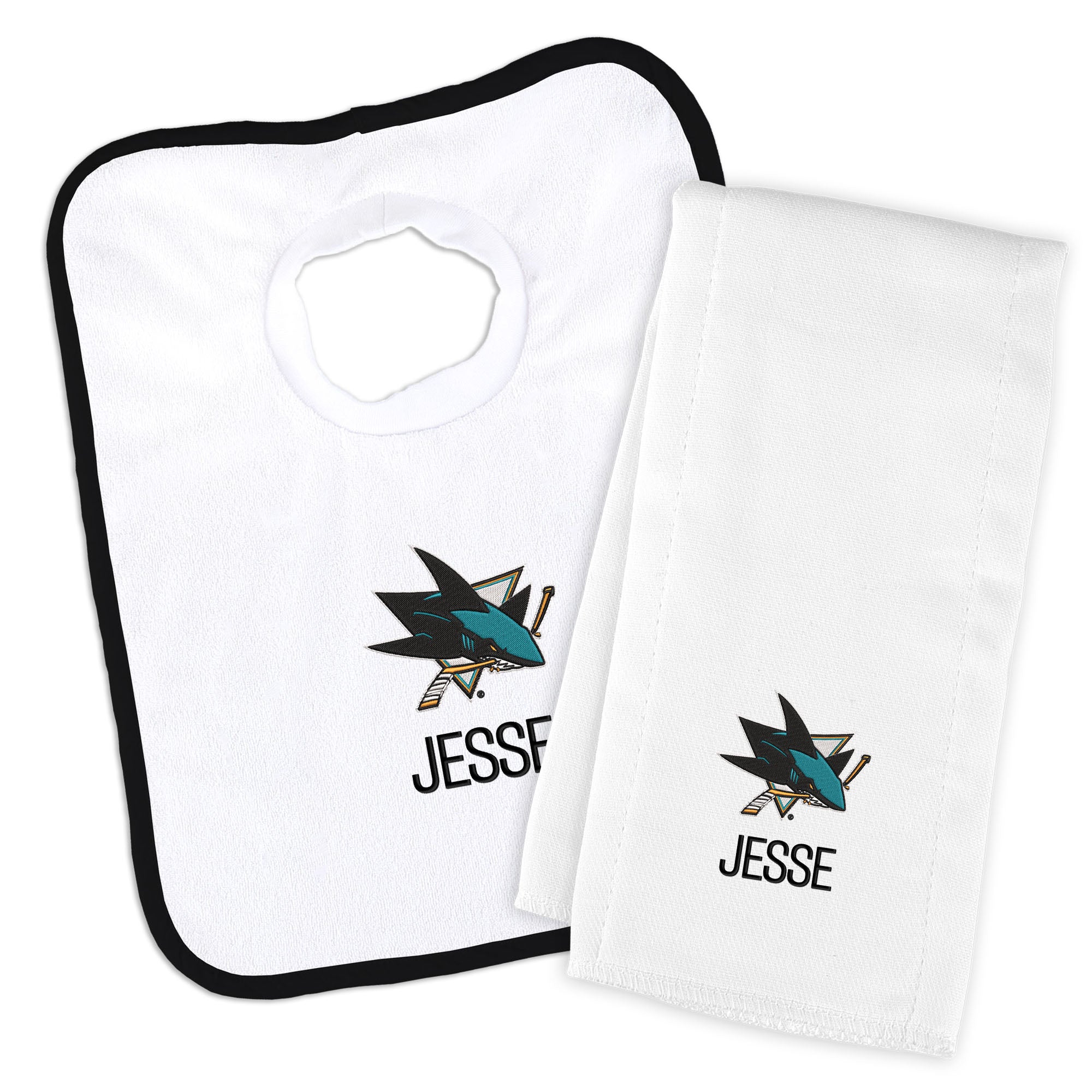 Our Personalized San Jose Sharks Bib and Burp Cloth Set is a thoughtful and useful gift for every baby Sharks fan. The Sharks burp cloth is generously sized and made of soft, absorbent 100% cotton, and the bib has a soft, stretchable cotton neck hole for baby’s comfort. Parents, the bib slips easily over your baby's head and features a soft, gently gathered stretch cotton neck hole for maximum comfort; also, the burp cloth is a must-have asset. Each item features the embroidered logo and the baby's name or nickname underneath.