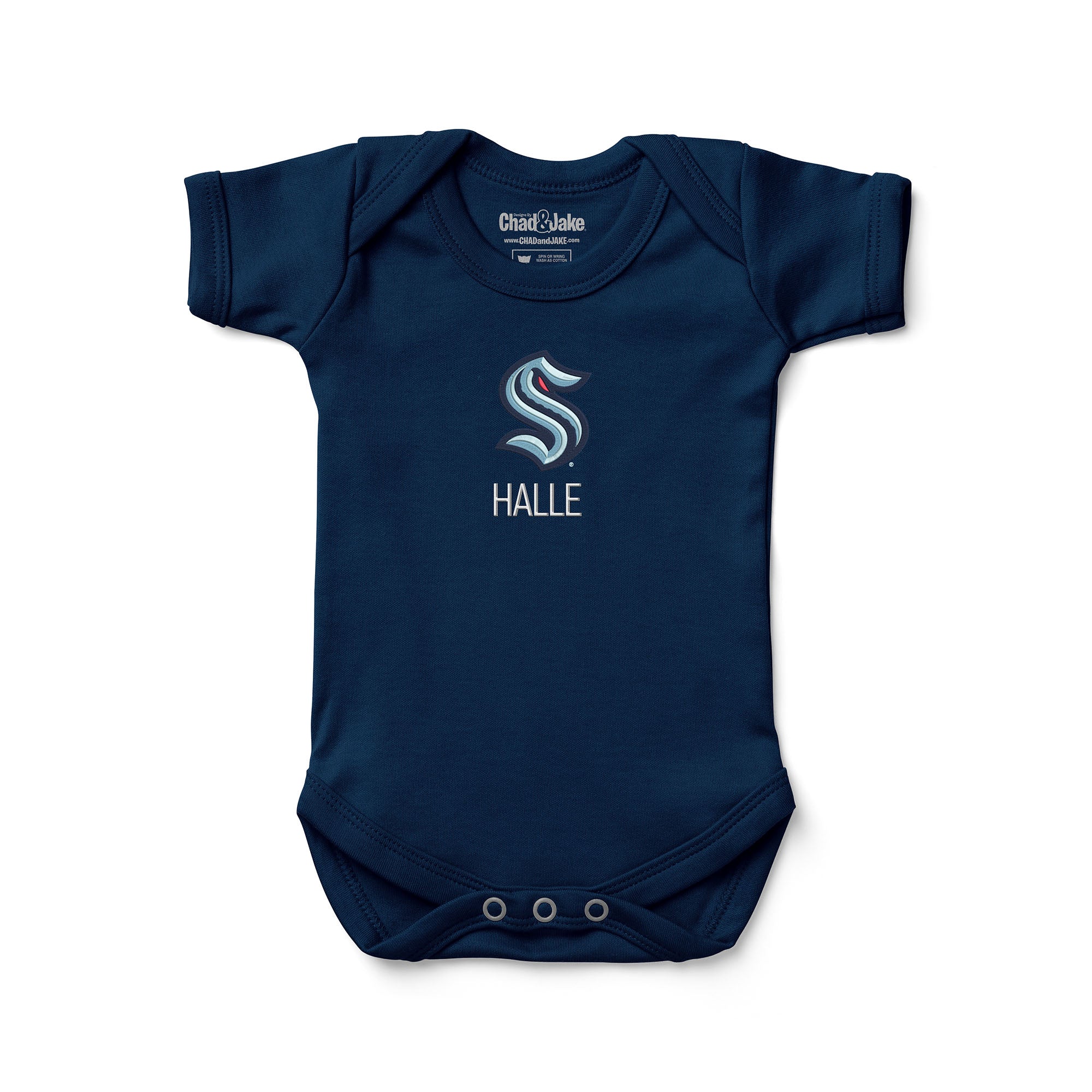 Show your love for the Seattle Kraken with our super-soft and comfortable bodysuit. Made from 100% interlock cotton, this bodysuit is machine washable and tumble dryable for easy care. The envelope neck and three-snap closure make it easy to dress and undress, perfect for playtime. Plus, each bodysuit is embroidered with the Seattle Kraken logo and can be personalized with your little one's name, initials, or nickname under the logo. Let everyone know where your loyalty lies with the Seattle Kraken, the team with the state-of-the-art Climate Pledge Arena and a winning record with multiple awards and championships. Cheer on current players like Andrej Sustr and retired legends like Dave Andreychuk with this personalized bodysuit. Go Kraken!