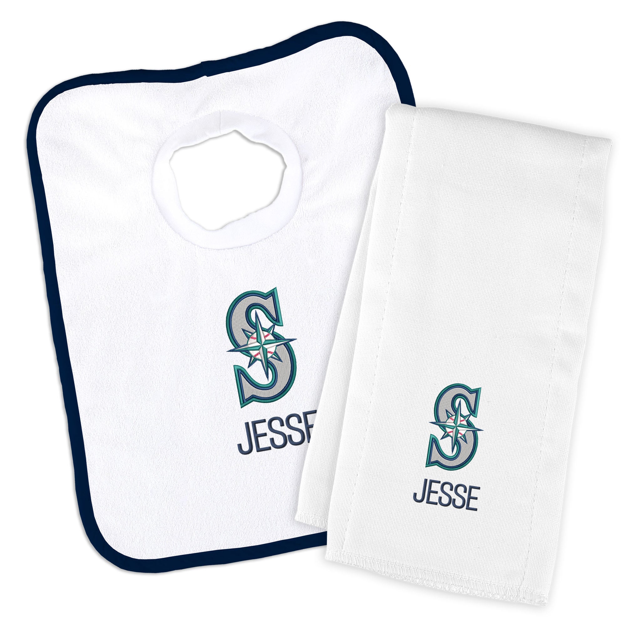 Our Personalized Seattle Mariners Bib and Burp Cloth Set is a thoughtful and useful gift for every baby Mariners fan. The Mariners burp cloth is generously sized and made of soft, absorbent 100% cotton, and the Mariners bib has a soft, stretchable cotton neck hole for baby’s comfort. Parents, the bib slips easily over your baby's head and features a soft, gently gathered stretch cotton neck hole for maximum comfort; also, the burp cloth is a must-have asset.
