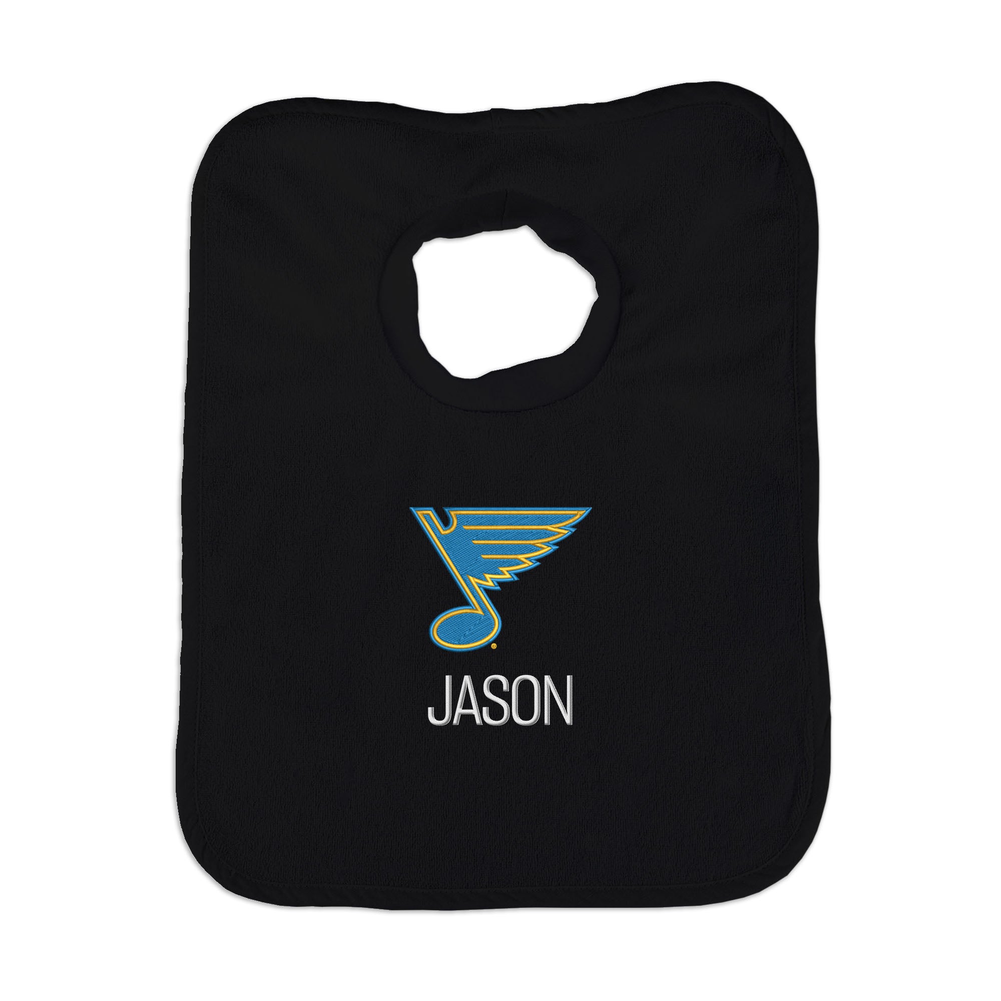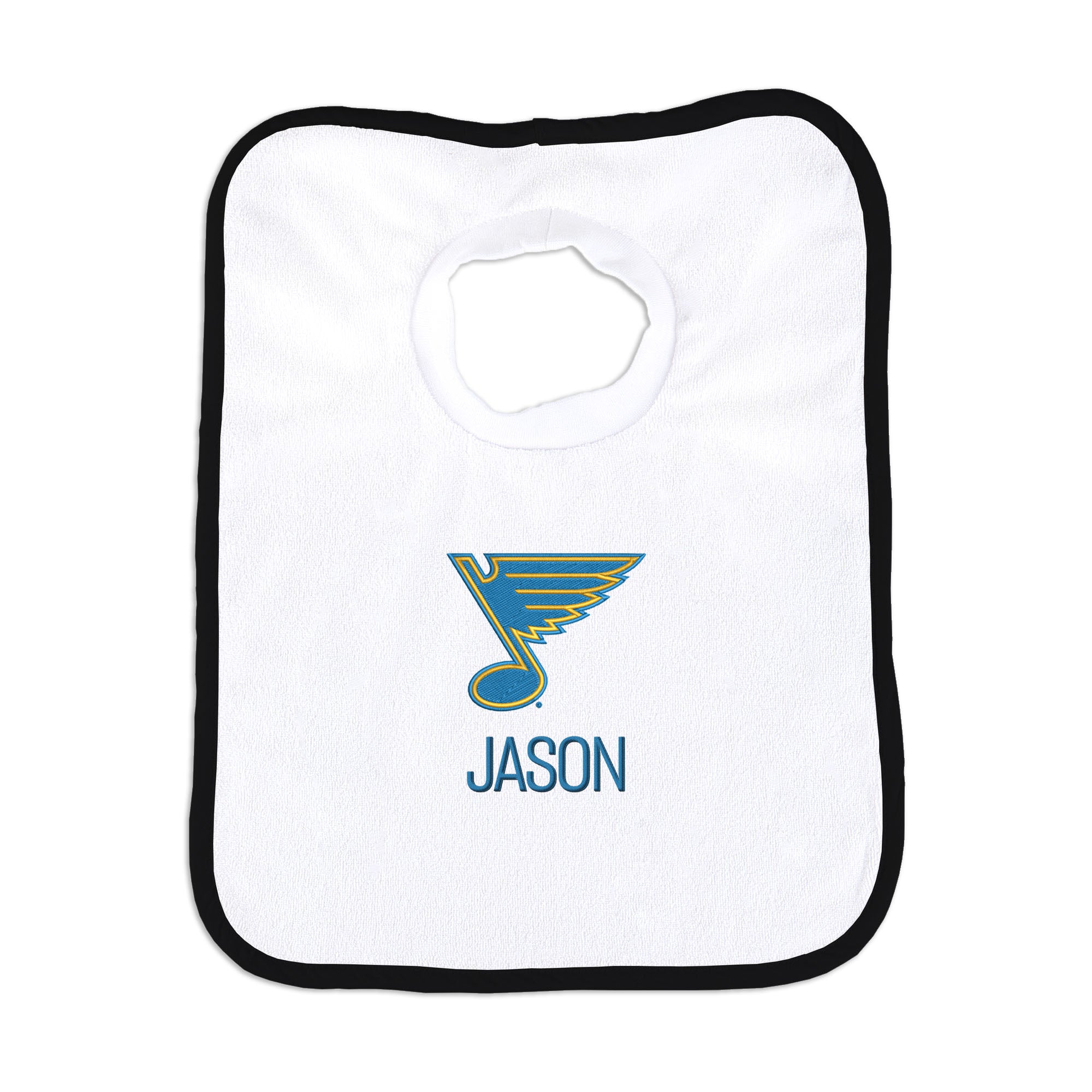 Our Personalized St. Louis Blues Bib is the perfect accessory for every baby Blues fan. The bib slips on easily over baby’s head, with a neck hole that is specially designed for extra comfort with super soft, gently gathered stretch cotton. Each bib is embroidered with the Blues logo and your little one’s name or nickname. Makes a wonderful gift for new hockey babies and their families.