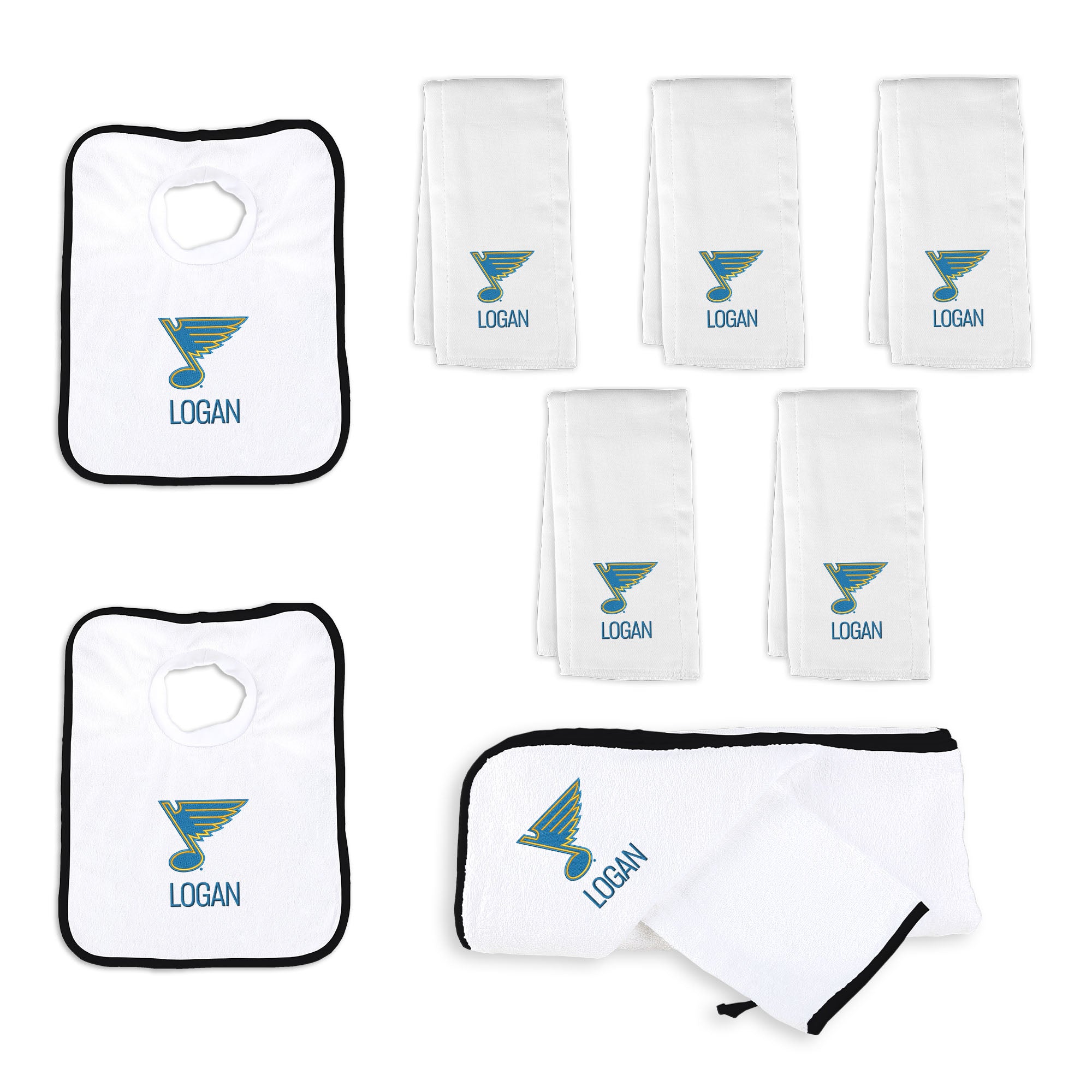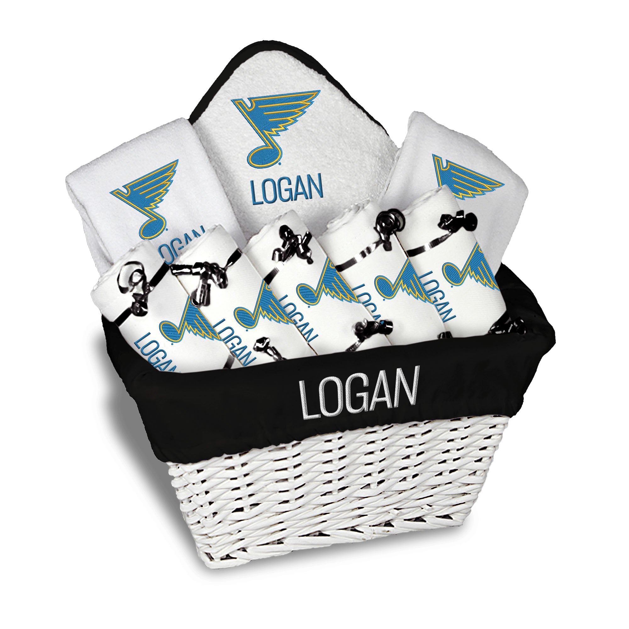 Our Personalized St. Louis Blues Large Gift Basket contains an assortment of our best-selling items packaged in a white willow basket with a personalized cotton liner. Each basket holds five of our 100% cotton burp cloths, two 100% cotton terry pullover bibs, and one 100% cotton terry hooded towel and wash mitt. The burp cloths, bibs and hooded towel are each embroidered with the Blues logo and baby’s name or nickname; the basket liner is embroidered with the baby’s name.