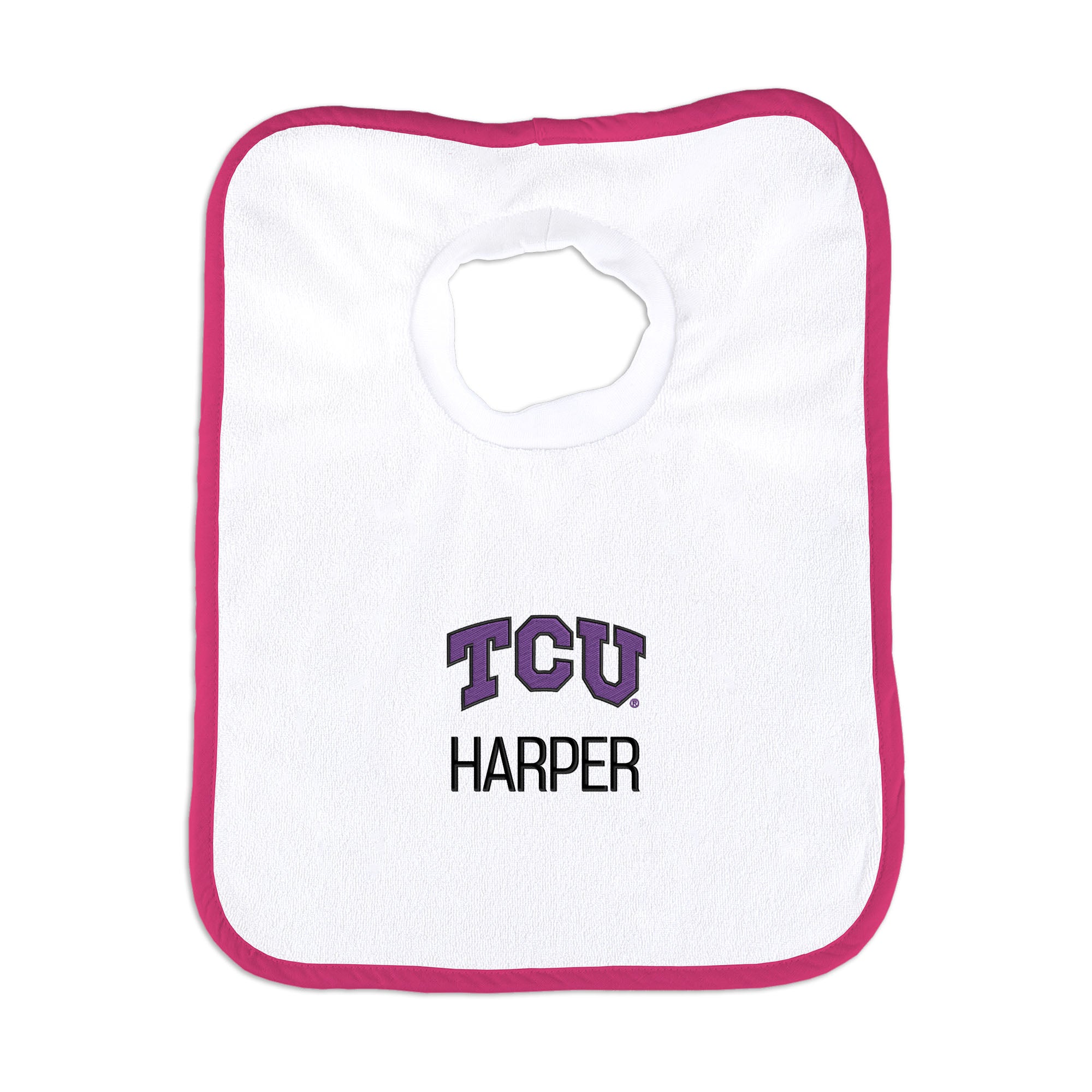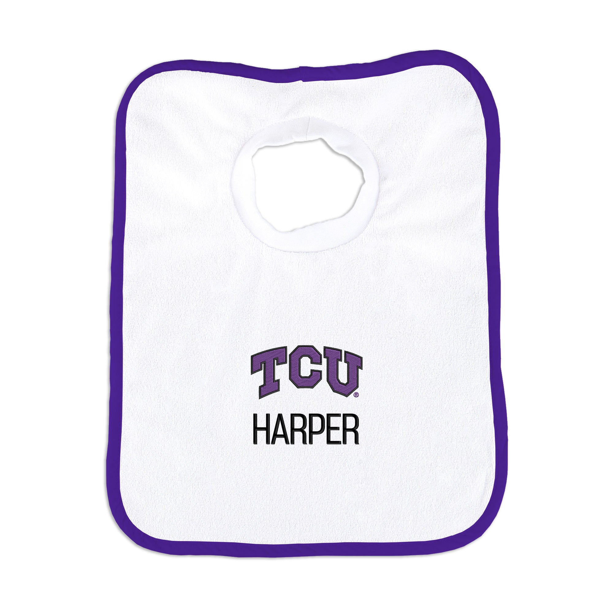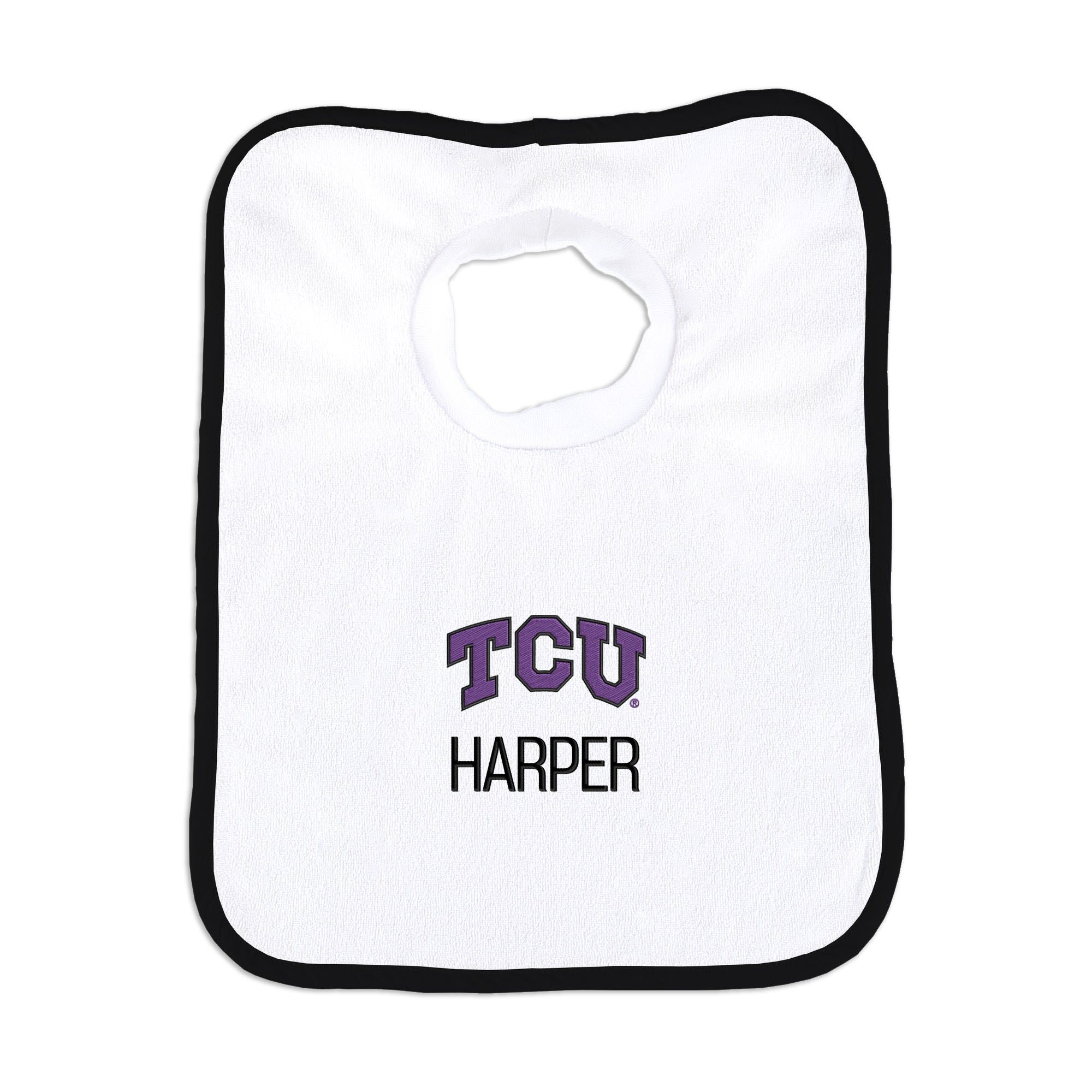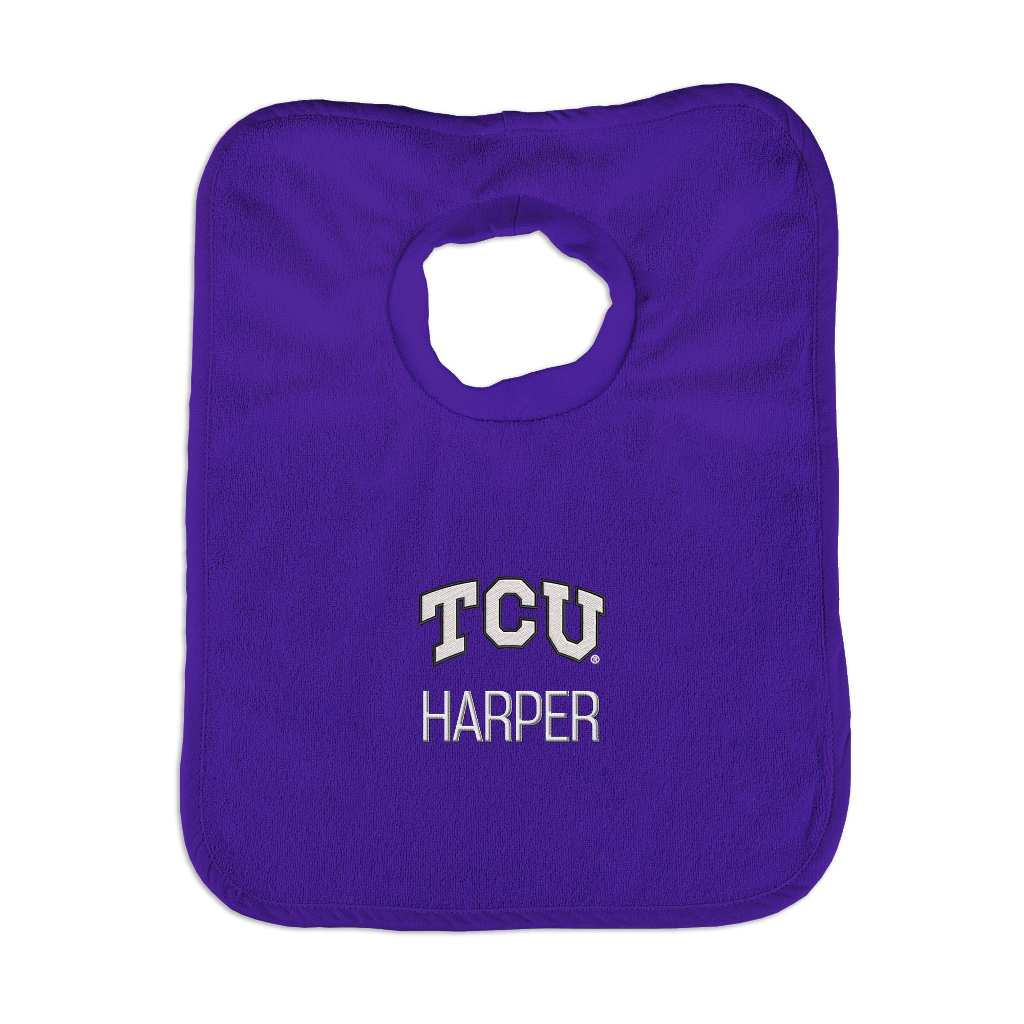 Dress your little Horned Frog in style with our Personalized TCU Horned Frogs Pullover Bib. This bib is a game day essential for your little fan! Crafted from stretch terry cloth, it offers a comfortable and snug fit with its stretchable neck hole. Featuring the iconic Horned Frogs logo, officially licensed by the university, this bib adds a touch of team spirit to every mealtime. Personalize it with your baby's name for an extra special touch. Whether it's for catching dribbles or spills, this pullover bib combines functionality with team pride seamlessly. Order the Personalized TCU Horned Frogs Pullover Bib today and let your little one showcase their team pride from mealtime to playtime!