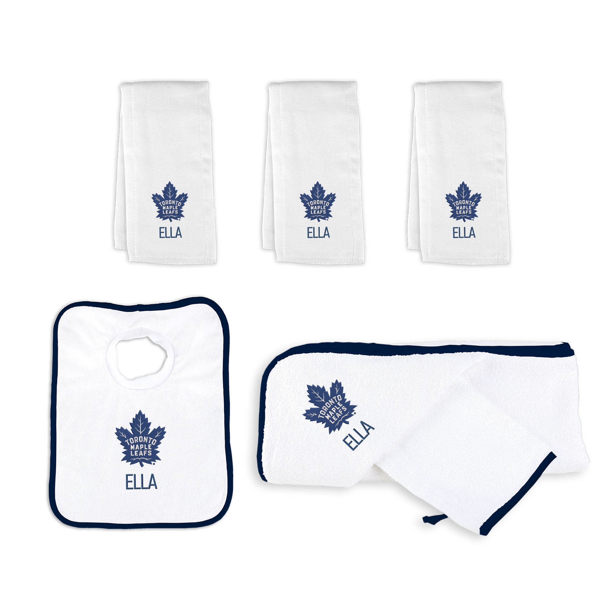 This personalized gift basket contains a trio of 100% cotton burp cloths, a 100% cotton terry pullover bib, and a 100% cotton terry hooded towel with a wash mitt. Each of these high-quality items is expertly embroidered with the iconic Toronto Maple Leafs logo, making them the ideal choice for young Leafs fans in the making.