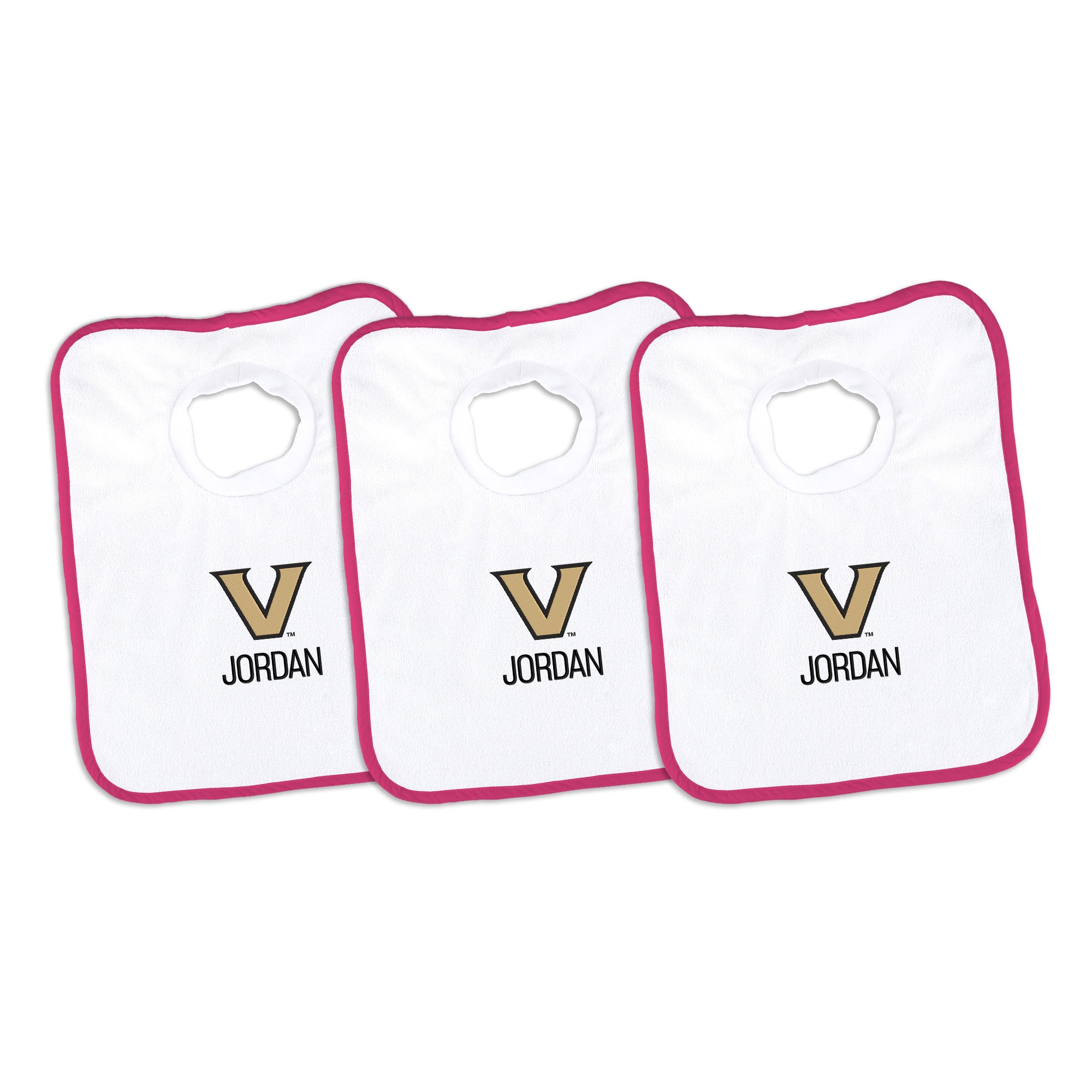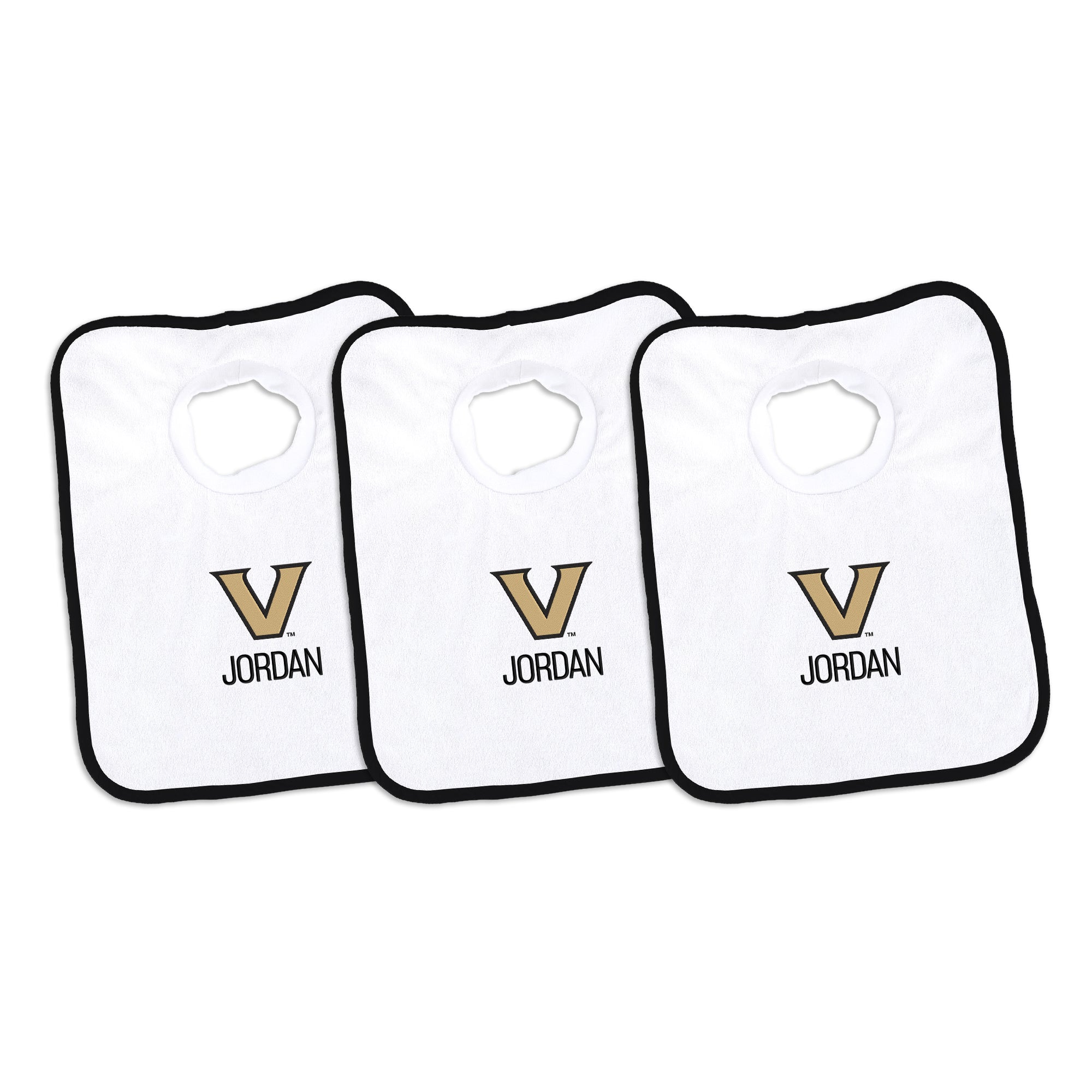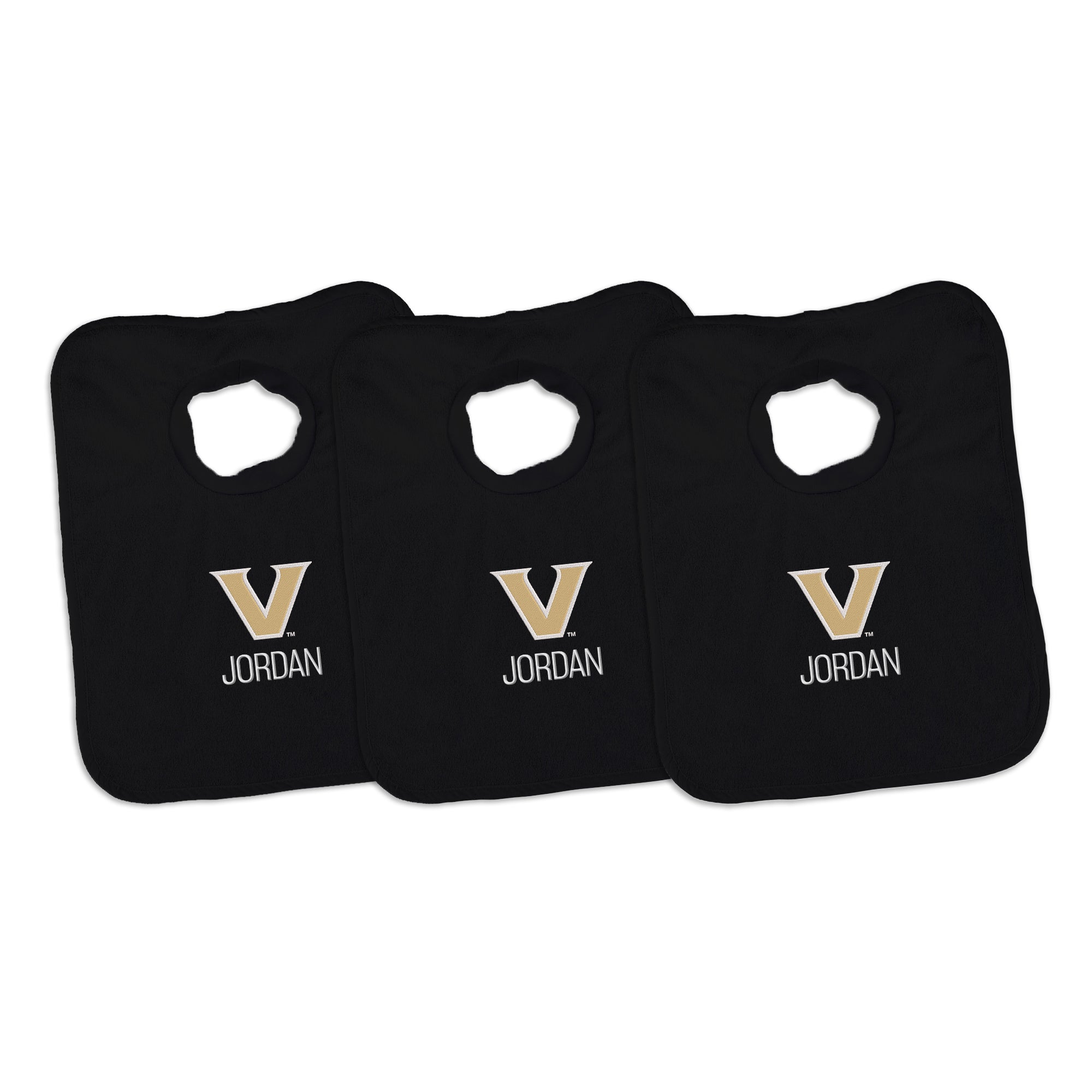 Our Personalized Vanderbilt Commodores Bibs are the perfect accessory for every baby Commodores fan. The Commodores bibs slip on easily over baby’s head, with a neck hole that is specially designed for extra comfort with super soft, gently gathered stretch cotton. Each bib is embroidered with the Commodores logo and your little one’s name or nickname. Makes a wonderful gift for new Commodores babies and their families.