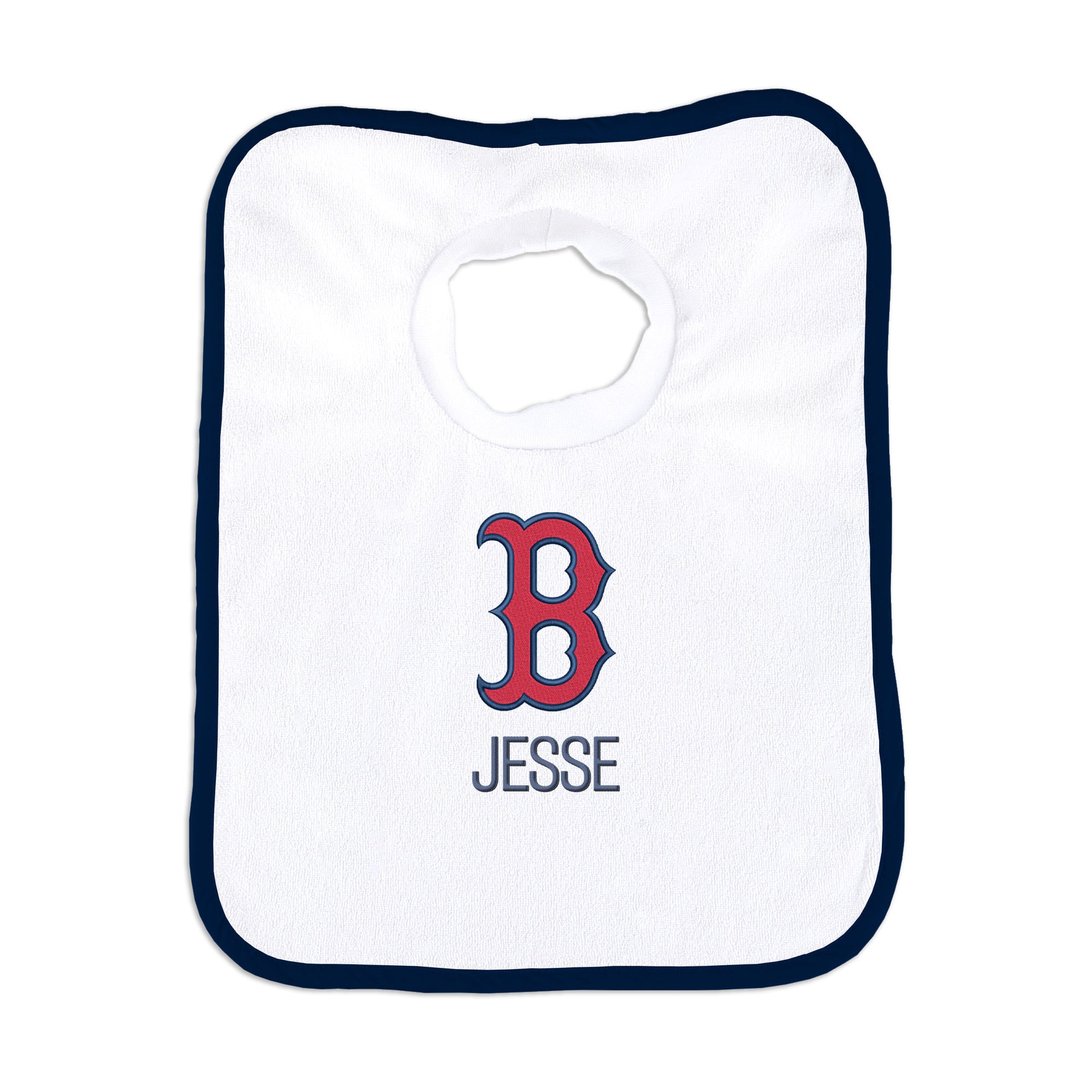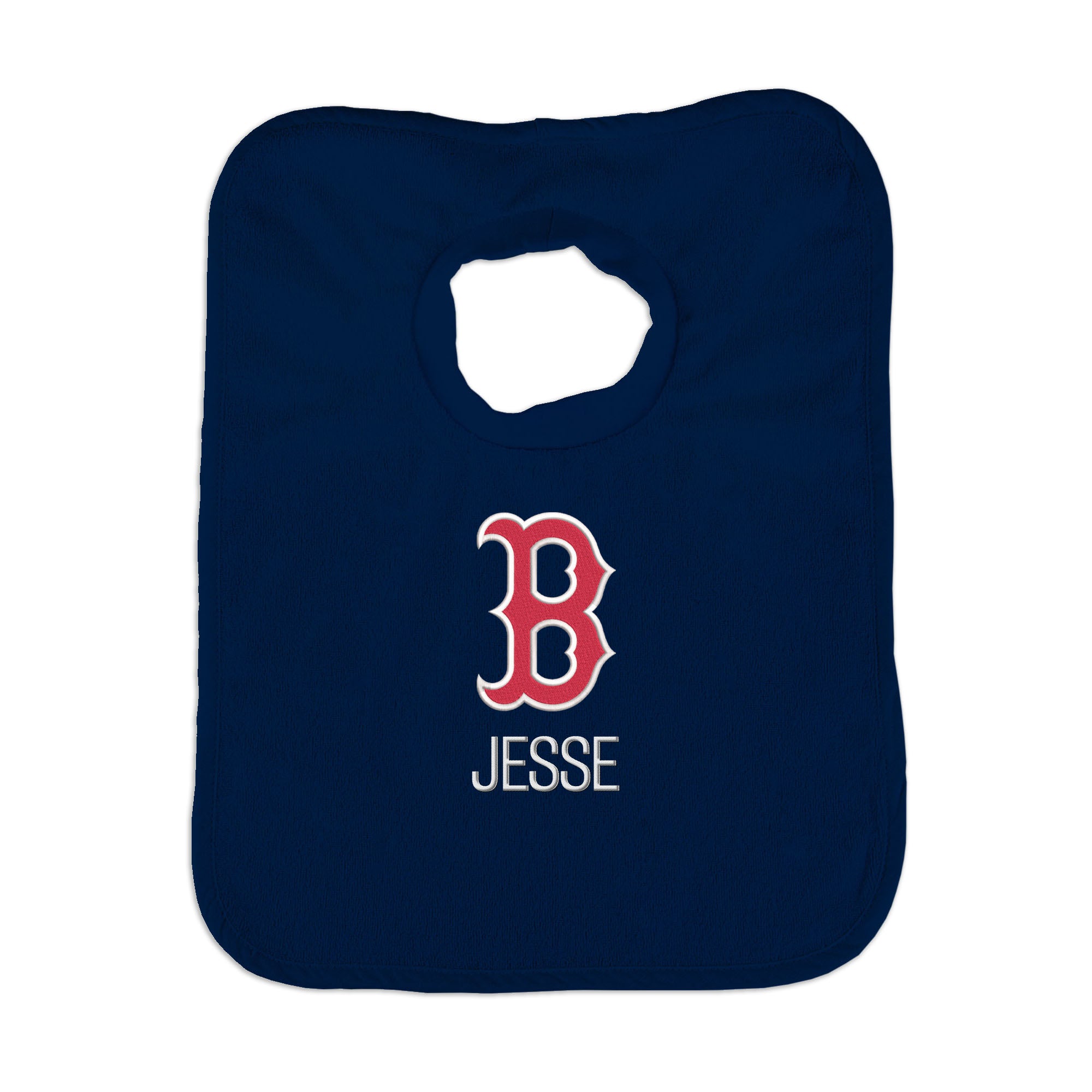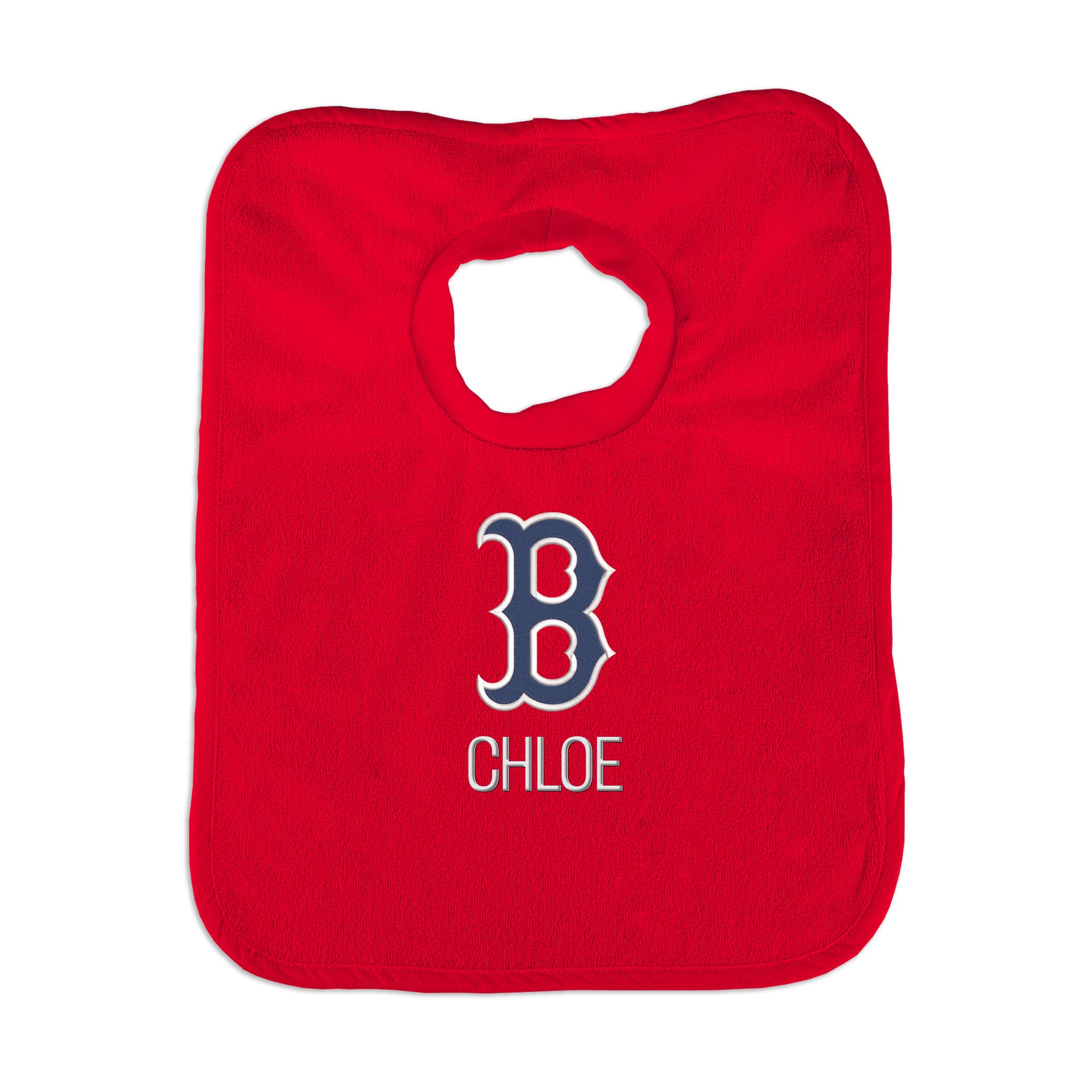 Our Personalized Boston Red Sox "B" Bib is the perfect accessory for every baby Red Sox fan. The Red Sox bib slips on easily over baby’s head, with a neck hole that is specially designed for extra comfort with super soft, gently gathered stretch cotton. Each bib is embroidered with the Red Sox logo and your little one’s name or nickname. Makes a wonderful gift for new babies and their families.