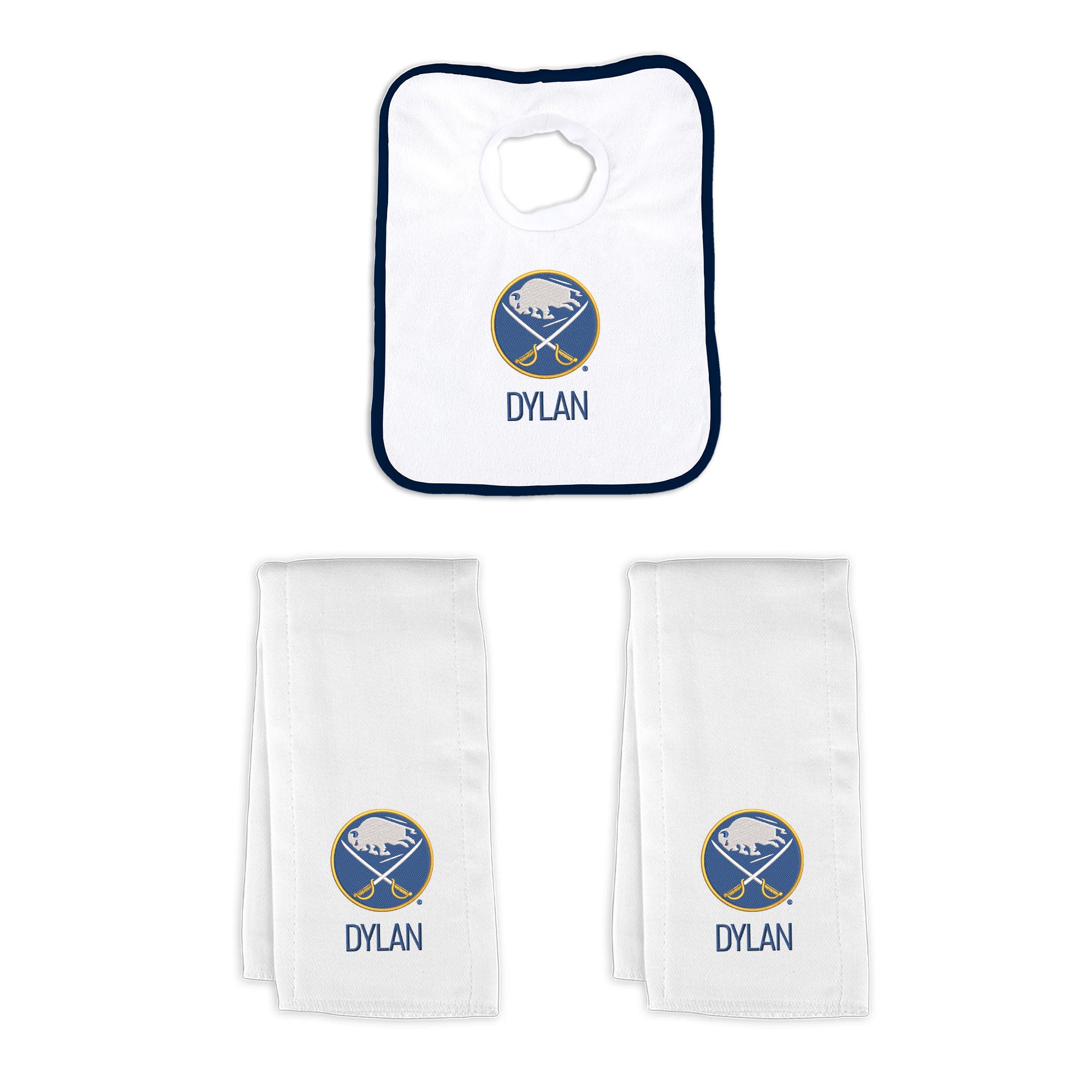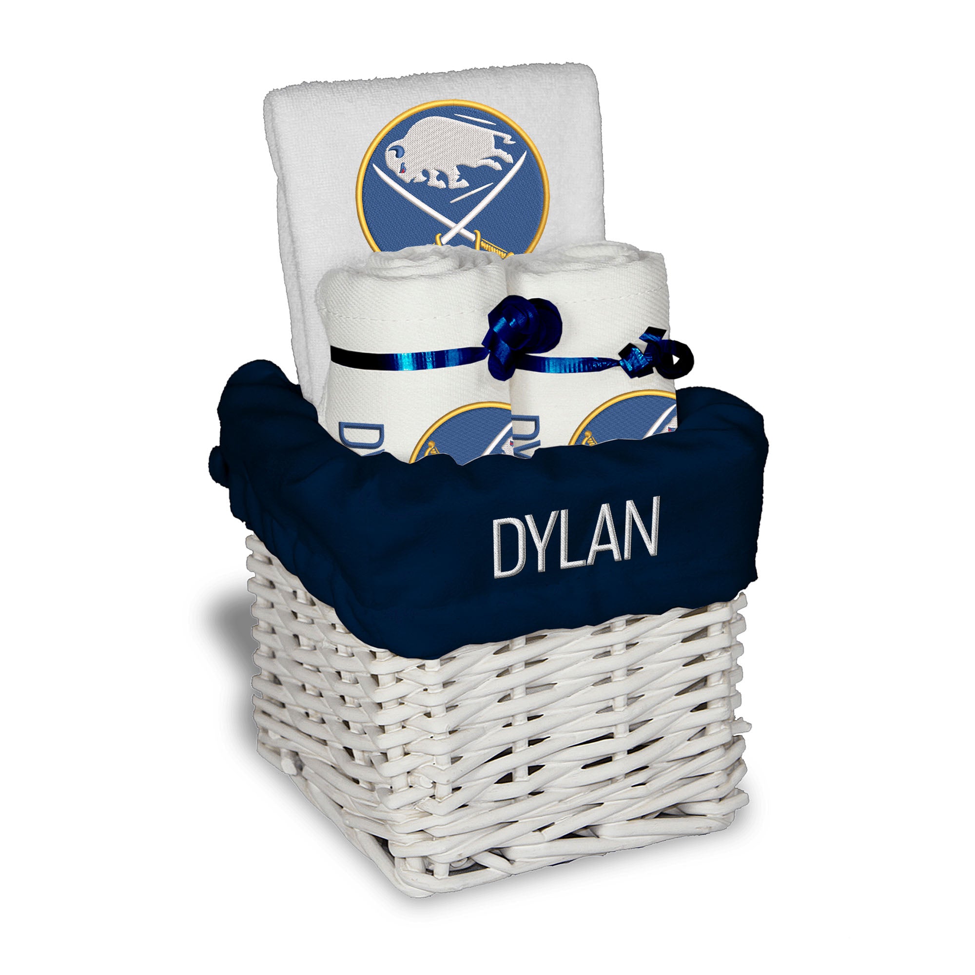 Our Personalized Buffalo Sabres Small Gift Basket contains 3 of our best-selling items packaged in a white willow basket with a personalized cotton liner.  Each basket holds 2 of our 100% cotton burp cloths and a 100% cotton terry pullover bib. each piece is embroidered with the official Sabres logo and baby's name or nickname.