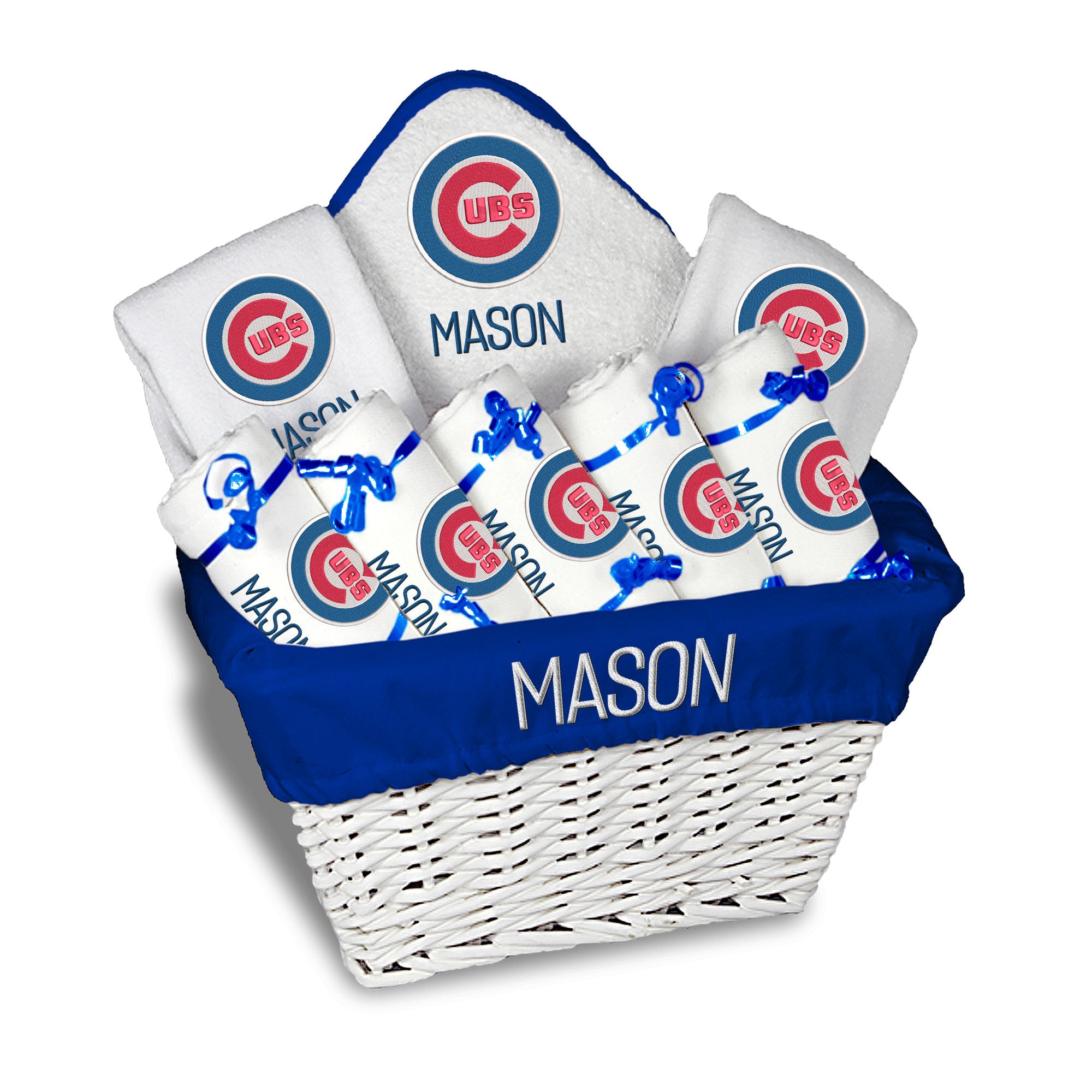 Our Personalized Chicago Cubs Large Gift Basket contains an assortment of our best-selling items packaged in a white willow basket with a personalized cotton liner.  Each basket holds five of our 100% cotton burp cloths, two 100% cotton terry pullover bibs, and one 100% cotton terry hooded towel and wash mitt. The burp cloths, bibs and hooded towel are each embroidered with the Cubs logo and baby’s name or nickname; the basket liner is embroidered with the baby’s name.