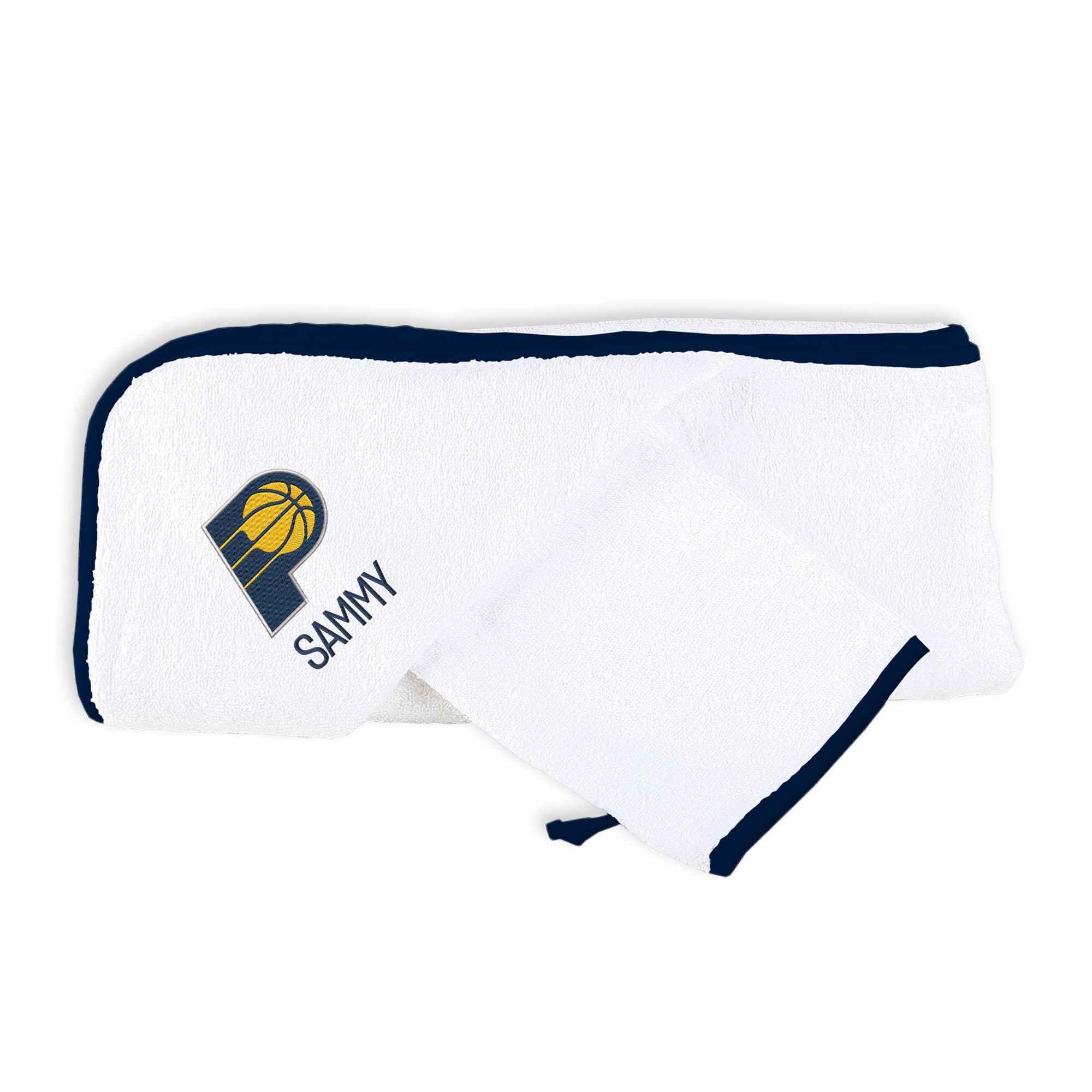 Pamper your youngest sports fan with our Officially Licensed Personalized Indiana Pacers Hooded Towel and Wash Mitt Set. Crafted from soft 100% cotton terry, the wash mitt fits over your hand for gentle sudsing and cleansing; then, wrap the baby up in the absorbent Pacers logoed hooded towel. The hooded corner of the towel keeps baby’s head warm while the generously sized towel wraps your future Hawk in cozy comfort. Each towel is embroidered with the official Indiana Pacers logo and baby’s name or nickname.