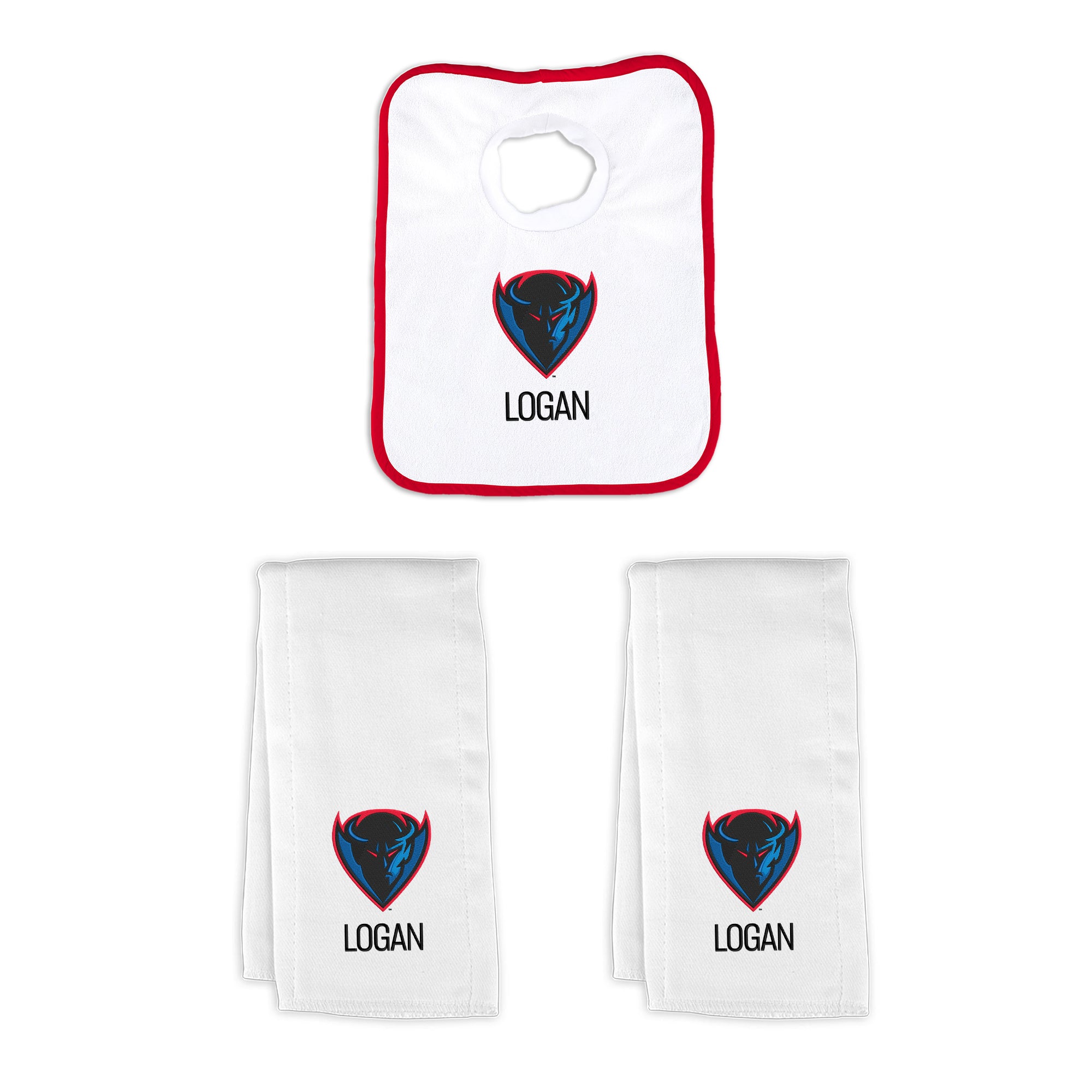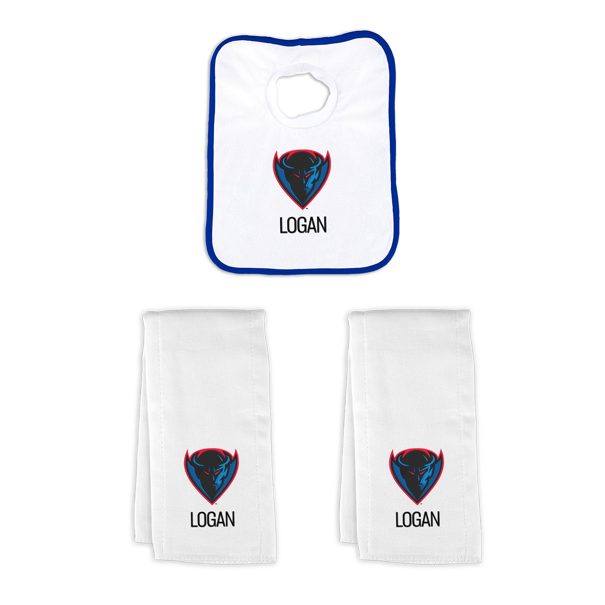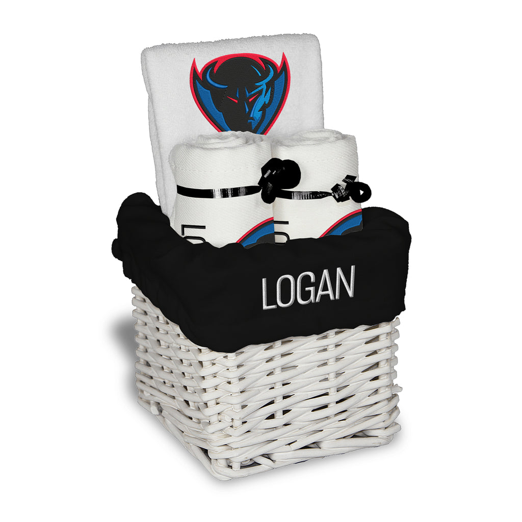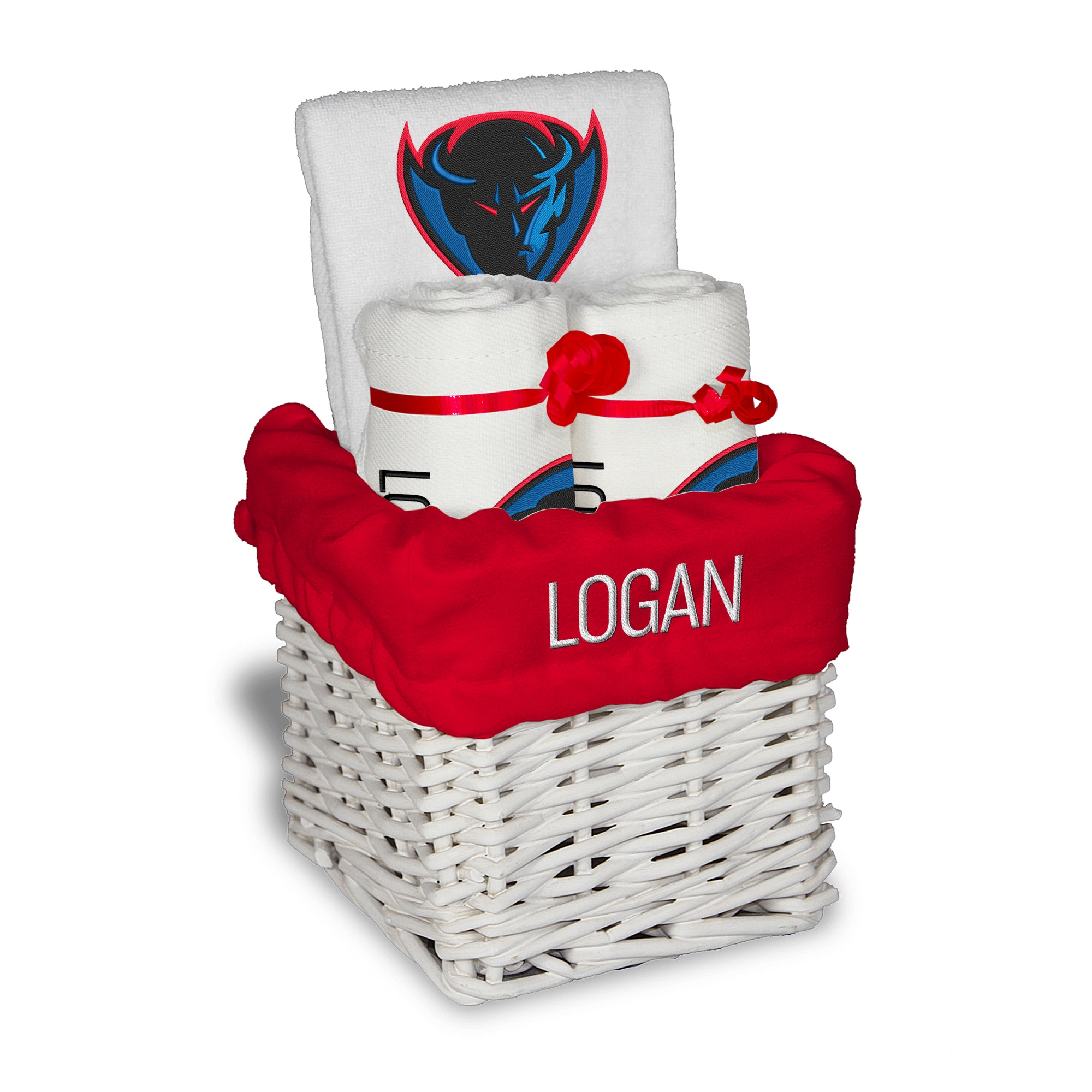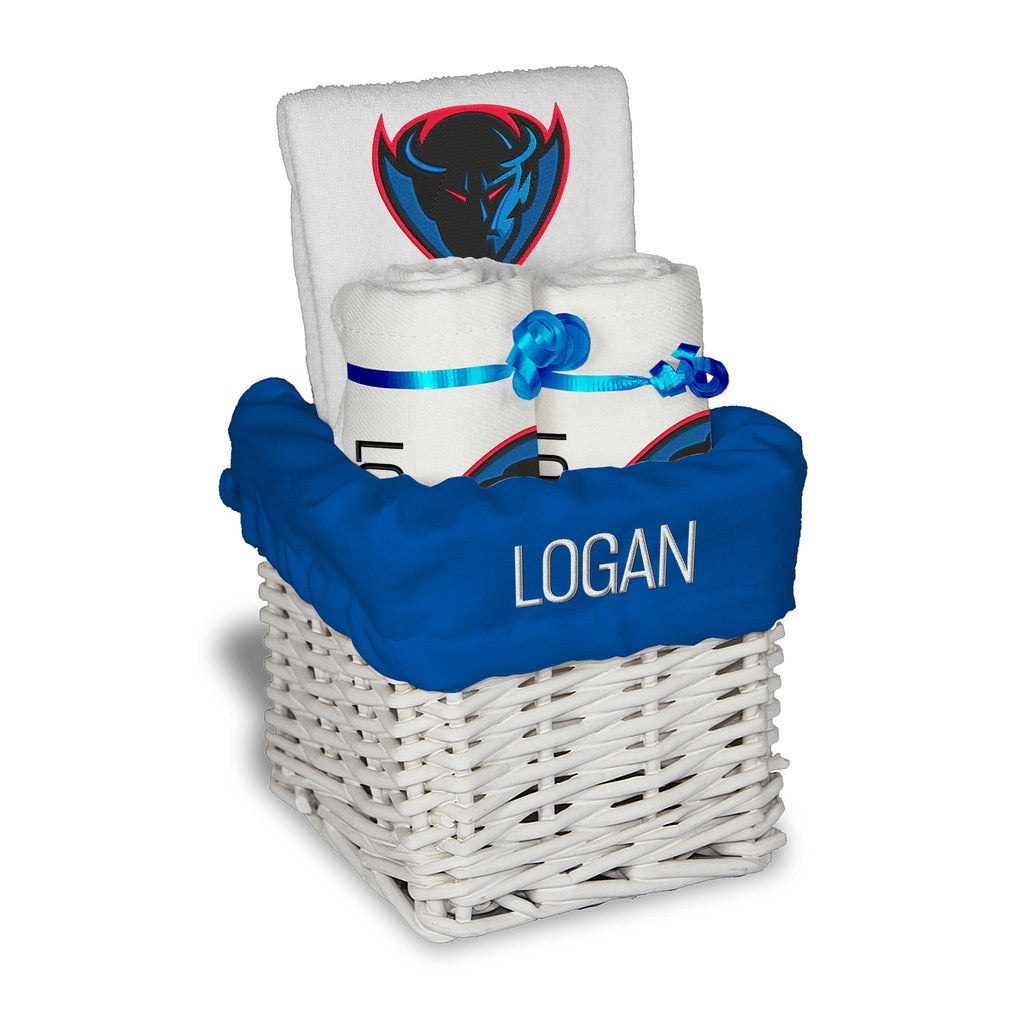 Our Personalized DePaul Blue Demons Small Gift Basket contains 3 of our best-selling items packaged in a white willow basket with a personalized cotton liner.  Each basket holds 2 of our 100% cotton burp cloths and a 100% cotton terry pullover bib. each piece is embroidered with the official Blue Demons logo and baby's name or nickname.
