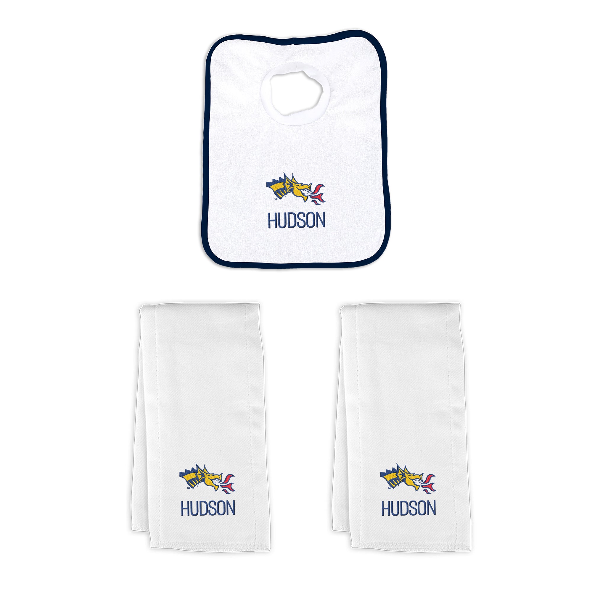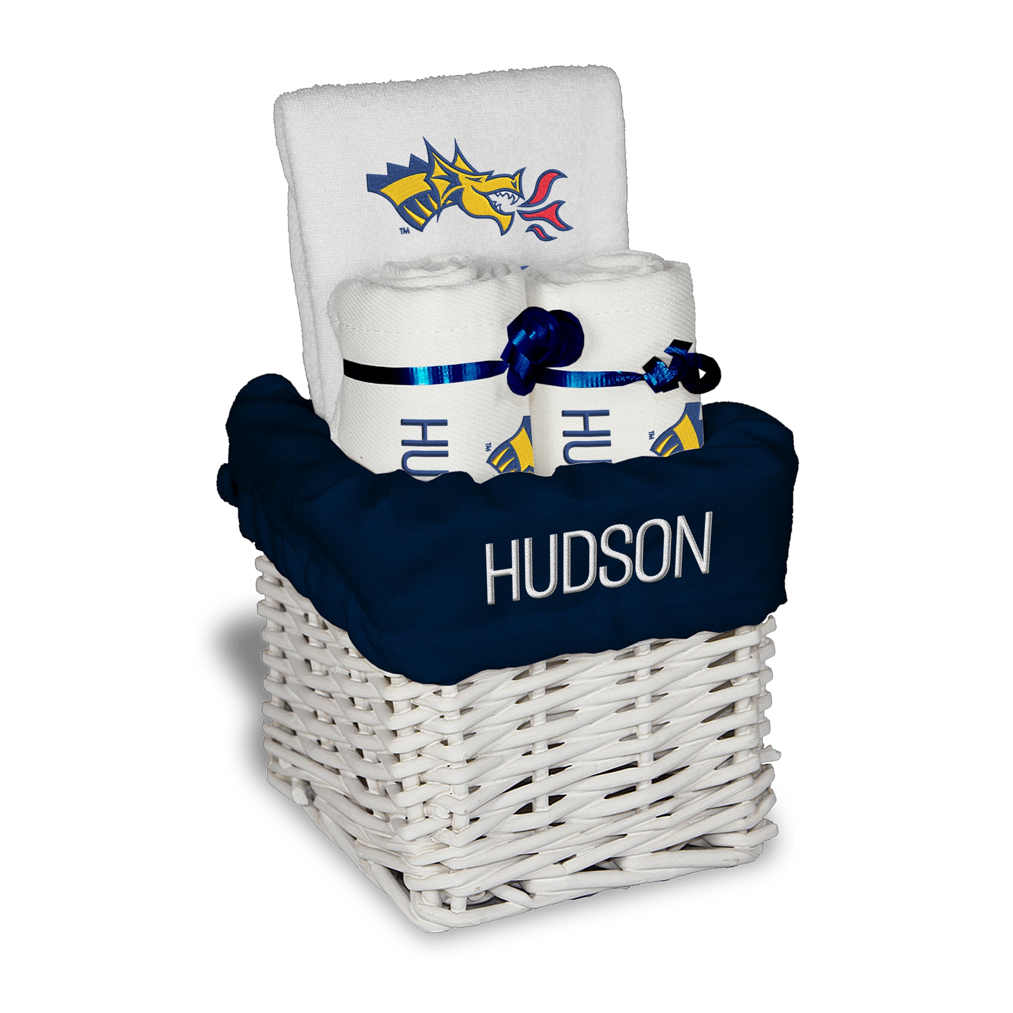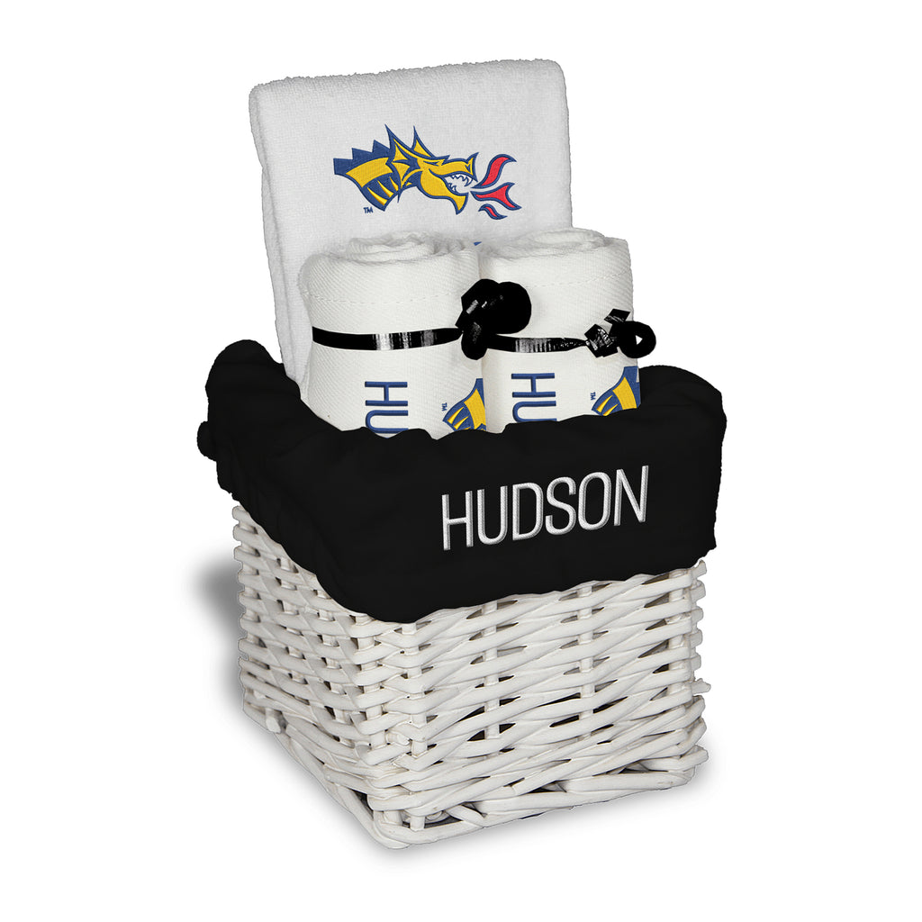Our Personalized Drexel Dragons Small Gift Basket contains 3 of our best-selling items packaged in a white willow basket with a personalized cotton liner.  Each basket holds 2 of our 100% cotton burp cloths and a 100% cotton terry pullover bib. each piece is embroidered with the official Dragons logo and baby's name or nickname.