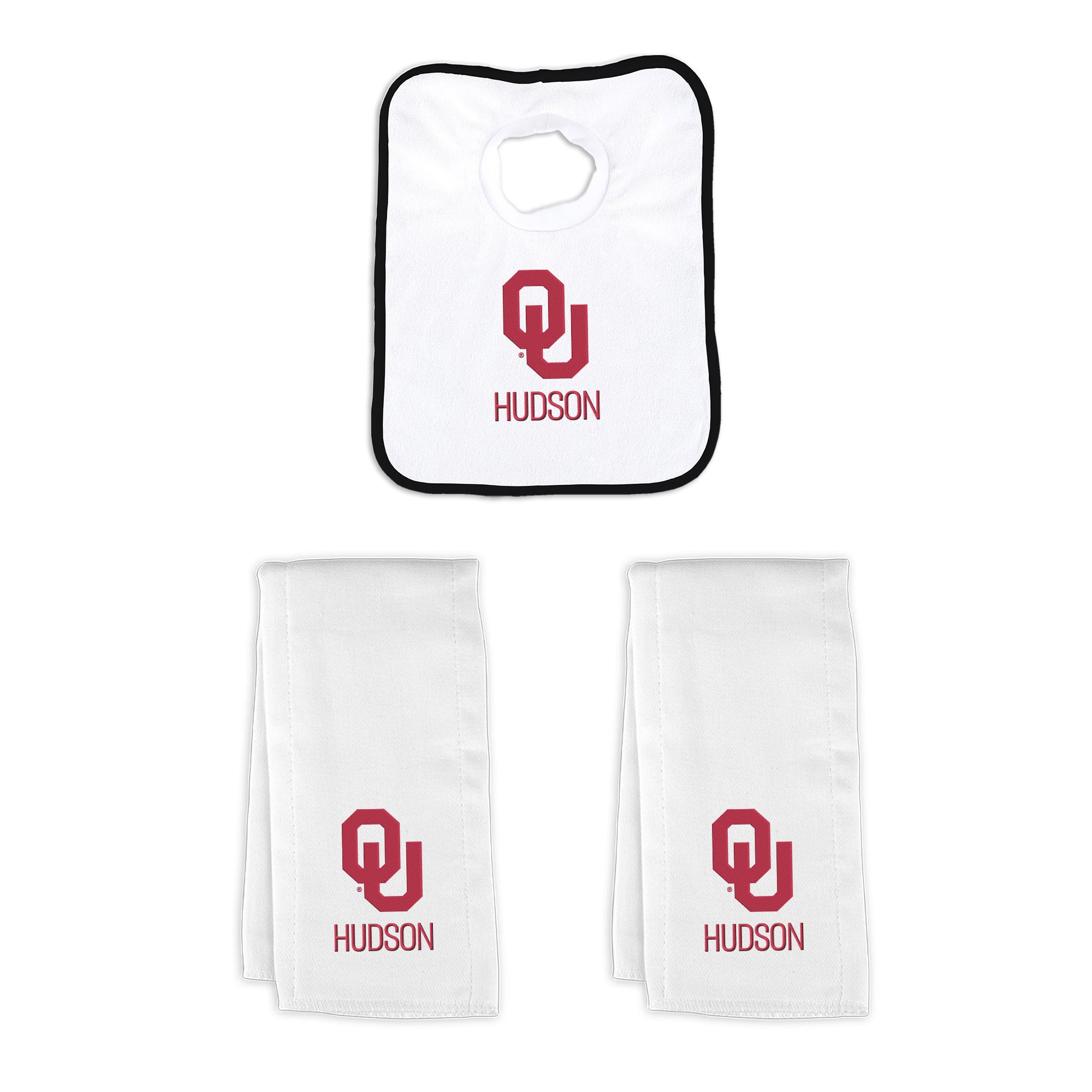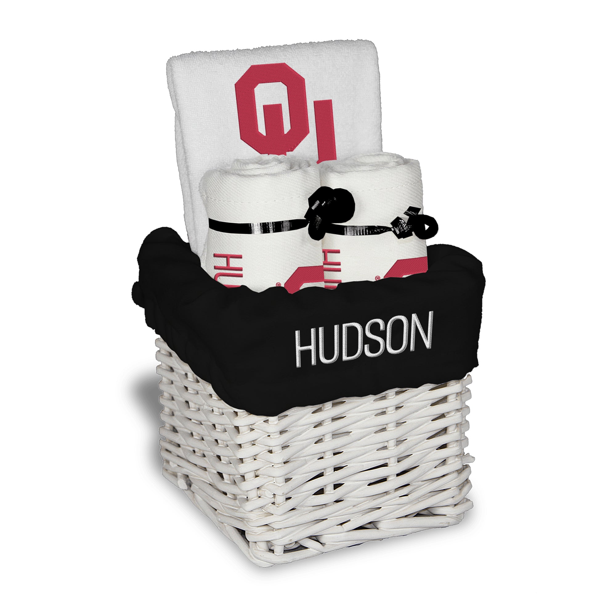 Our Personalized Oklahoma Sooners Small Gift Basket contains 3 of our best-selling items packaged in a white willow basket with a personalized cotton liner.  Each basket holds 2 of our 100% cotton burp cloths and a 100% cotton terry pullover bib. each piece is embroidered with the official Sooners logo and baby's name or nickname.
