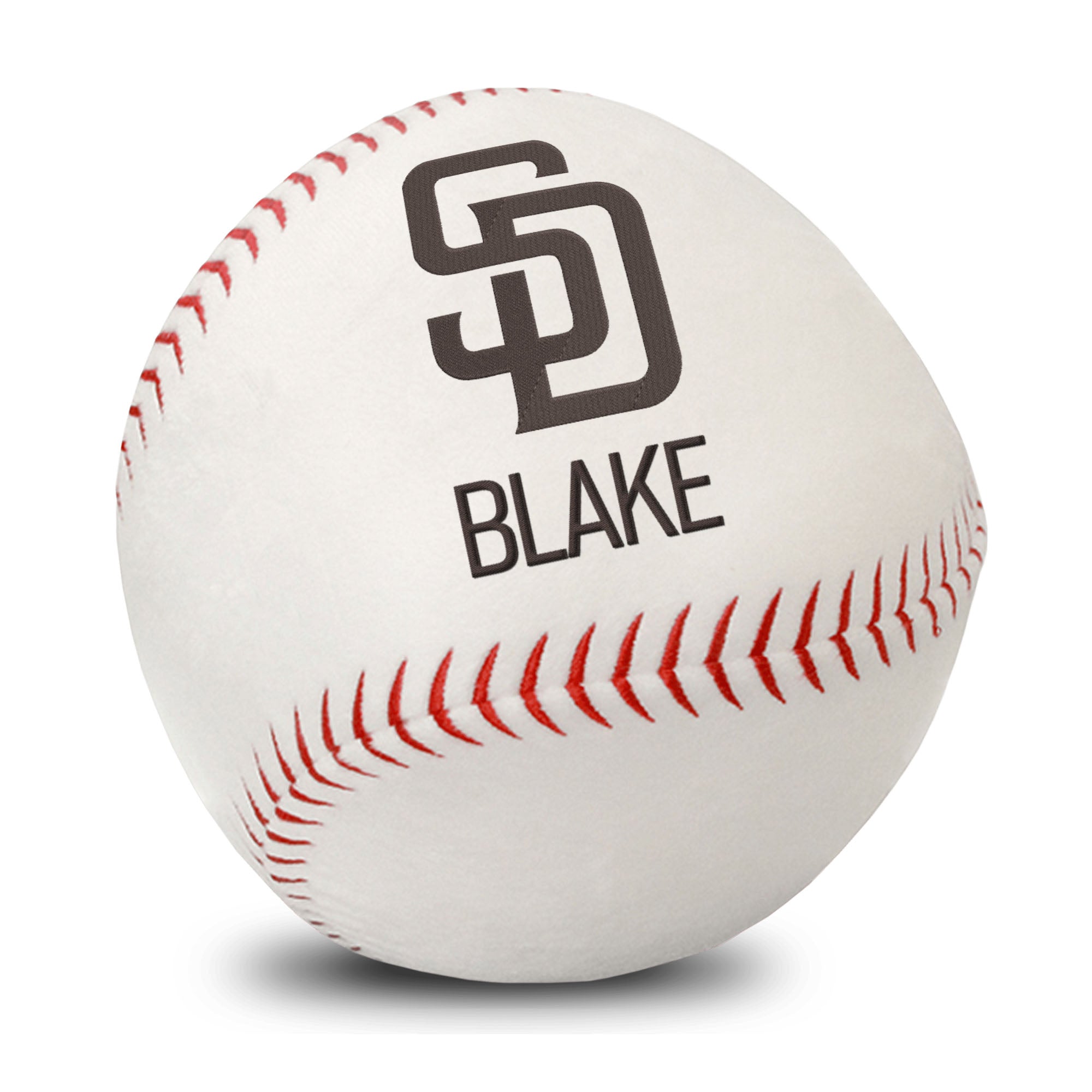 Our Personalized San Diego Padres Plush Baseball is a terrific gift for any family of Padres fans.  Each ball is embroidered with the official Padres logo and your little one’s name or nickname.  Add some team spirit to the decor of a bedroom or playroom with this oversize baseball, which becomes a fun plaything for toddlers and older kids.  With a removable cover for easy cleaning, our Padres ball is great for years of fun and entertainment.