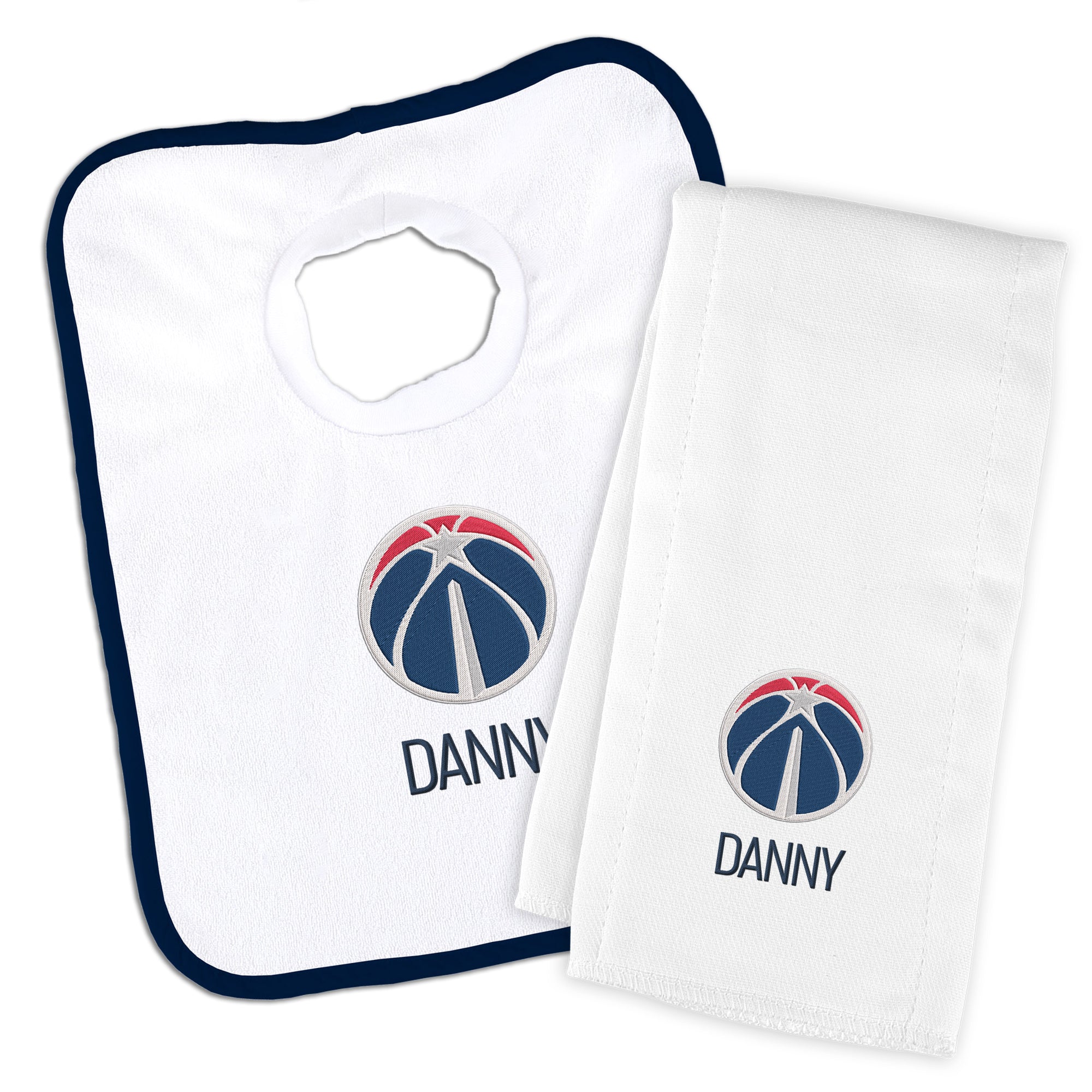Our Personalized Washington Wizards Bib and Burp Cloth Set is a thoughtful and useful gift for every baby Wizards fan. The Wizards burp cloth is generously sized and made of soft, absorbent 100% cotton, and the Wizards bib has a soft, stretchable cotton neck hole for baby’s comfort. Parents, the bib slips easily over your baby's head and features a soft, gently gathered stretch cotton neck hole for maximum comfort; also, the burp cloth is a must-have asset.