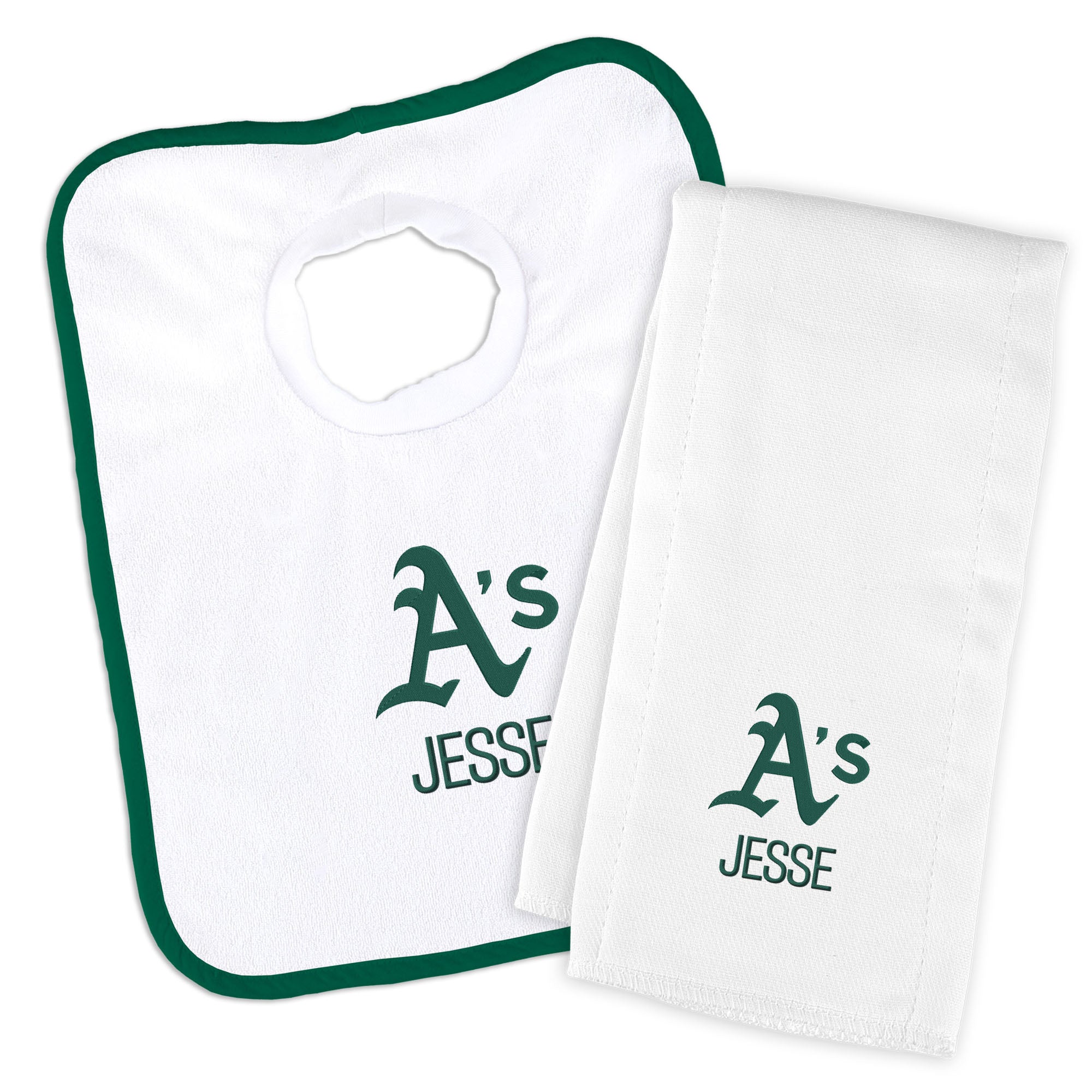 Our Personalized Oakland Athletics Bib and Burp Cloth Set is a thoughtful and useful gift for every baby Athletics fan. The Athletics burp cloth is generously sized and made of soft, absorbent 100% cotton, and the Athletics bib has a soft, stretchable cotton neck hole for baby’s comfort. Parents, the bib slips easily over your baby's head and features a soft, gently gathered stretch cotton neck hole for maximum comfort; also, the burp cloth is a must-have asset.