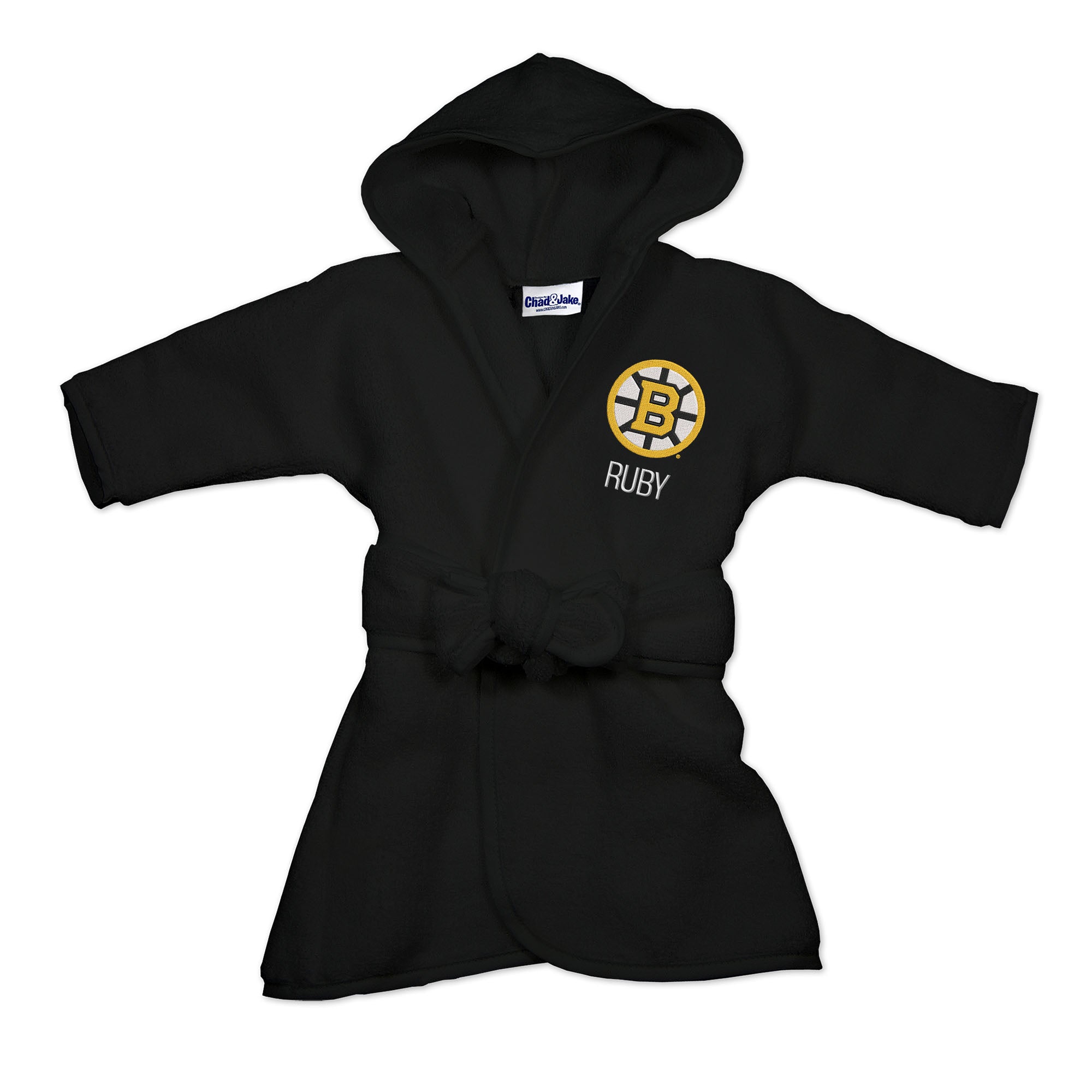 Our Personalized Boston Bruins Infant Robe is a fun and practical accessory for every little Bruins fan. Each robe is embroidered with the official Boston Bruins logo and your own little one’s name or nickname. What a great way for even the youngest fans to support their team and show Bruins pride! Kids can wrap up after a bath or shower, cover up and dry off after swimming, or relax at home in the comfort of this plush Bruins robe sized just for them.