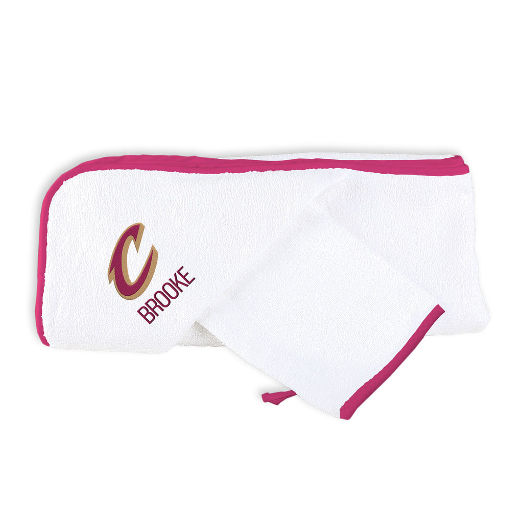 Pamper your youngest sports fan with our Officially Licensed Personalized Cleveland Cavaliers Hooded Towel and Wash Mitt Set. Crafted from soft 100% cotton terry, the wash mitt fits over your hand for gentle sudsing and cleansing; then, wrap the baby up in the absorbent Cavaliers logo hooded towel. The hooded corner of the towel keeps baby’s head warm while the generously sized towel wraps your future Hawk in cozy comfort. Each towel is embroidered with the official Cleveland Cavaliers logo and baby’s name or nickname.