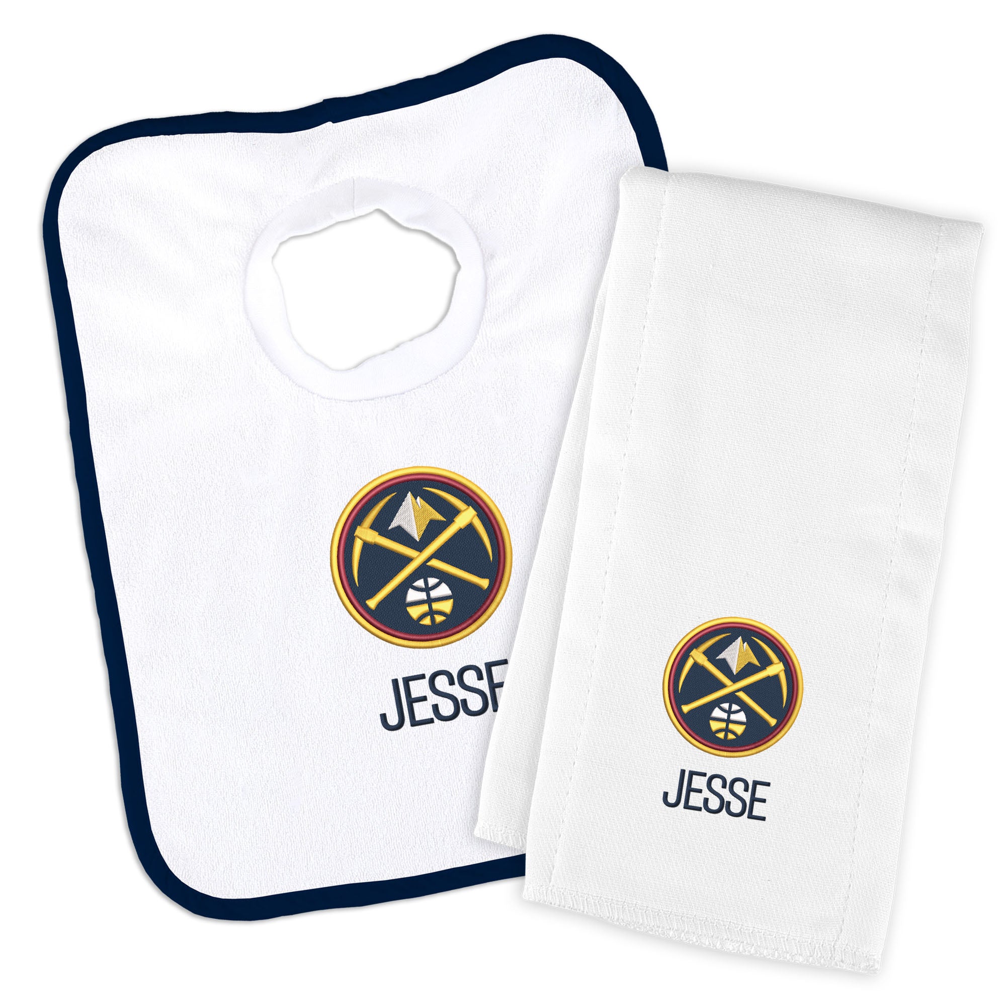 Our Personalized Denver Nuggets Bib and Burp Cloth Set is a thoughtful and useful gift for every baby Nuggets fan. The Nuggets burp cloth is generously sized and made of soft, absorbent 100% cotton, and the Nuggets bib has a soft, stretchable cotton neck hole for baby’s comfort. Parents, the bib slips easily over your baby's head and features a soft, gently gathered stretch cotton neck hole for maximum comfort; also, the burp cloth is a must-have asset.