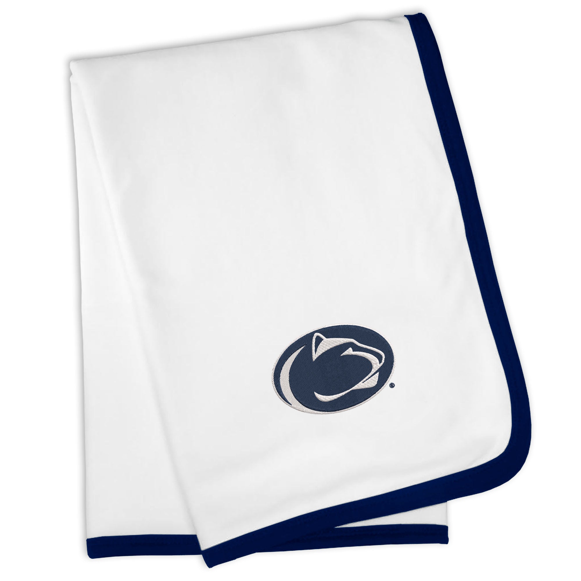 Our Penn State Nittany Lions Blanket is sized just right for a baby baseball fan. Constructed from super soft 100% cotton jersey knit and trimmed in Penn State Nittany Lions team colors, this blanket is perfect for walks in the stroller or swaddling at bedtime.  Each blanket is embroidered with the official Penn State Nittany Lions logo.