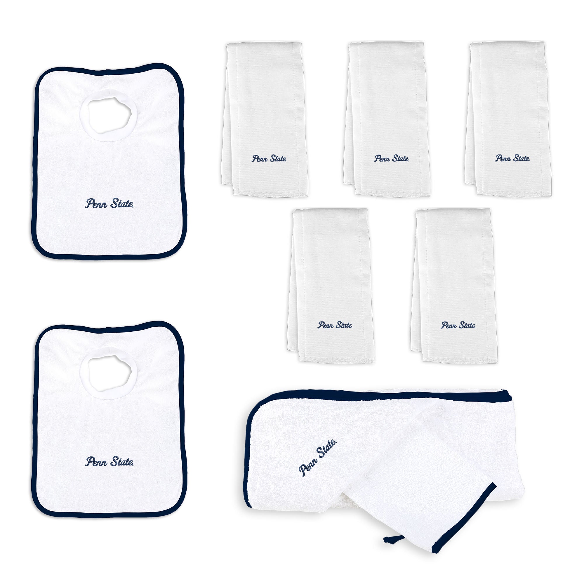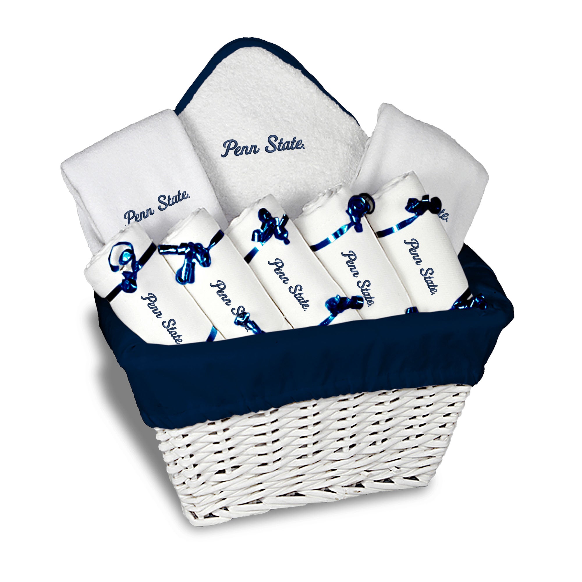 Our Penn State Nittany Lions Large Gift Basket contains an assortment of our best-selling items packaged in a white willow basket with a cotton liner.  Each basket holds five of our 100% cotton burp cloths, two 100% cotton terry pullover bibs, and one 100% cotton terry hooded towel and wash mitt. The burp cloths, bibs and hooded towel are each embroidered with the Penn State Nittany Lions logo.