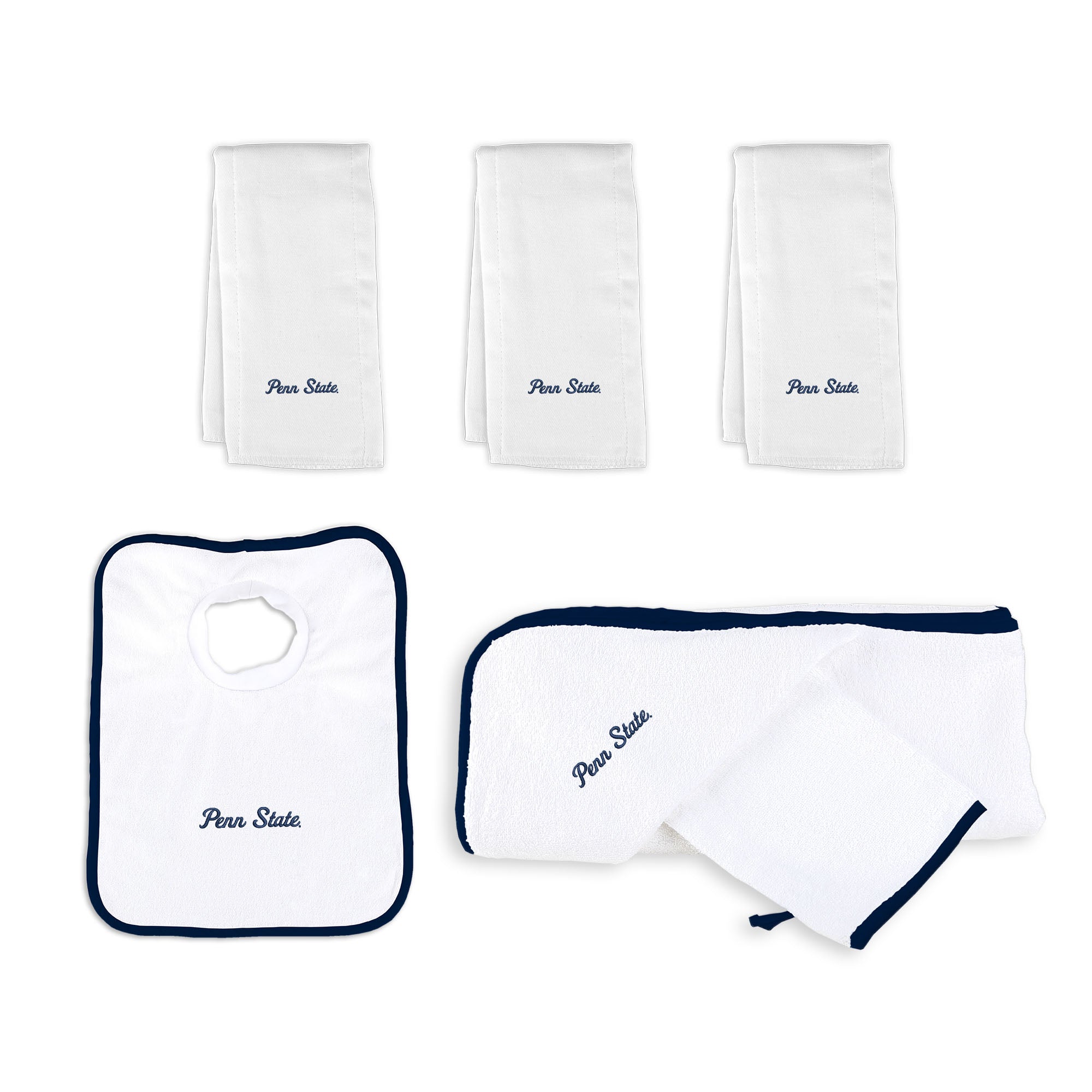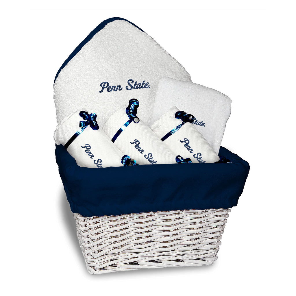 Our Penn State Nittany Lions Medium Gift Basket contains an assortment of our best-selling items packaged in a white willow basket with a cotton liner.  Each basket holds 3 of our 100% cotton burp cloths, one 100% cotton terry pullover bib, and one 100% cotton terry hooded towel and wash mitt. The burp cloths, bib and hooded towel are each embroidered with the Penn State Nittany Lions logo.