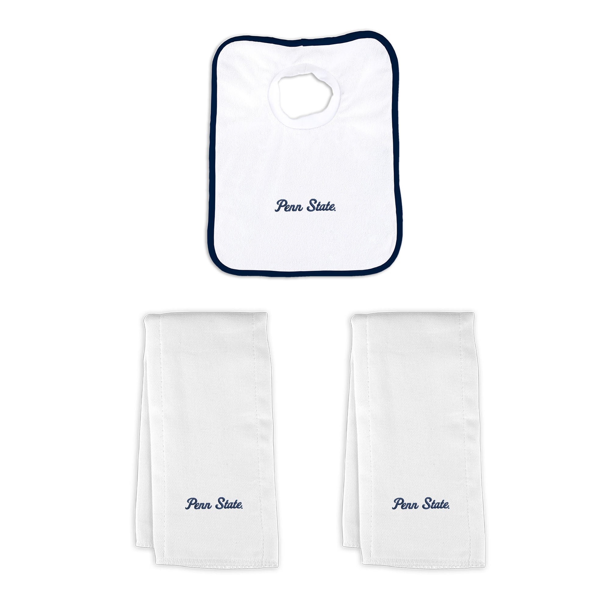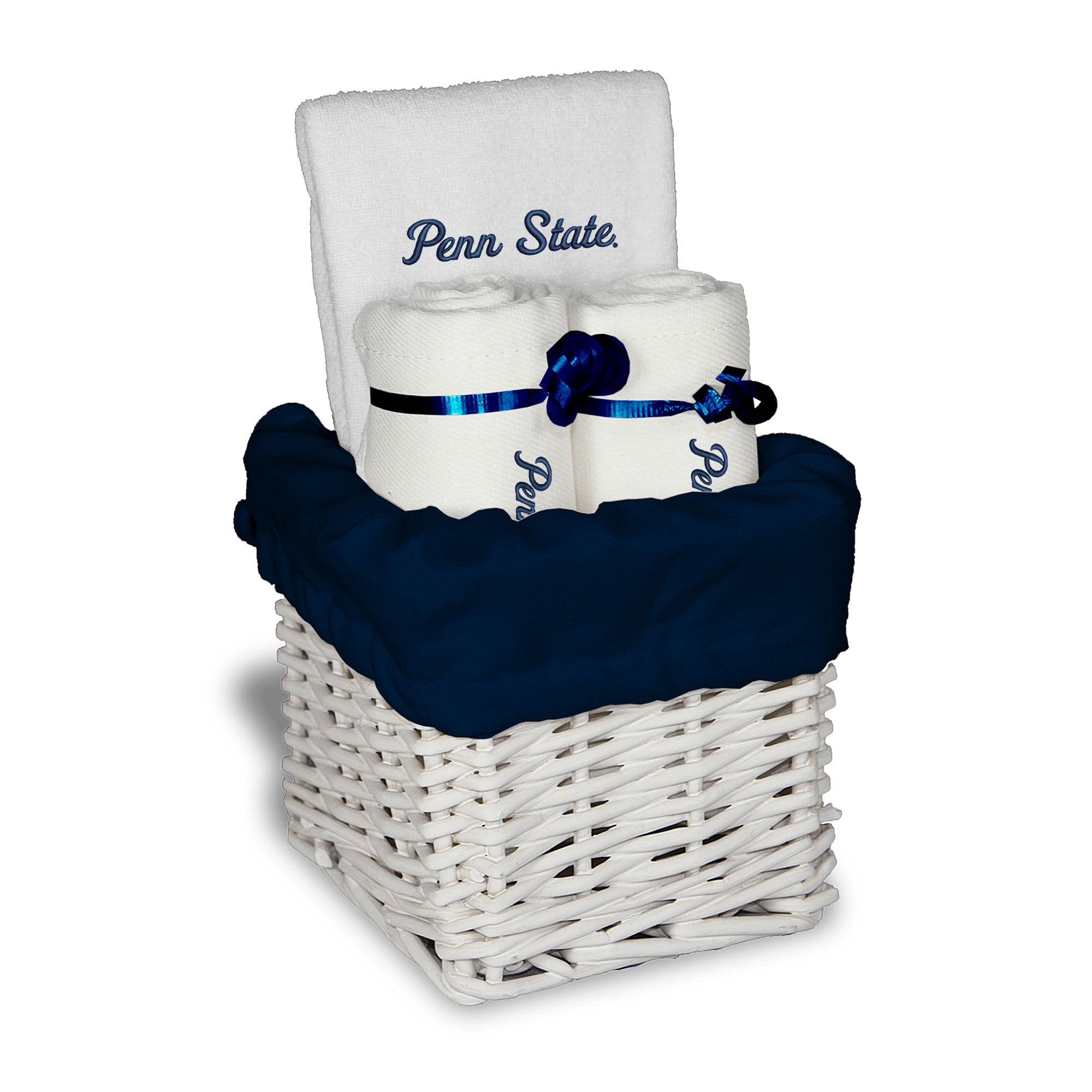 Our Penn State Nittany Lions Small Gift Basket contains 3 of our best-selling items packaged in a white willow basket with a cotton liner.  Each basket holds 2 of our 100% cotton burp cloths and a 100% cotton terry pullover bib. Each piece is embroidered with the official Penn State Nittany Lions logo.