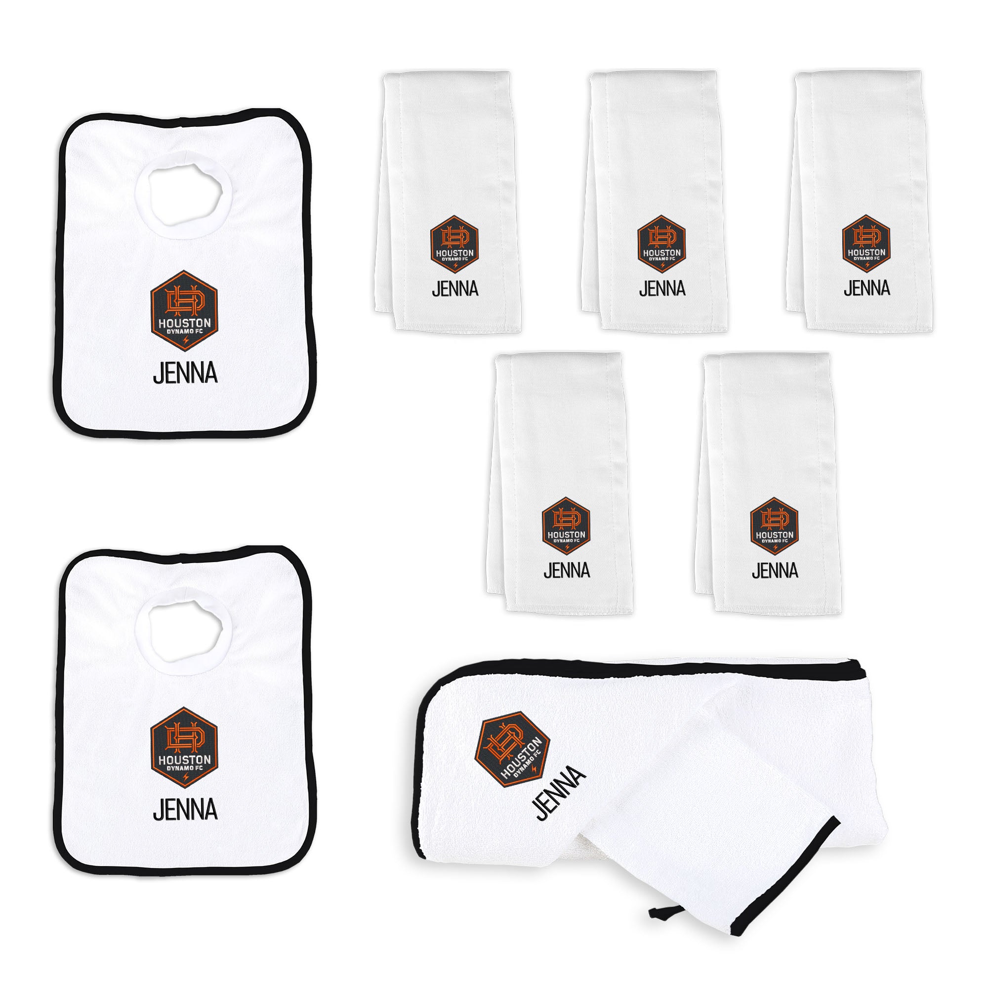 • Every burp cloth, bib, and hooded towel showcases intricate embroidery of the iconic Houston Dynamo logo, paired with your baby's personalized name or nickname