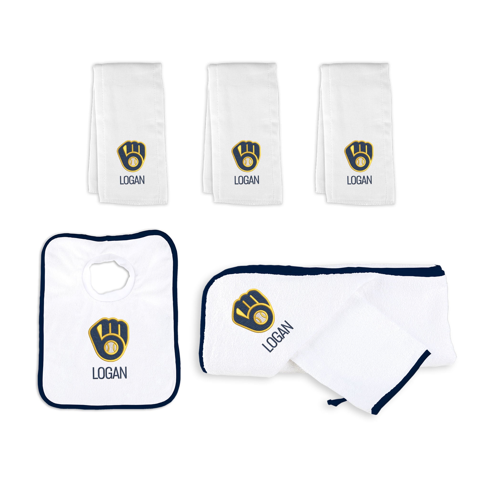 • 1 100% cotton terry hooded towel and wash mitt set, both adorned with the Milwaukee Brewers logo and your baby's name.