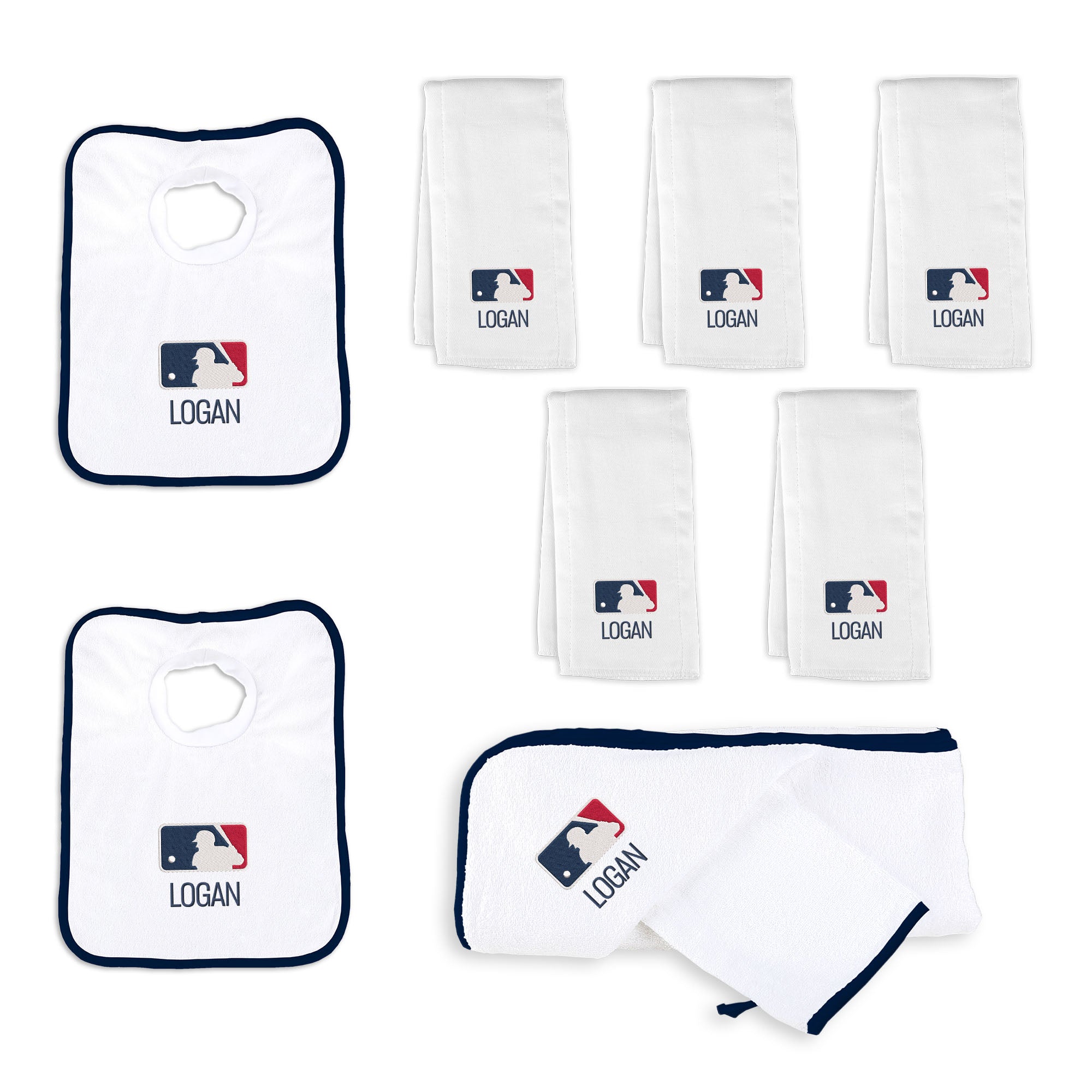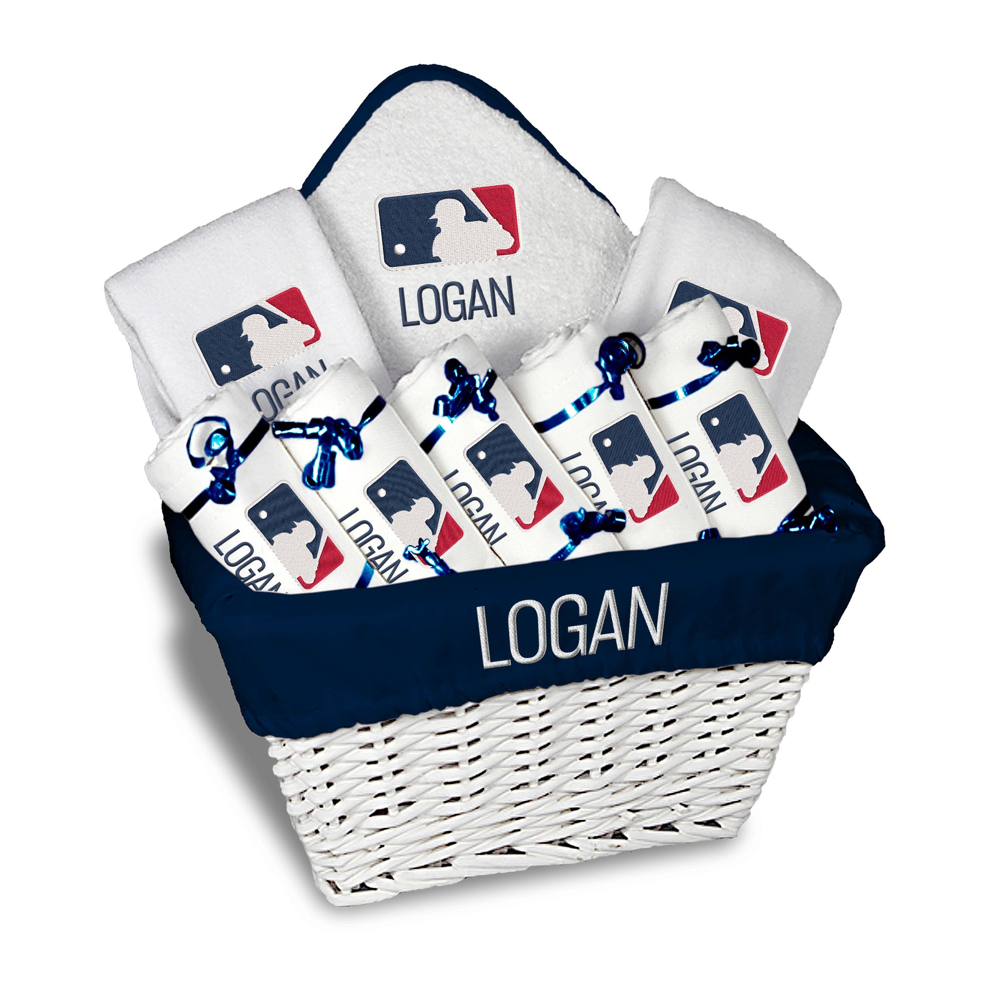 Our Personalized MLB Batter Large Gift Basket contains an assortment of our best-selling items packaged in a white willow basket with a personalized cotton liner. Each basket holds five of our 100% cotton burp cloths, two 100% cotton terry pullover bibs, and one 100% cotton terry hooded towel and wash mitt. The burp cloths, bibs and hooded towel are each embroidered with the MLB logo and baby’s name or nickname; the basket liner is embroidered with the baby’s name.