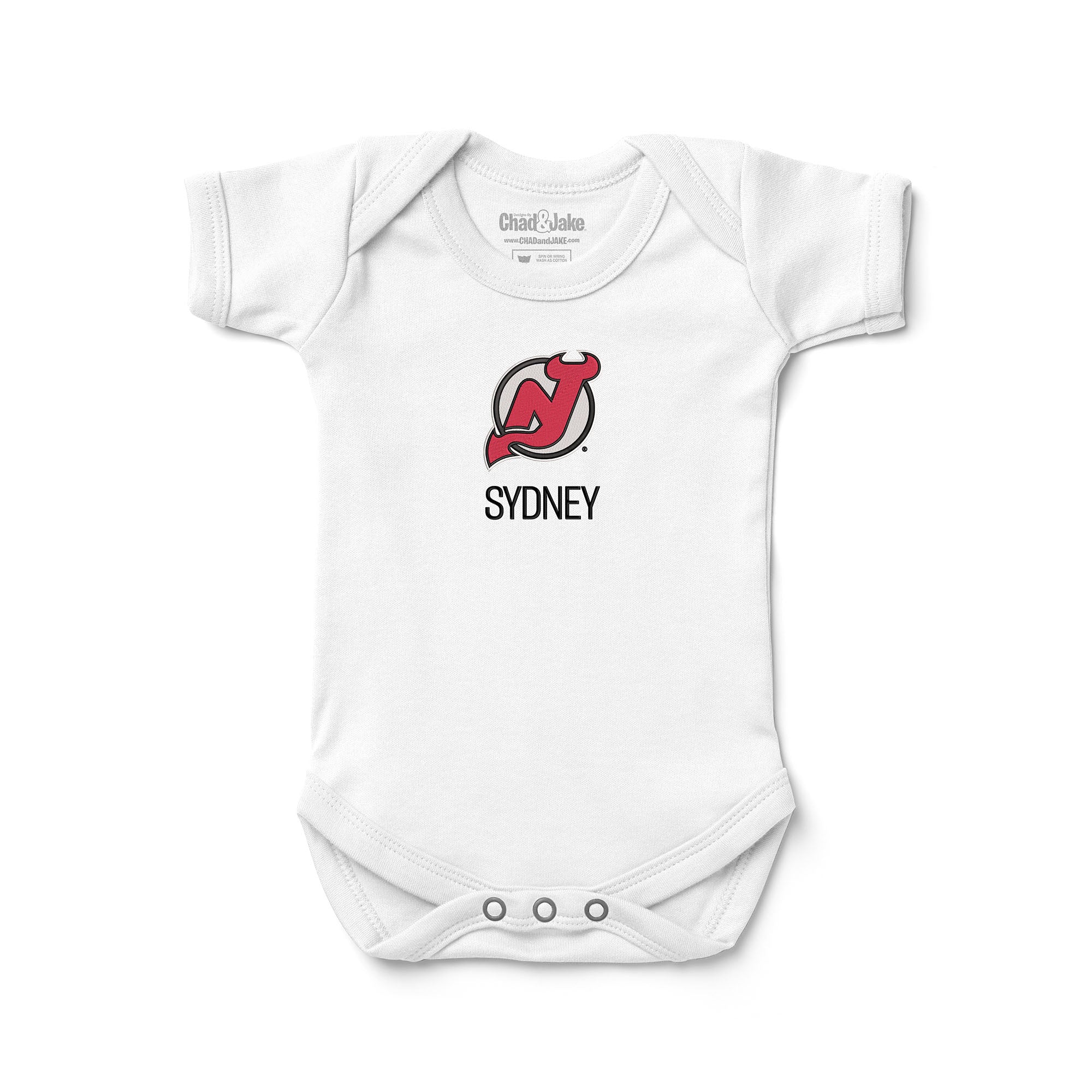 Our New Jersey Devils bodysuit is the perfect way for fans of all ages to show off their team spirit. Made from 100% super-soft interlock cotton, this bodysuit is comfortable and easy to wear. The envelope neck and three-snap closure make it easy to put on and take off, and it's machine washable and tumble dryable for easy care. But the best part about this bodysuit is the personalized embroidery on the front. With the iconic Devils logo and your little one's name, initials, or nickname under the logo, everyone will know where your allegiance lies. Join the ranks of loyal Devils fans at the Prudential Center and cheer on your team to victory. With numerous awards and championships under their belt, including three Stanley Cup titles, the Devils are a force to be reckoned with. Root for your team alongside mascot NJ Devil and legendary players such as Martin Brodeur and Scott Stevens. Get your little one ready to represent the New Jersey Devils in style with this personalized bodysuit. Order yours today and let your team pride shine.