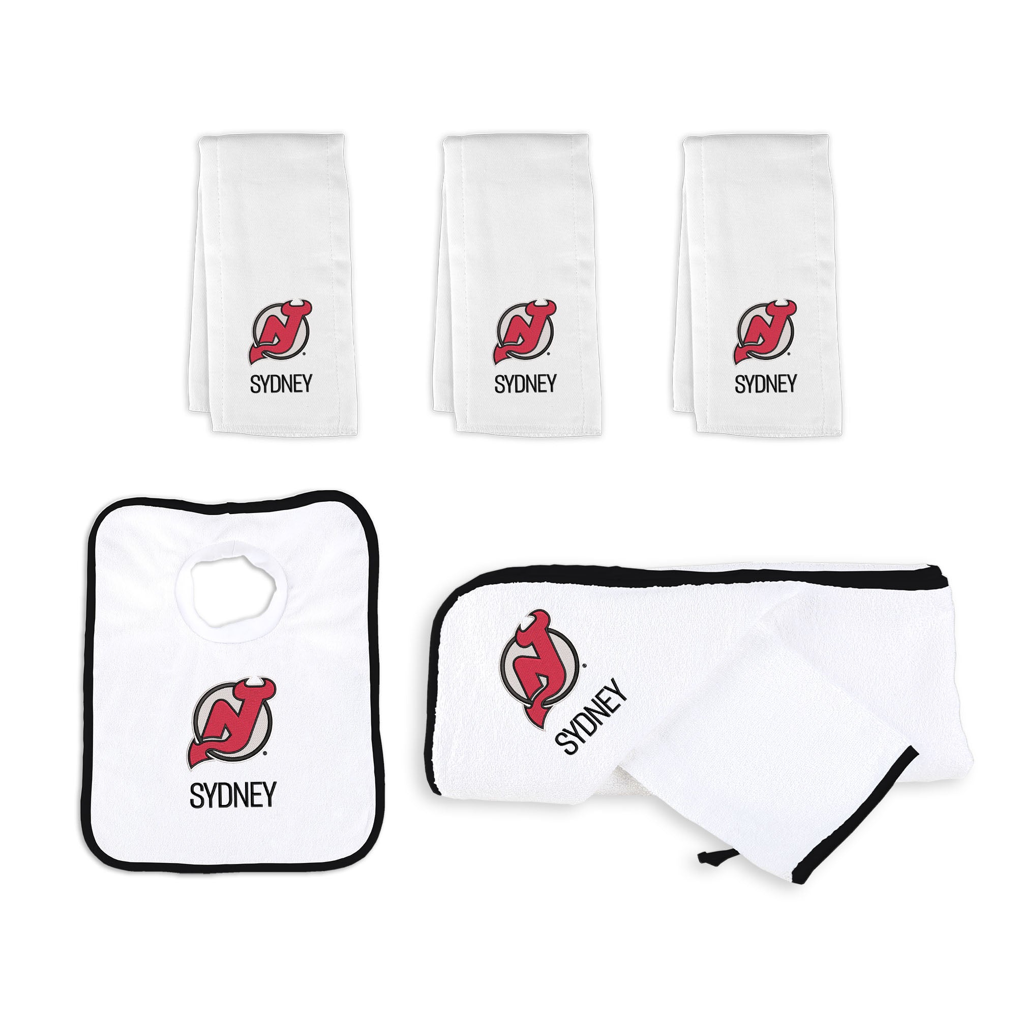 This personalized gift basket contains a trio of 100% cotton burp cloths, a 100% cotton terry pullover bib, and a 100% cotton terry hooded towel with a wash mitt. Each of these high-quality items is expertly embroidered with the iconic New Jersey Devils logo, making them the ideal choice for young Devils fans in the making.