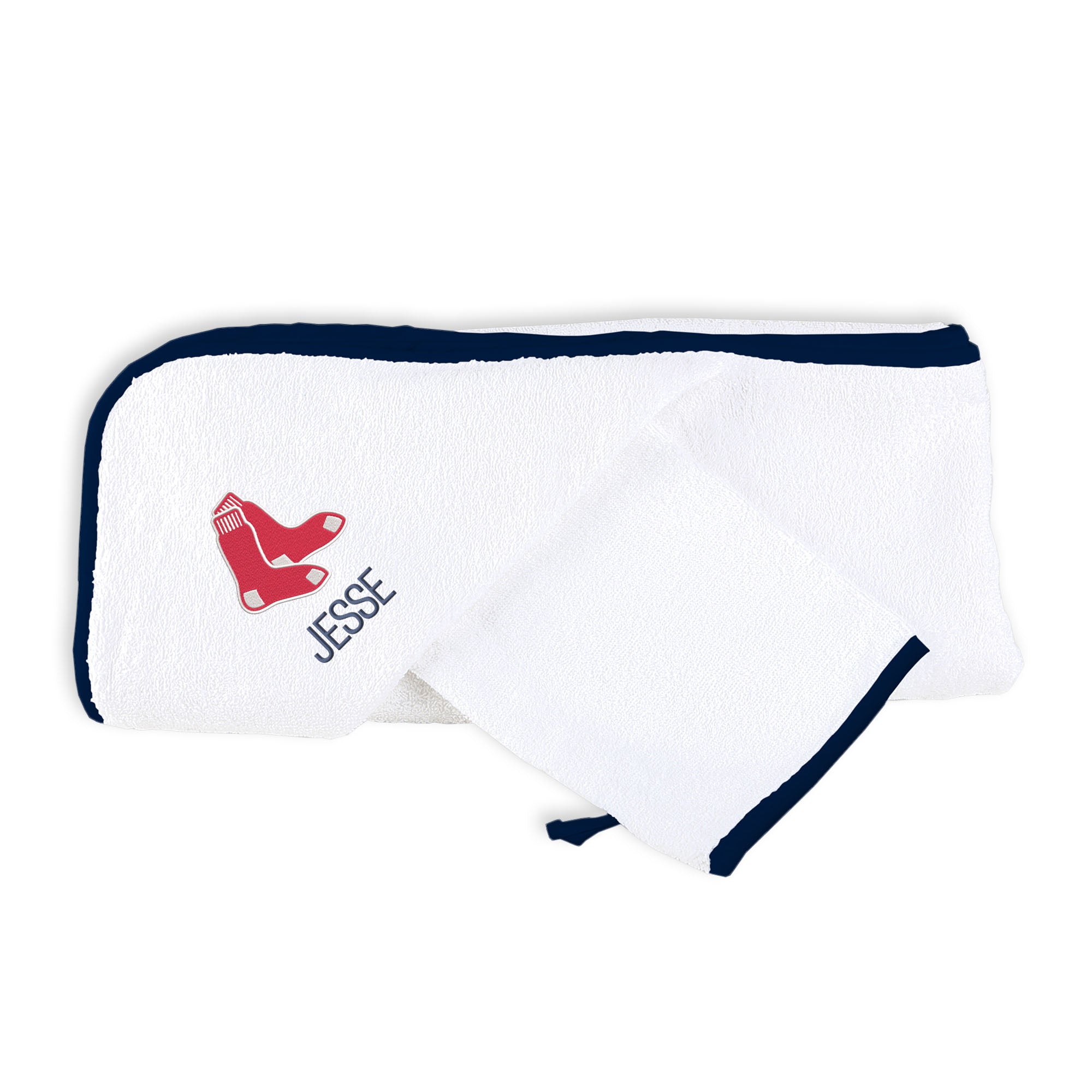 Pamper your youngest sports fan with our Officially Licensed Personalized Boston Red Sox Hooded Towel and Wash Mitt Set. Crafted from soft 100% cotton terry, the wash mitt fits over your hand for gentle sudsing and cleansing; then, wrap the baby up in the absorbent Red Sox logo'd hooded towel. The hooded corner of the towel keeps baby’s head warm while the generously sized towel wraps your future Red Sox in cozy comfort. Each towel is embroidered with the official Boston Red Sox logo and baby’s name or nickname.