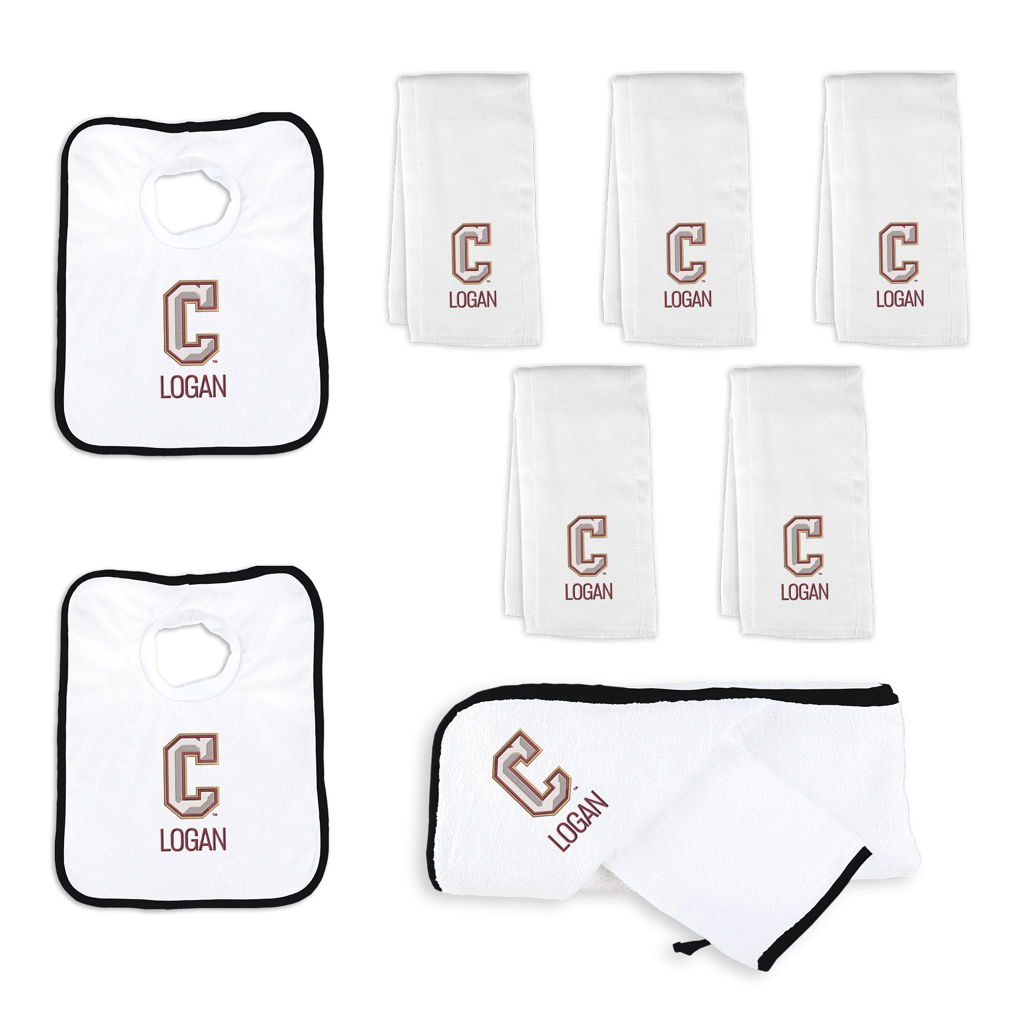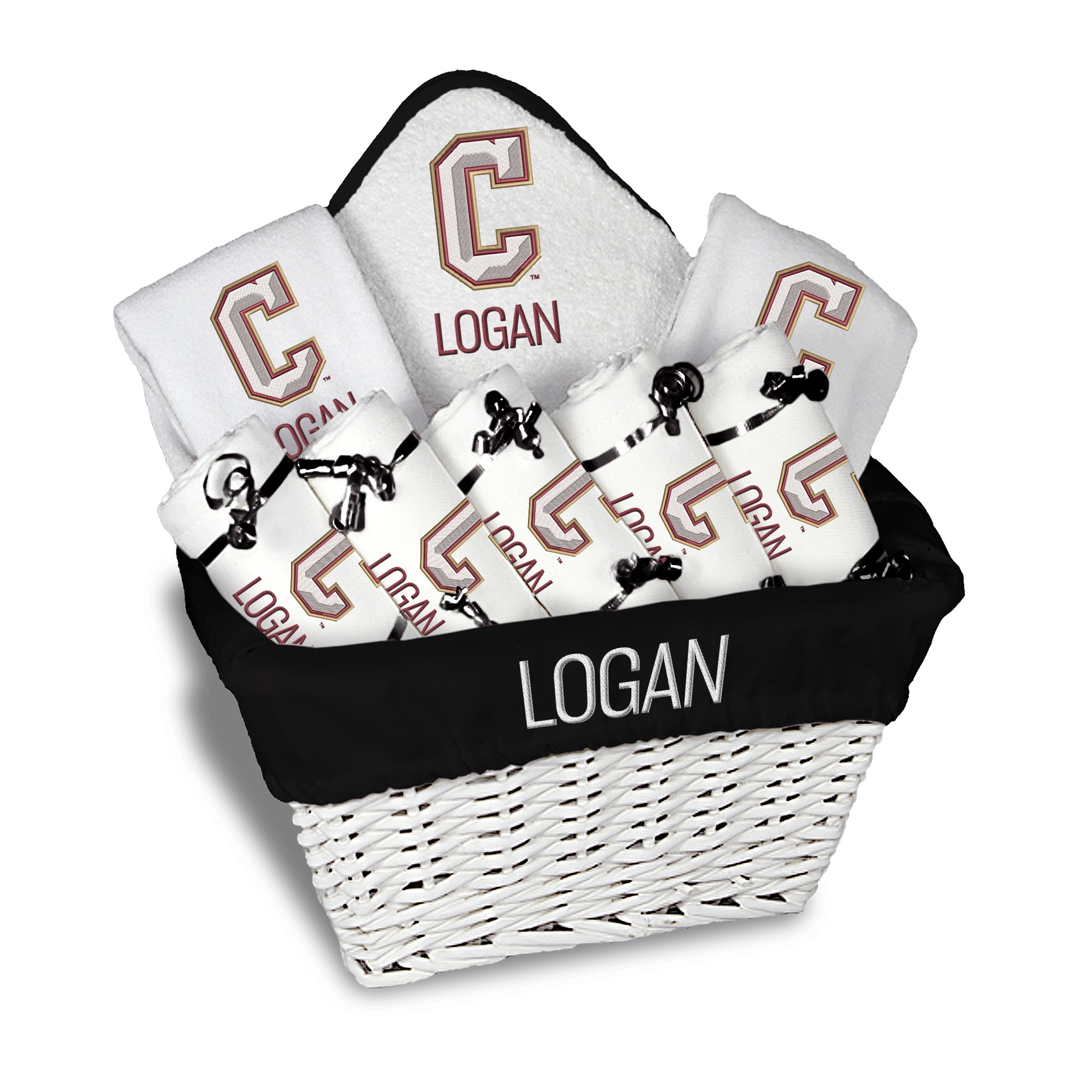 Our Personalized Charleston Cougars Large Gift Basket contains an assortment of our best-selling items packaged in a white willow basket with a personalized cotton liner.  Each basket holds five of our 100% cotton burp cloths, two 100% cotton terry pullover bibs, and one 100% cotton terry hooded towel and wash mitt. The burp cloths, bibs and hooded towel are each embroidered with the Cougars logo and baby’s name or nickname; the basket liner is embroidered with the baby’s name.
