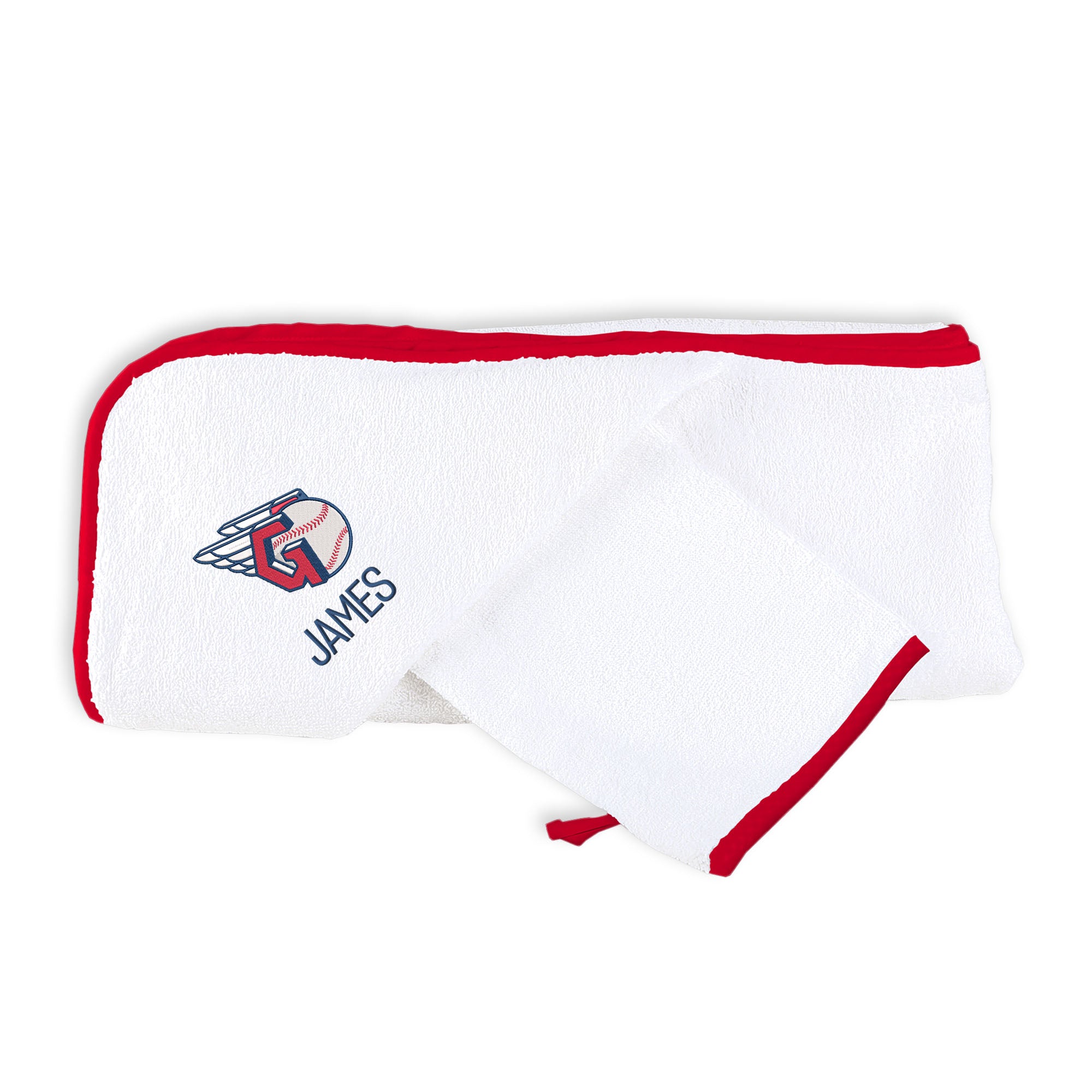 Pamper your youngest sports fan with our Officially Licensed Personalized Cleveland Guardians Hooded Towel and Wash Mitt Set. Crafted from soft 100% cotton terry, the wash mitt fits over your hand for gentle sudsing and cleansing; then, wrap the baby up in the absorbent Guardians logoed hooded towel. The hooded corner of the towel keeps baby’s head warm while the generously sized towel wraps your future Hawk in cozy comfort. Each towel is embroidered with the official Cleveland Guardians logo and baby’s name or nickname.