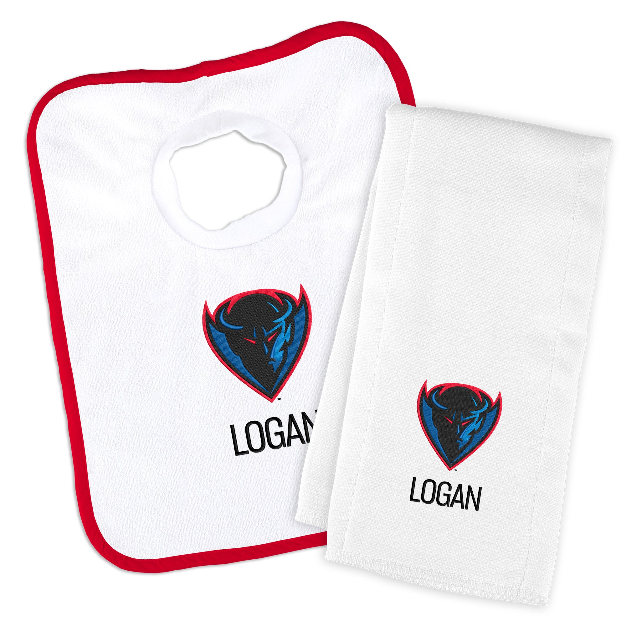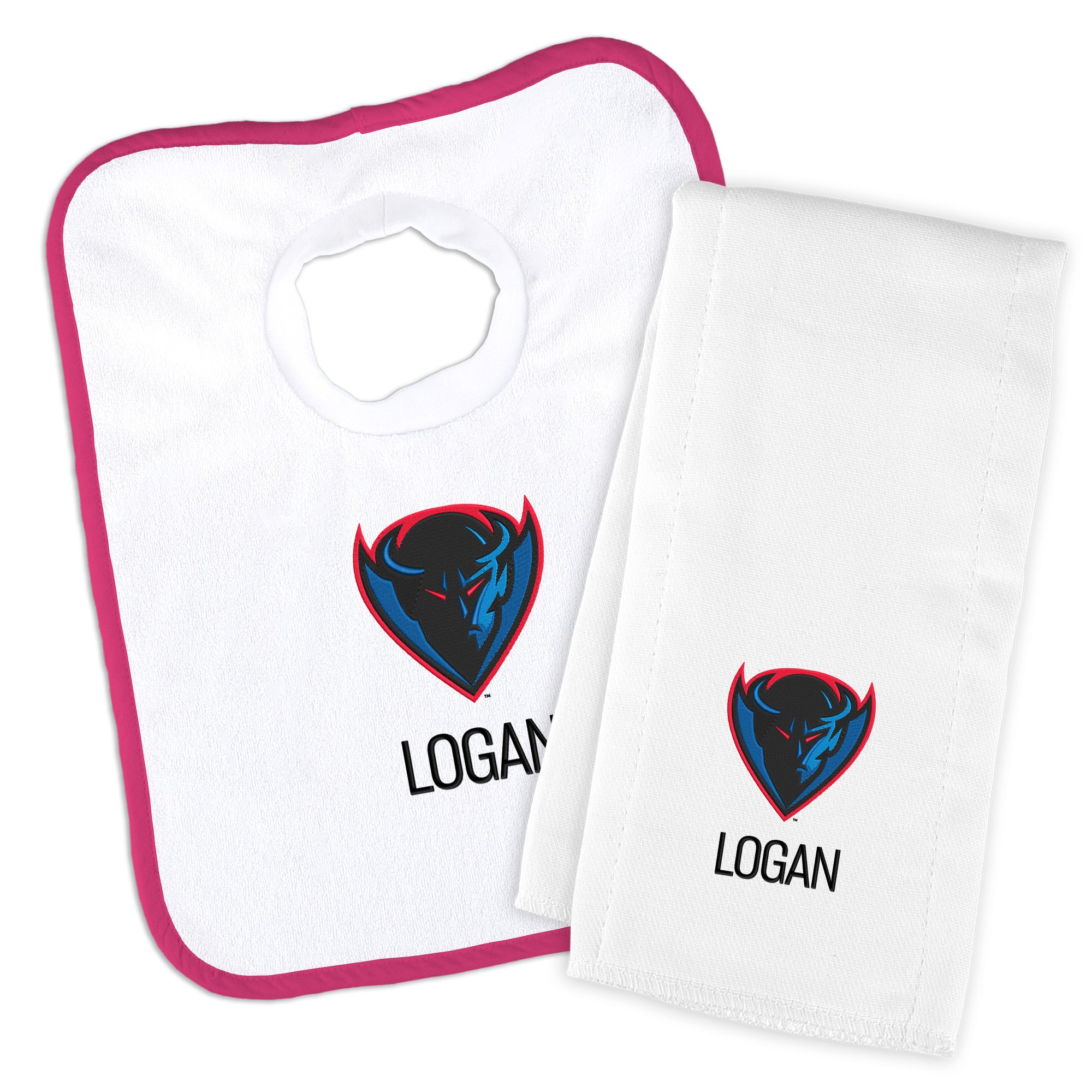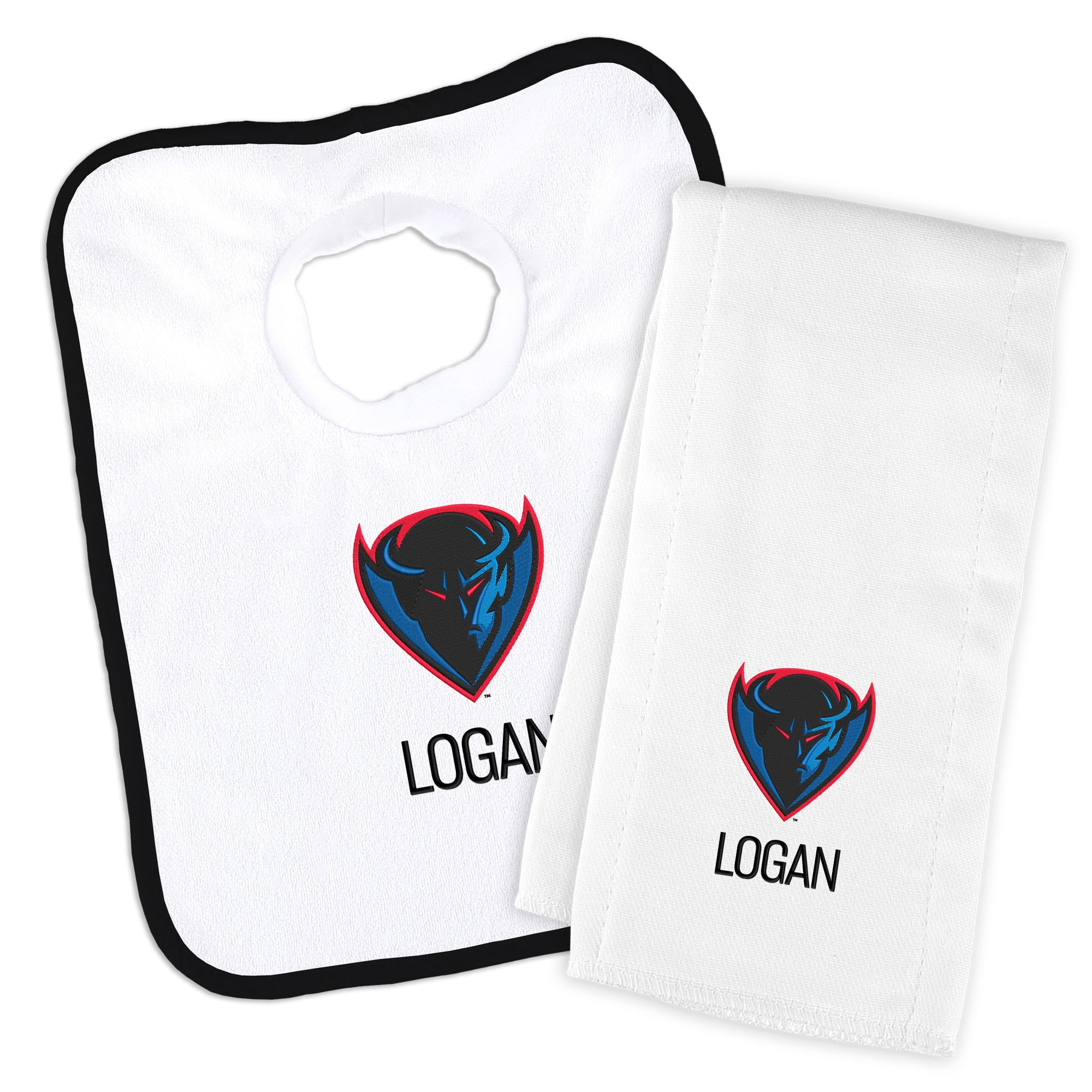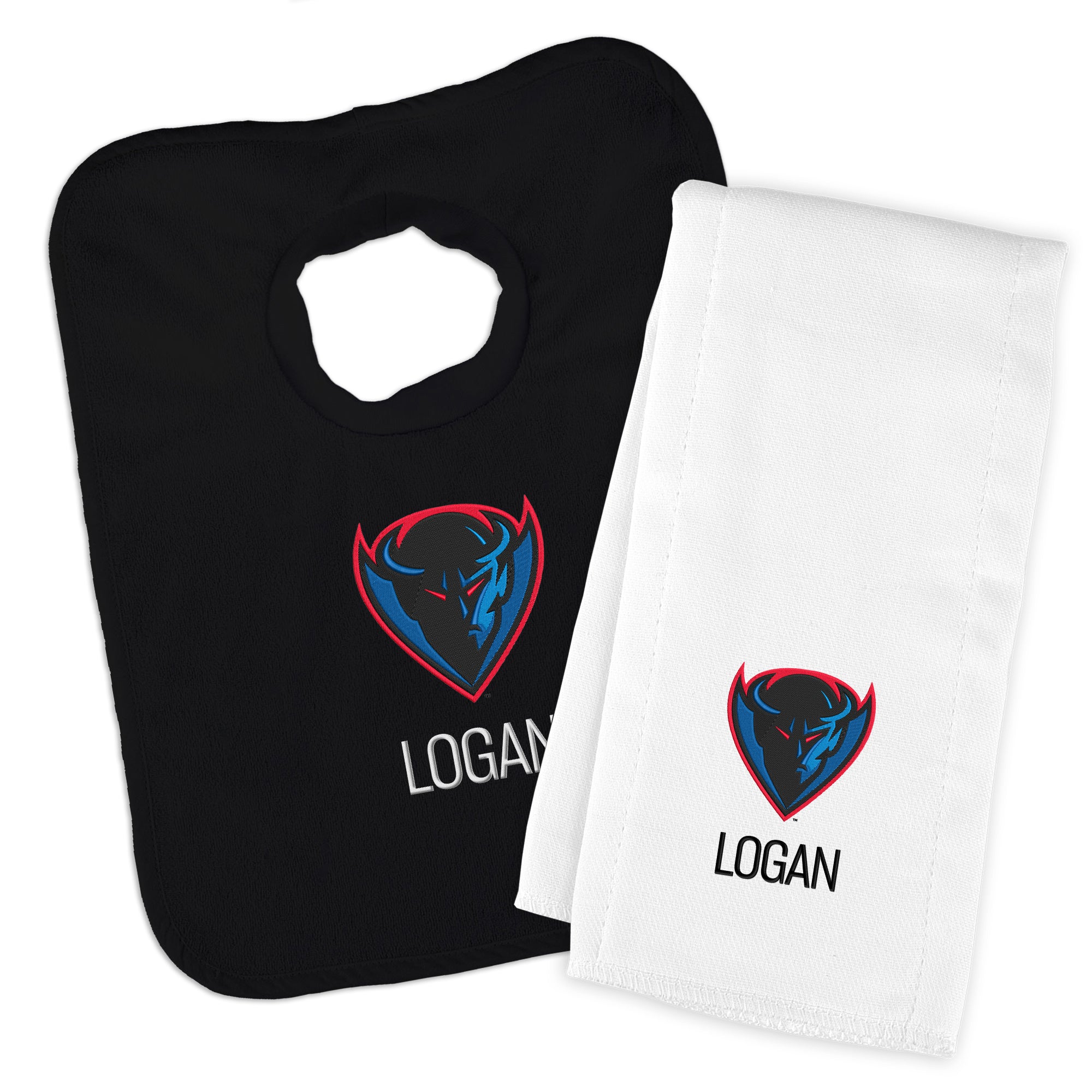 Get your little Blue Demon geared up in style with our Personalized DePaul Blue Demons Baby Bib and Burp Cloth Set. This set is the ultimate game day essential for your little fan! The pullover-style bib, crafted from stretch terry cloth, ensures a snug fit with its stretchable neck hole, while the burp cloth, made from 100% cotton, offers optimal absorption. Both items are officially licensed, featuring the iconic Blue Demons logo, making them the perfect addition to your baby's fan gear collection. Personalize the set with your baby's name for an extra special touch. Whether it's game day or everyday use, this set combines comfort, functionality, and team spirit seamlessly. Order the Personalized DePaul Blue Demons Baby Bib and Burp Cloth Set today and let your little one flaunt their team pride in style!