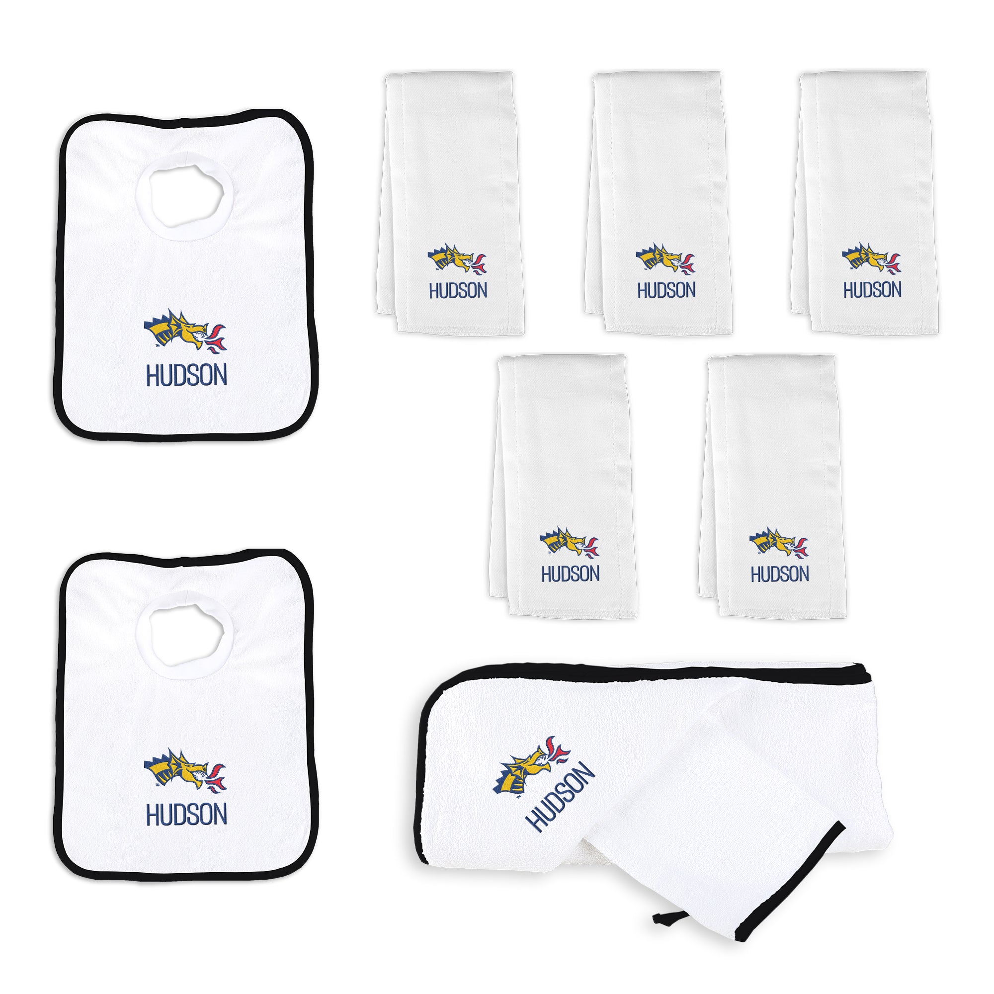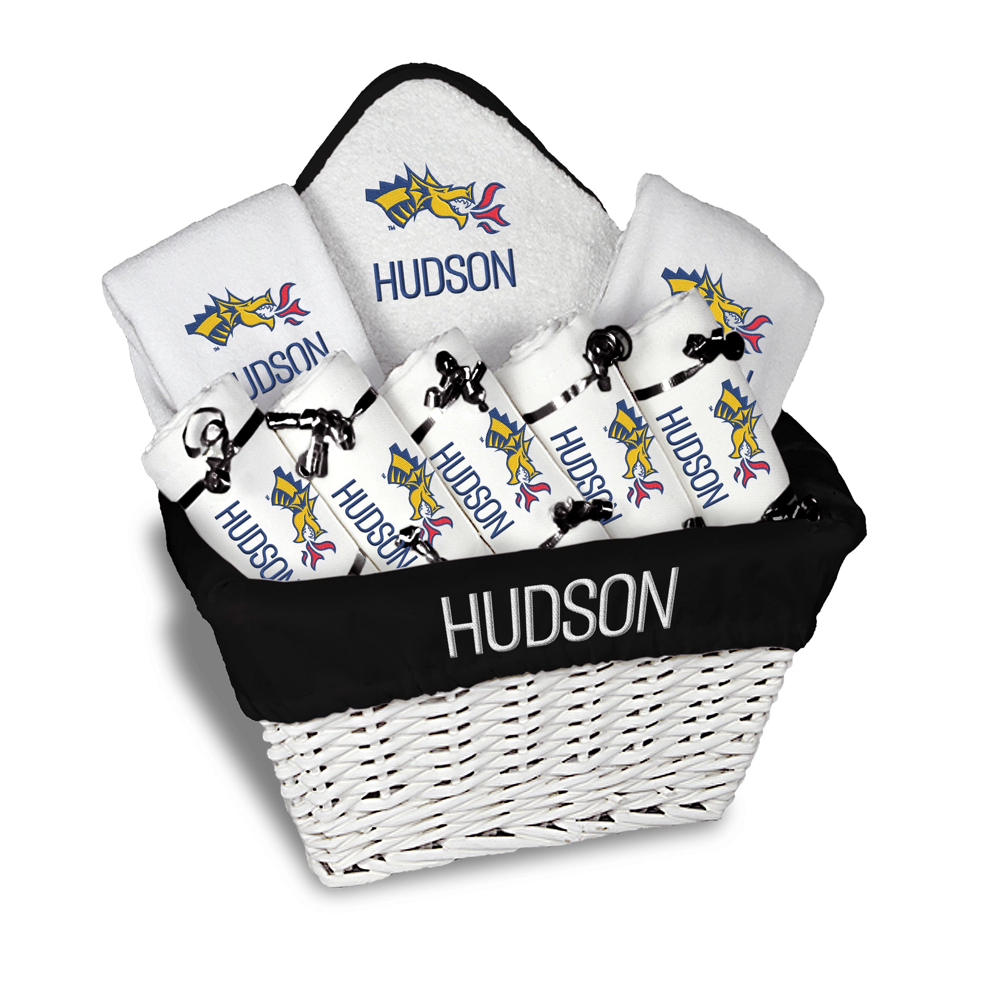 Our Personalized Drexel Dragons Large Gift Basket contains an assortment of our best-selling items packaged in a white willow basket with a personalized cotton liner. Each basket holds five of our 100% cotton burp cloths, two 100% cotton terry pullover bibs, and one 100% cotton terry hooded towel and wash mitt. The burp cloths, bibs and hooded towel are each embroidered with the Dragons logo and baby’s name or nickname; the basket liner is embroidered with the baby’s name.